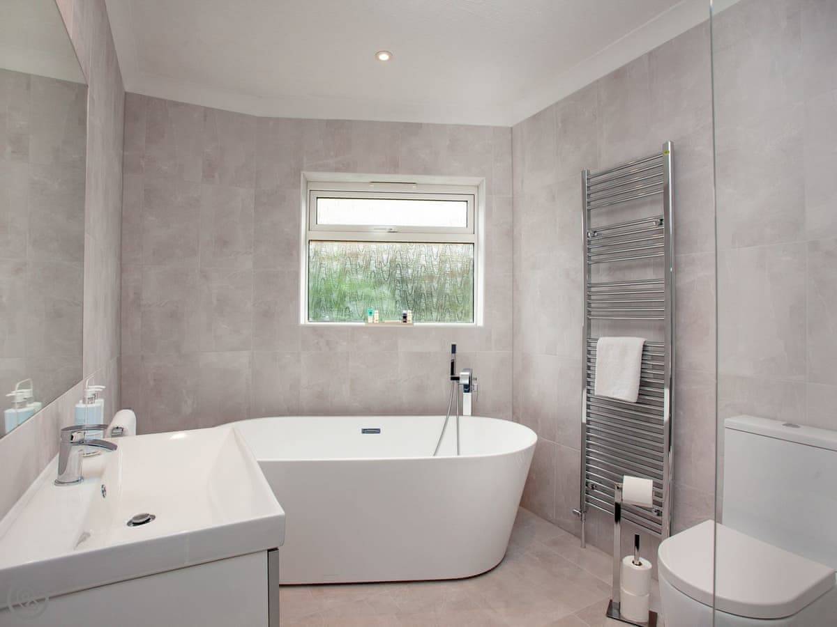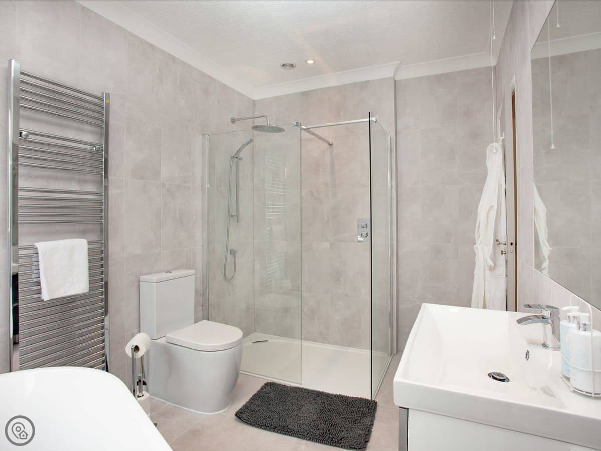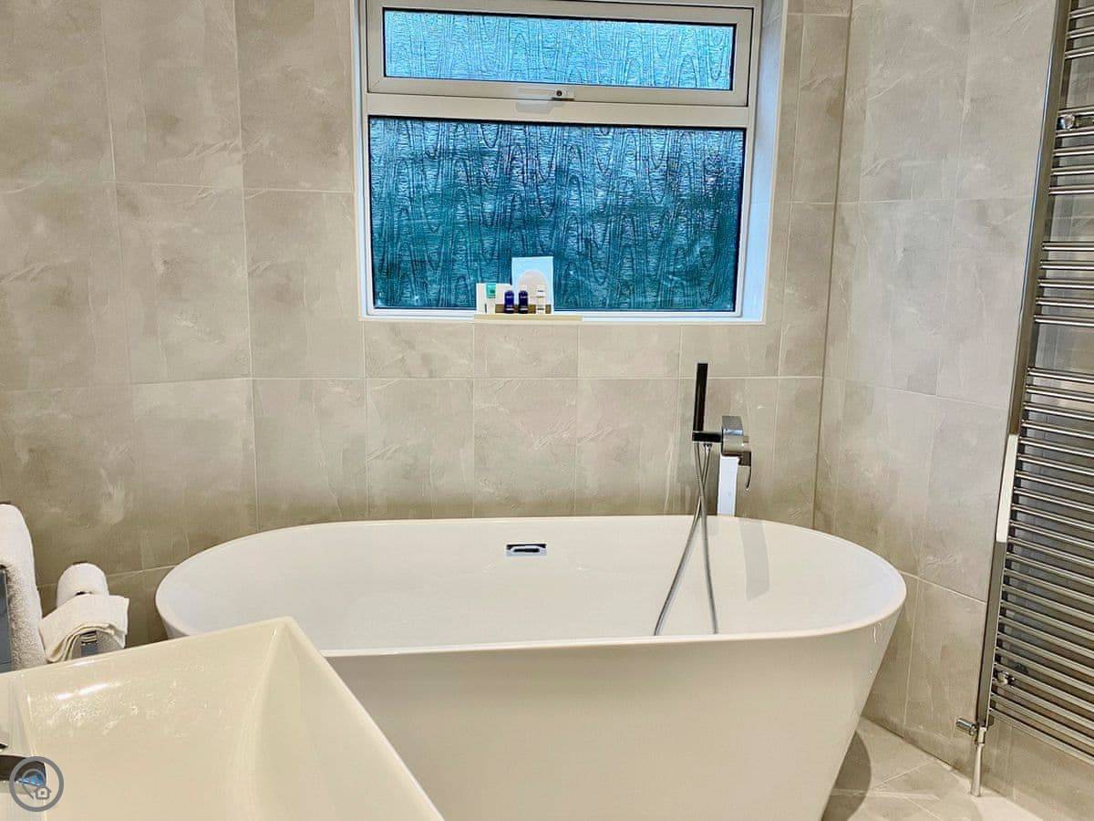 A peaceful space to sit, elevated above the treeline where you can enjoy the view whilst enjoying your morning coffee or an evening tipple with the setting sun. The path winds down through the garden and a gate leads you into the woodland, to enjoy gorgeous morning/afternoon strolls through the trees to relax and rejuvenate. The bedroom boasts a queen-sized bed and fitted wardrobes. The modern, ensuite bathroom benefits from a freestanding bath as well as a separate shower cubicle.