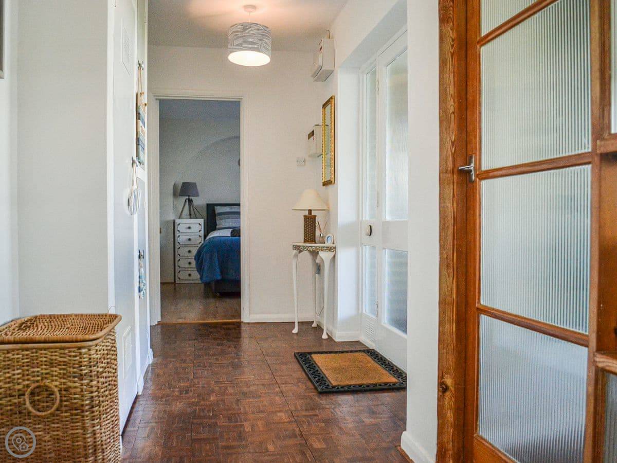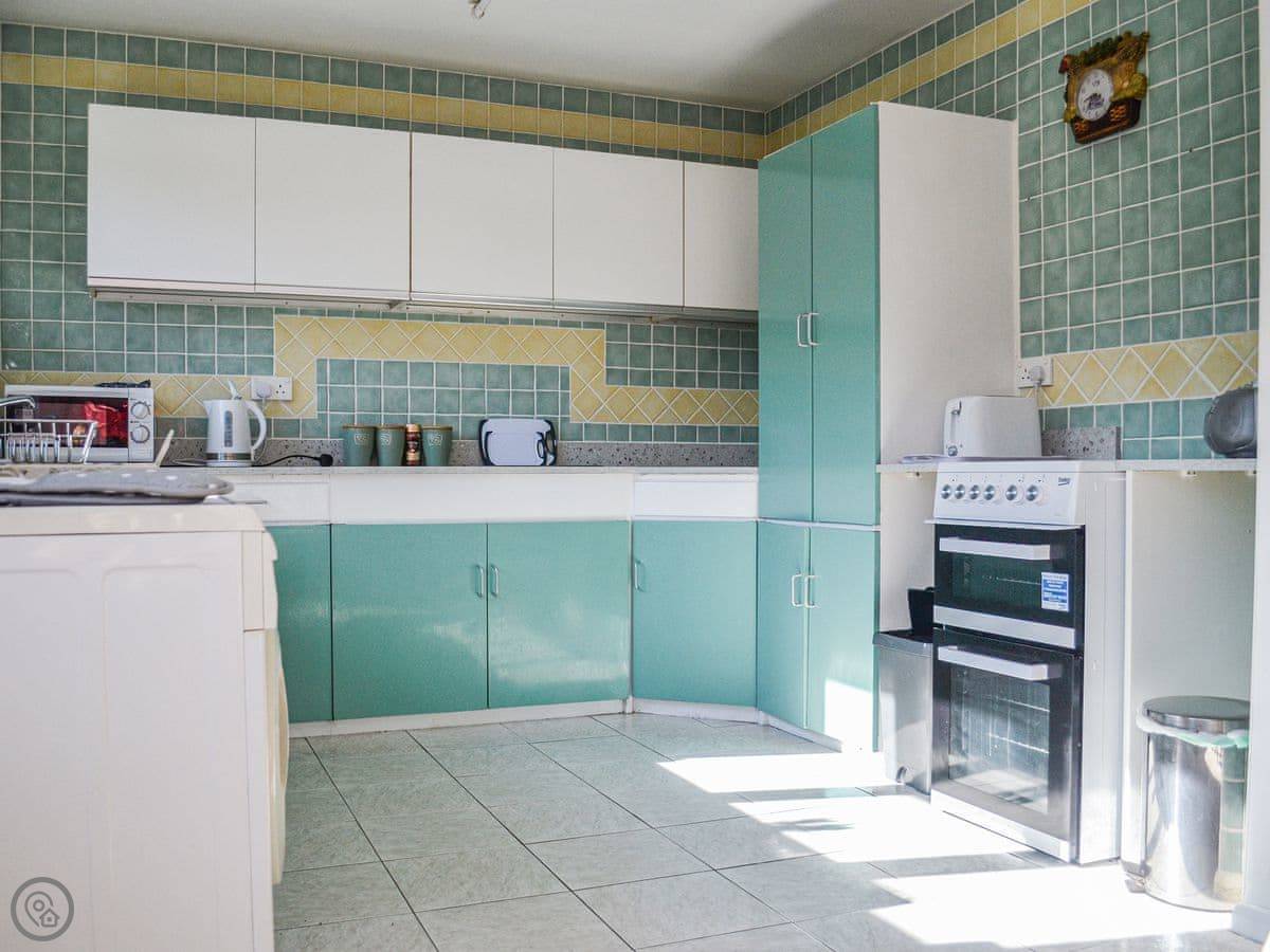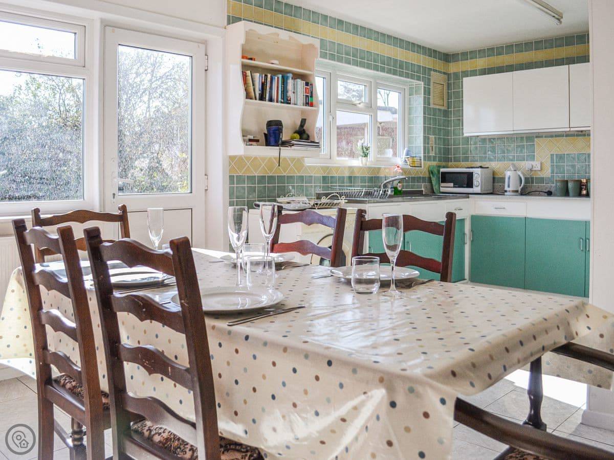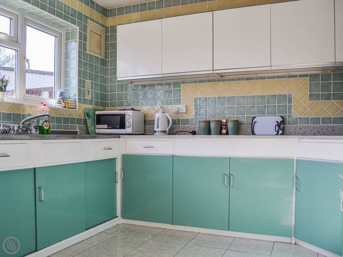 Inside, it's all on one floor. The kitchen looks out over the garden. There's a washing machine, WiFi, and a TV. Bedding and towels are included.