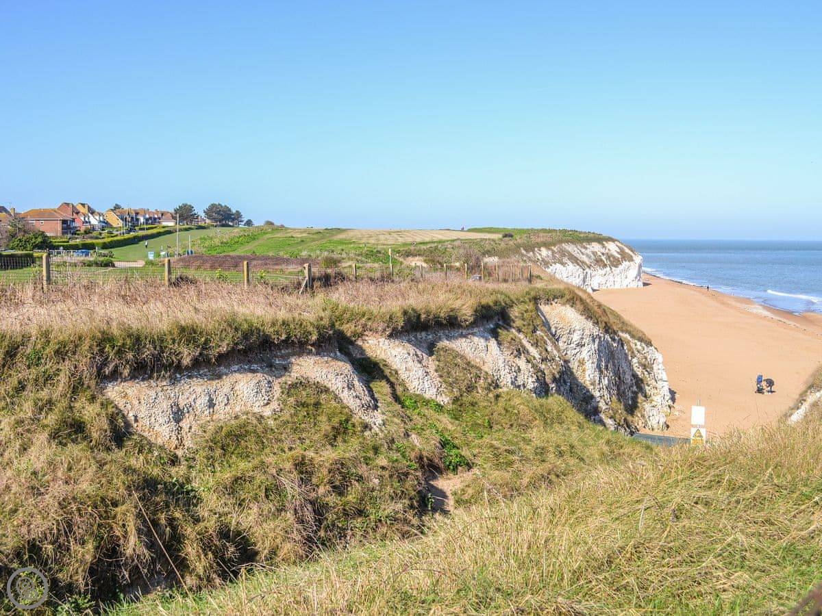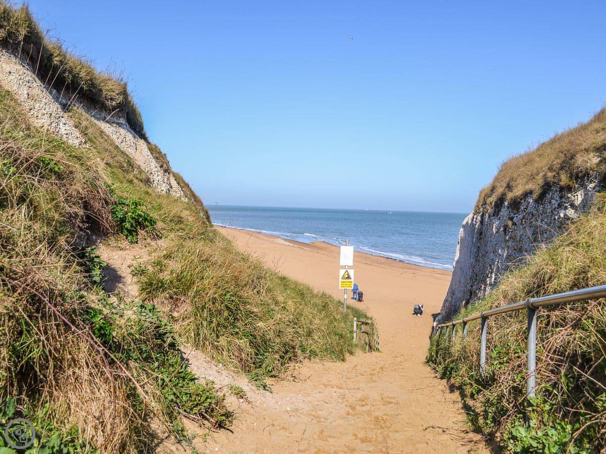 The walk down to Botany Bay beach takes about five minutes. It's a good, sandy beach. You can also walk along the cliff path, the Viking Coastal Trail, into Broadstairs one way or Margate the other. That's a longer walk, maybe 45 minutes to an hour. By car, it's about ten minutes to either.