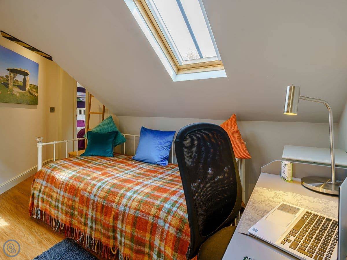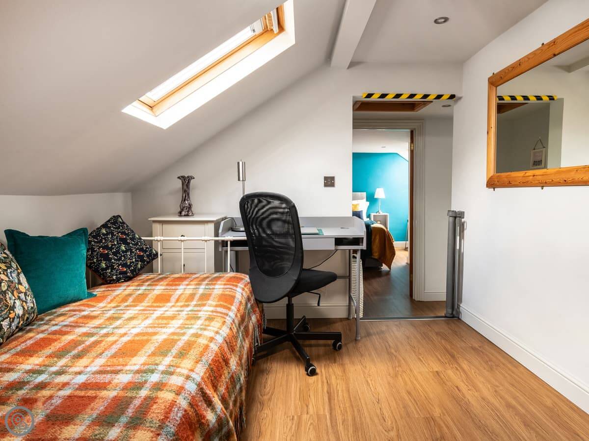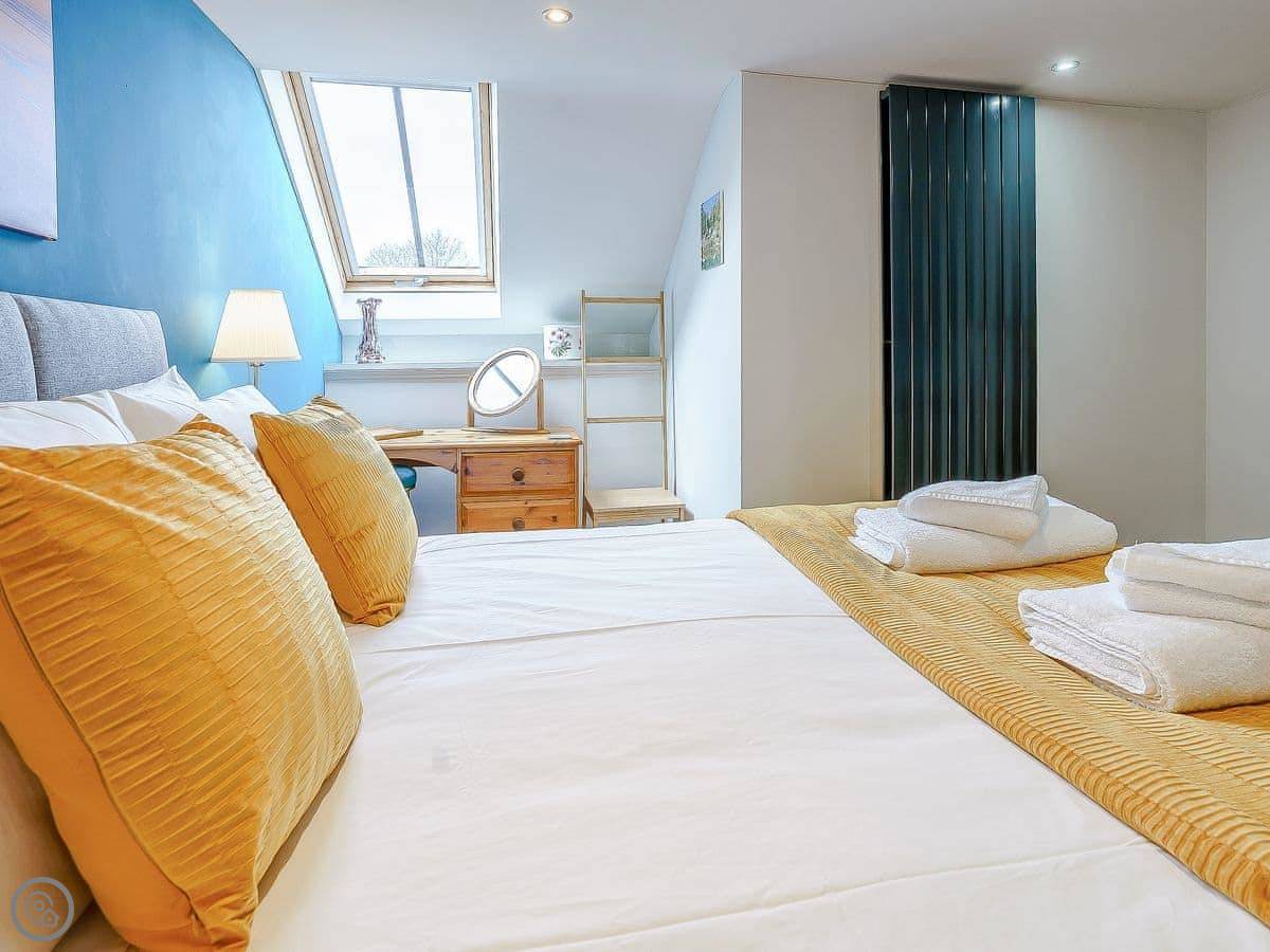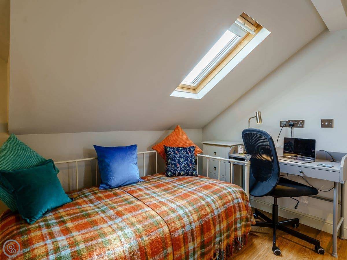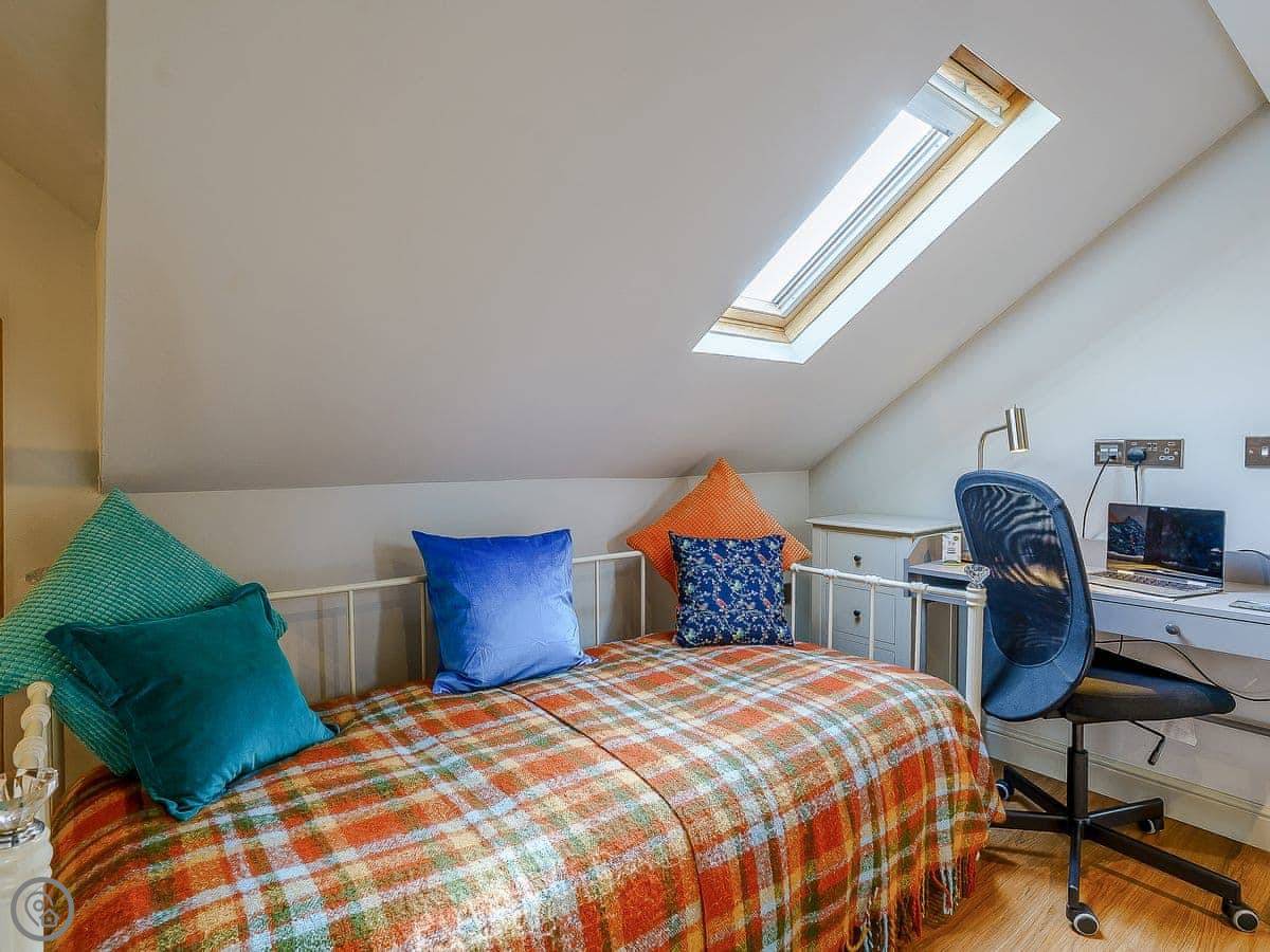 It sleeps five, in two bedrooms, with an extra single bed on the large landing. That landing area has a desk and can be used as a bit of a den. There's one bathroom upstairs with a bath and a separate shower. The rating is 4 Star, so it's comfortable and well-finished.