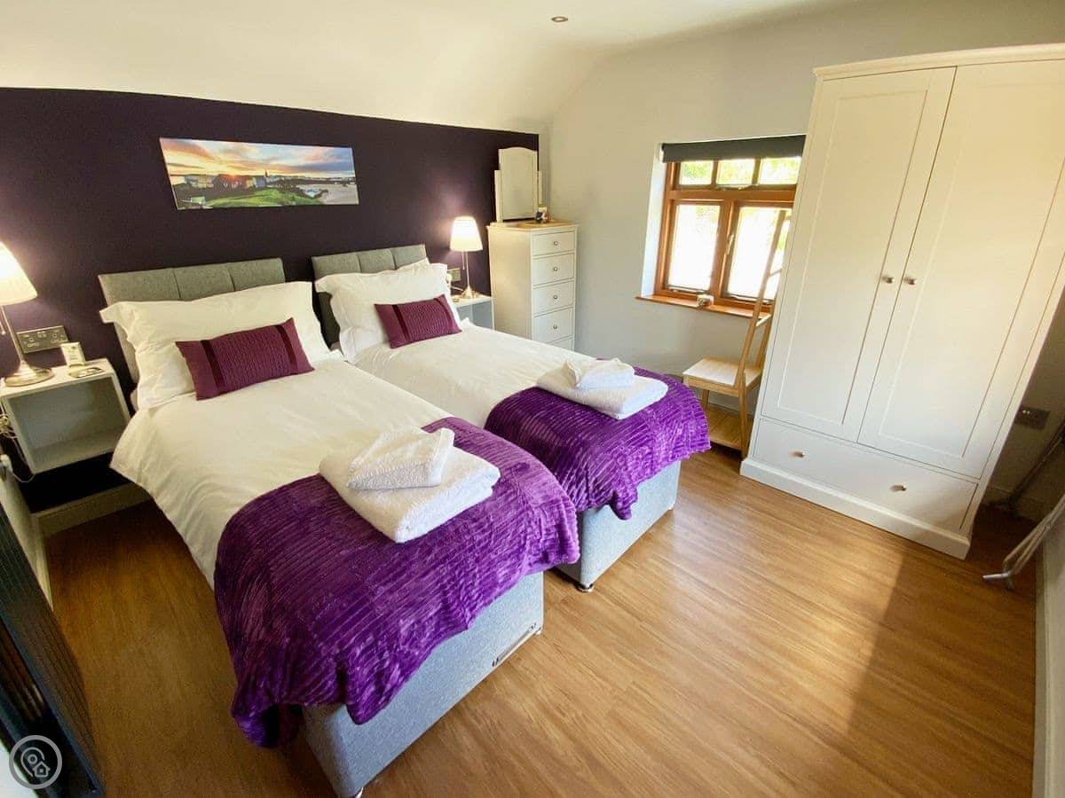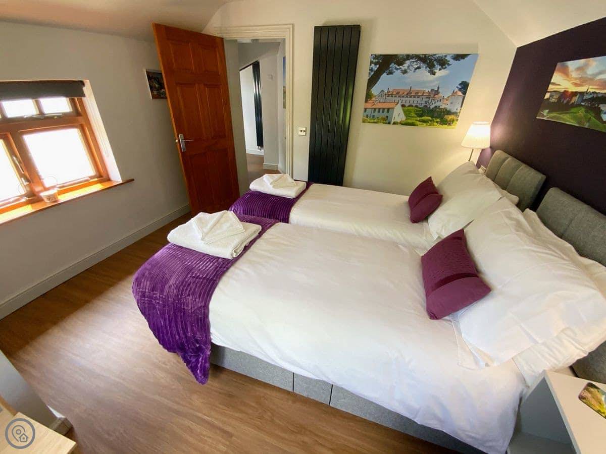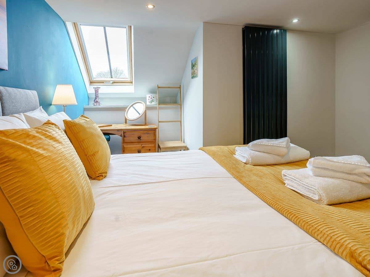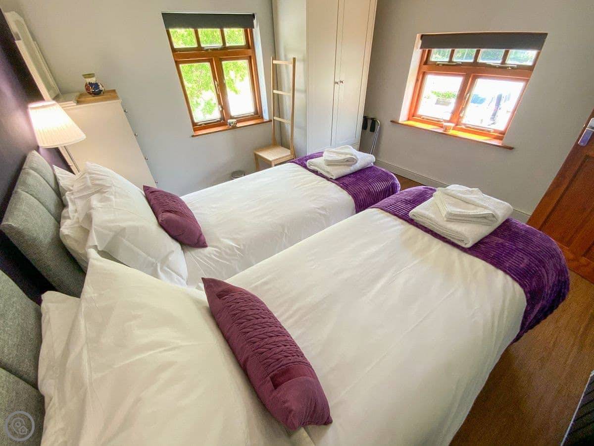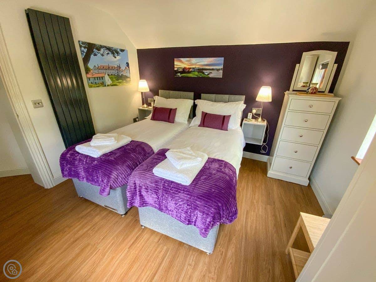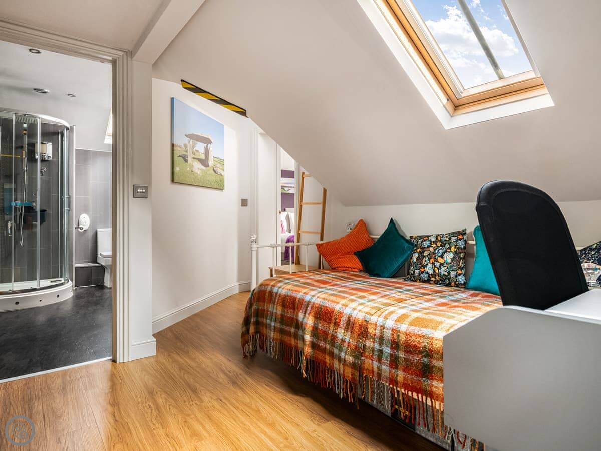 It sleeps five, in two bedrooms, with an extra single bed on the large landing. That landing area has a desk and can be used as a bit of a den. There's one bathroom upstairs with a bath and a separate shower. The rating is 4 Star, so it's comfortable and well-finished.