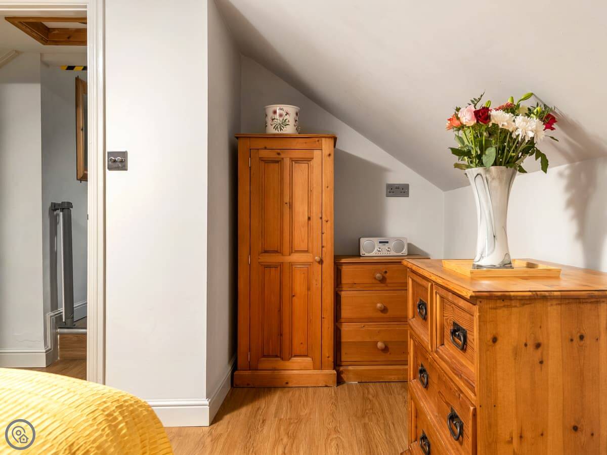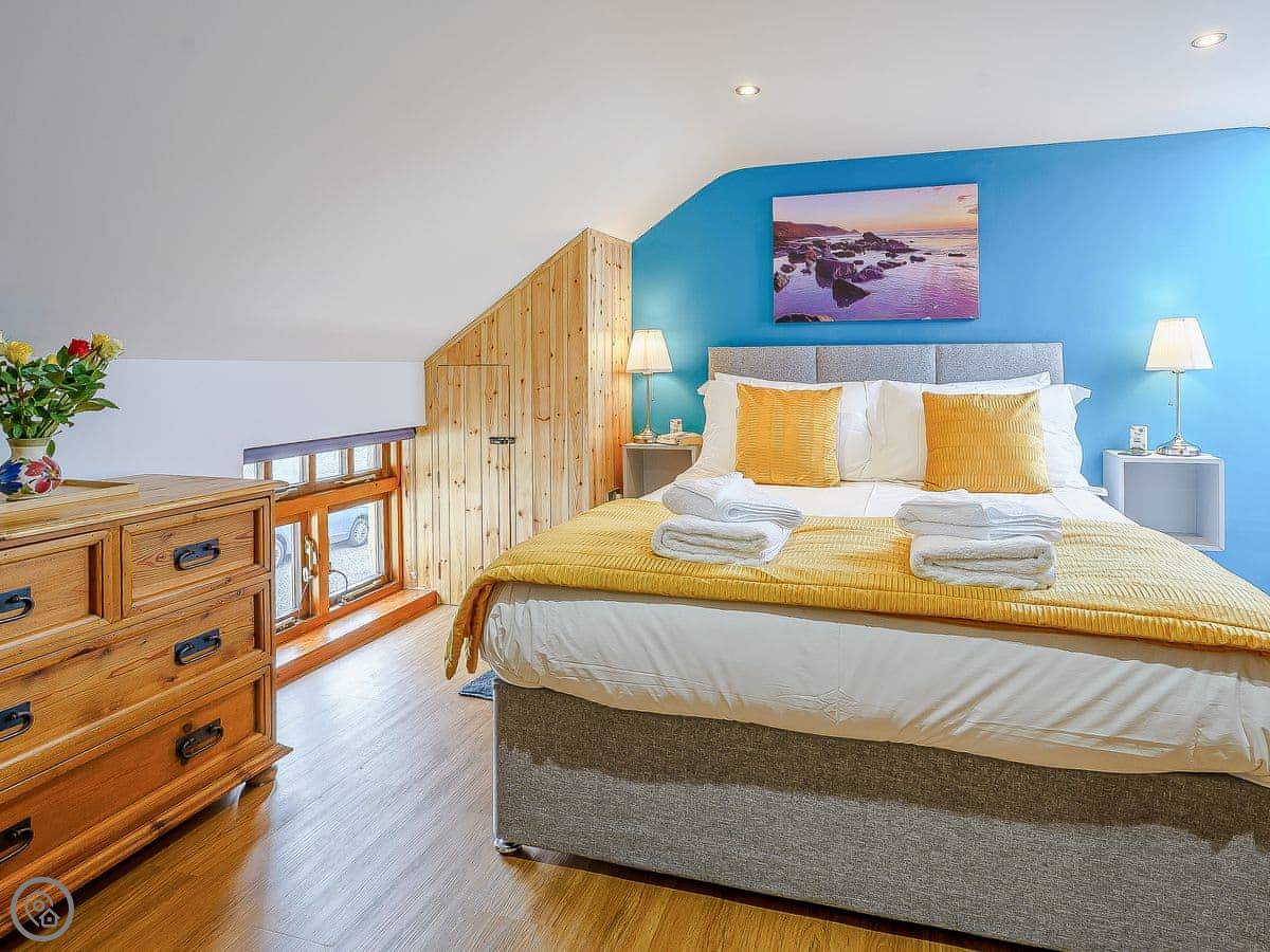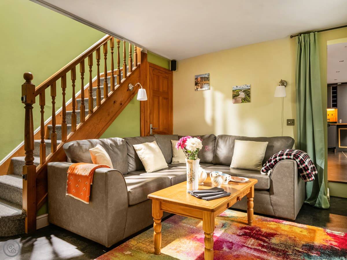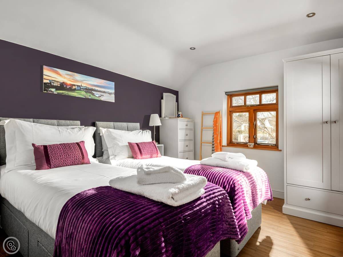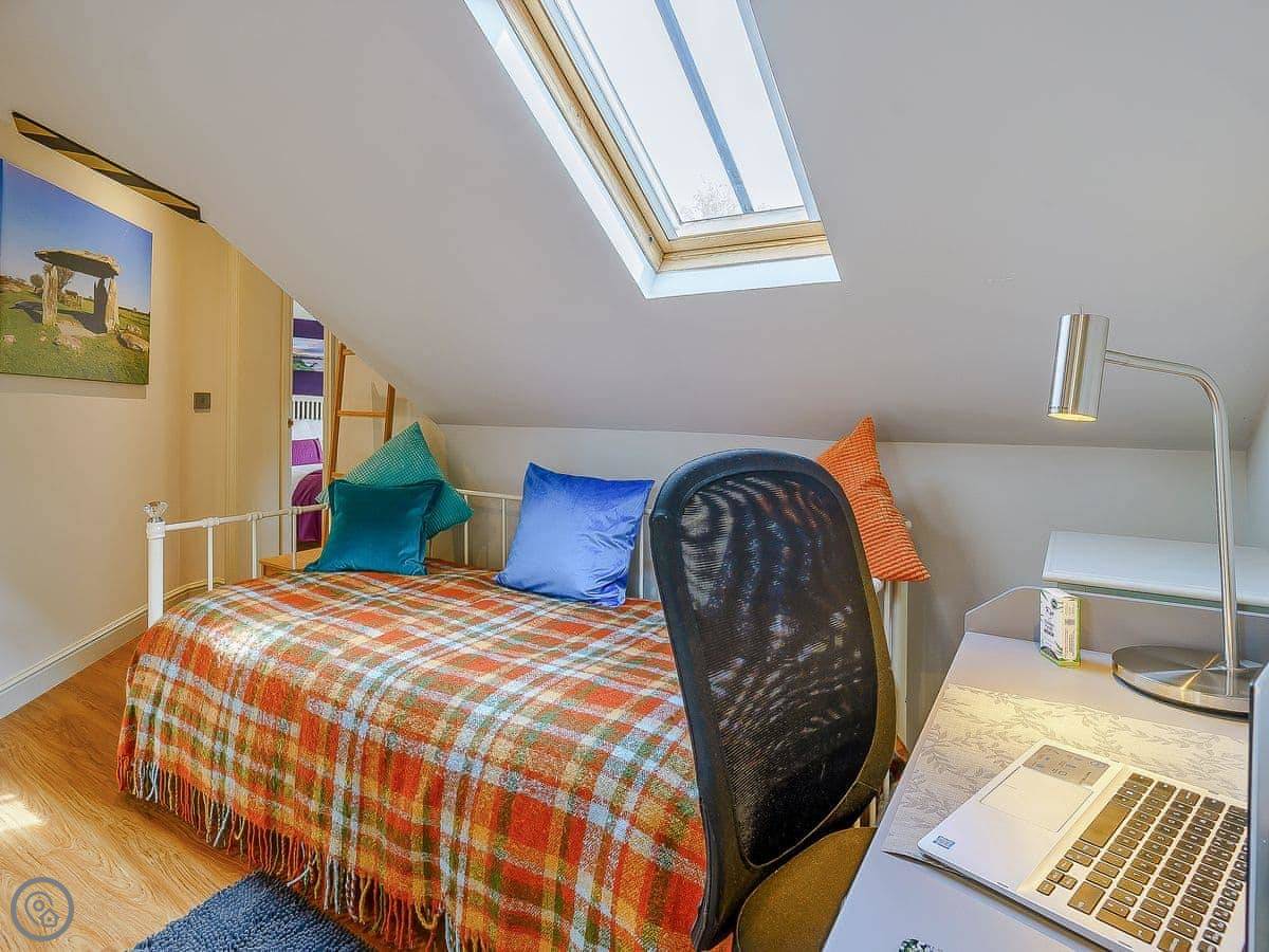 It sleeps five, in two bedrooms, with an extra single bed on the large landing. That landing area has a desk and can be used as a bit of a den. There's one bathroom upstairs with a bath and a separate shower. The rating is 4 Star, so it's comfortable and well-finished.