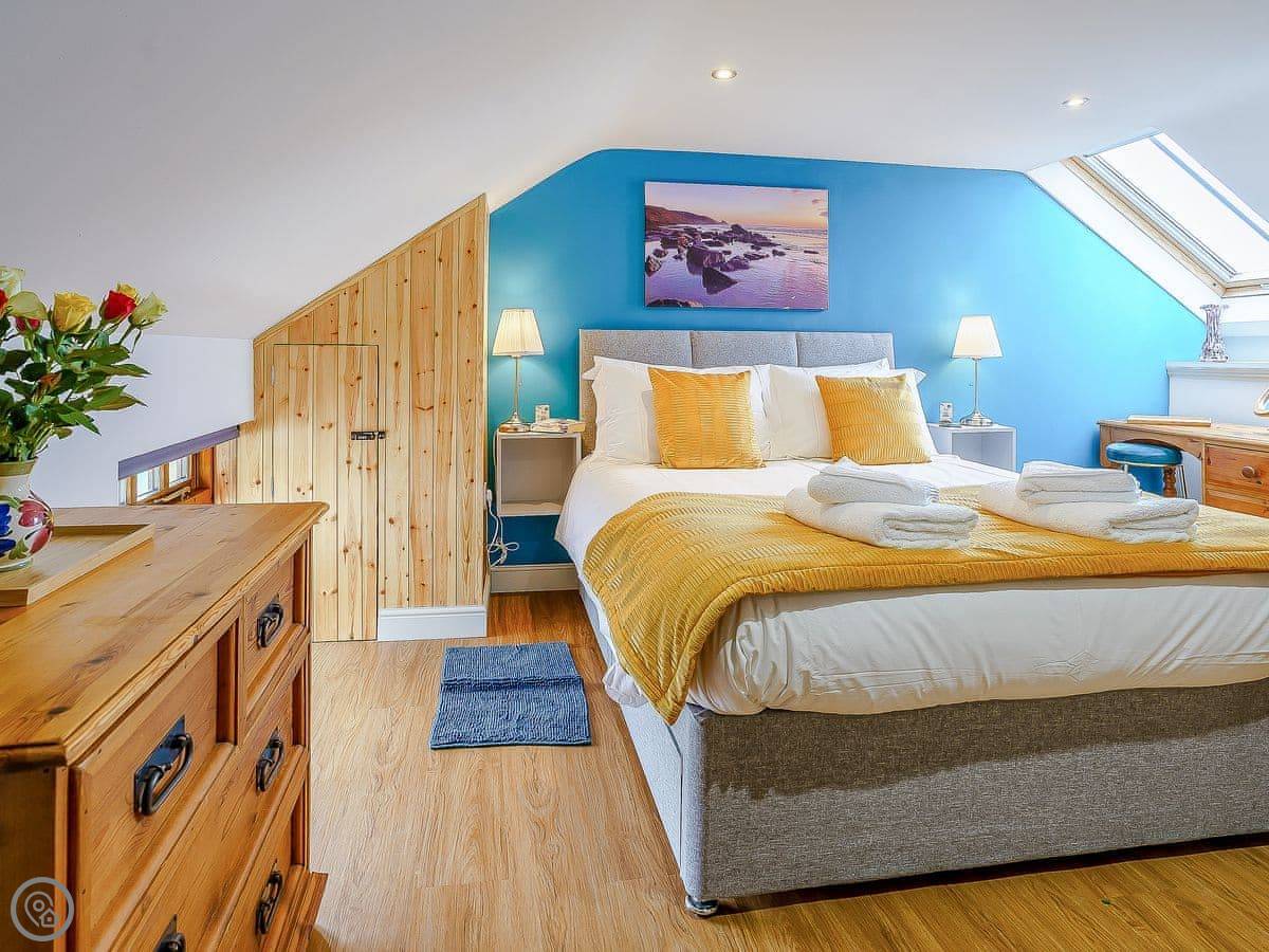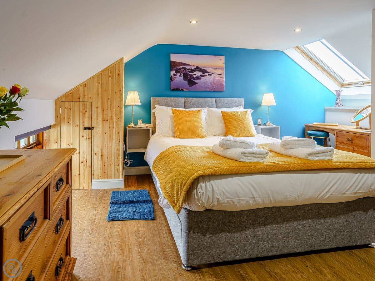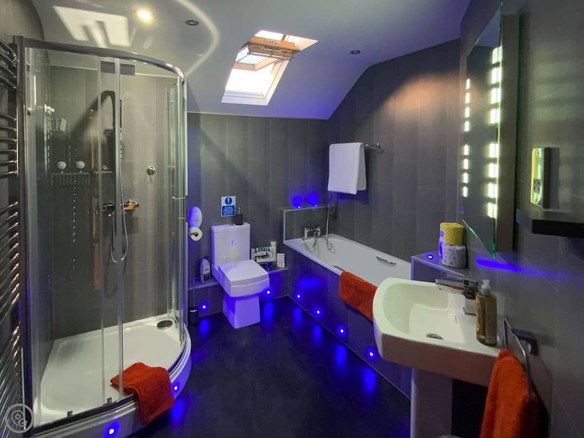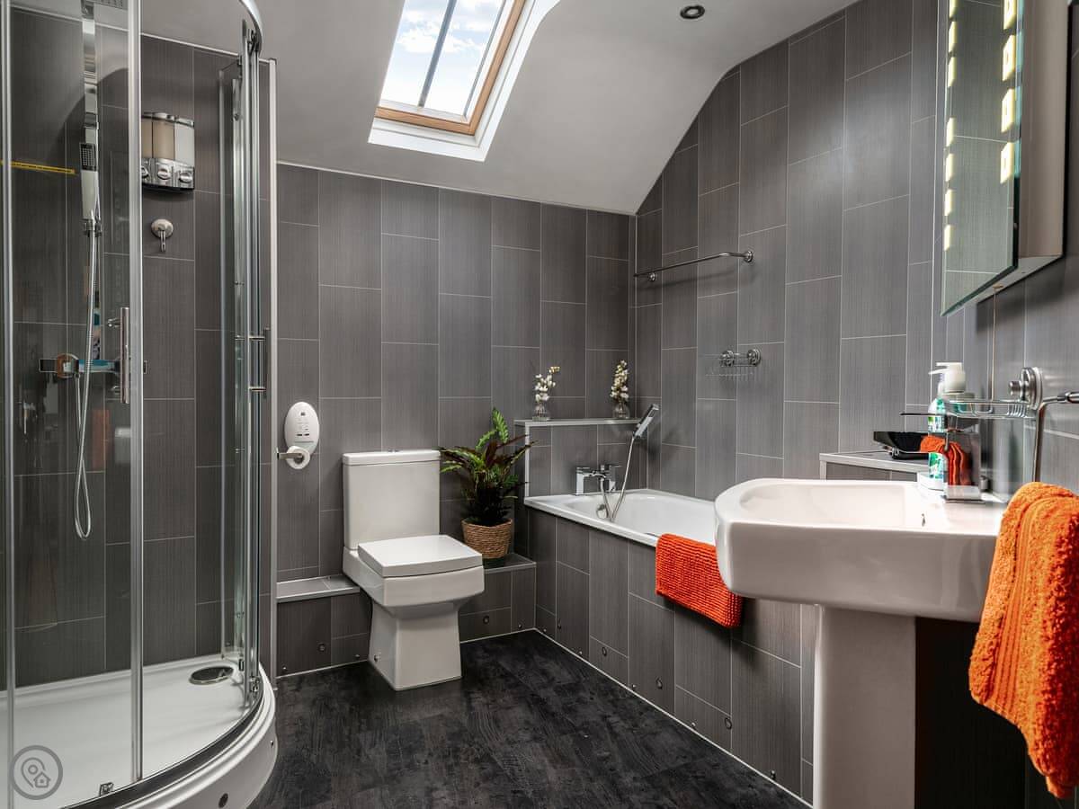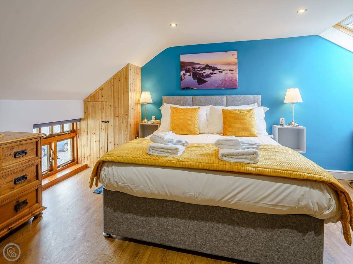 It sleeps five, in two bedrooms, with an extra single bed on the large landing. That landing area has a desk and can be used as a bit of a den. There's one bathroom upstairs with a bath and a separate shower. The rating is 4 Star, so it's comfortable and well-finished.
