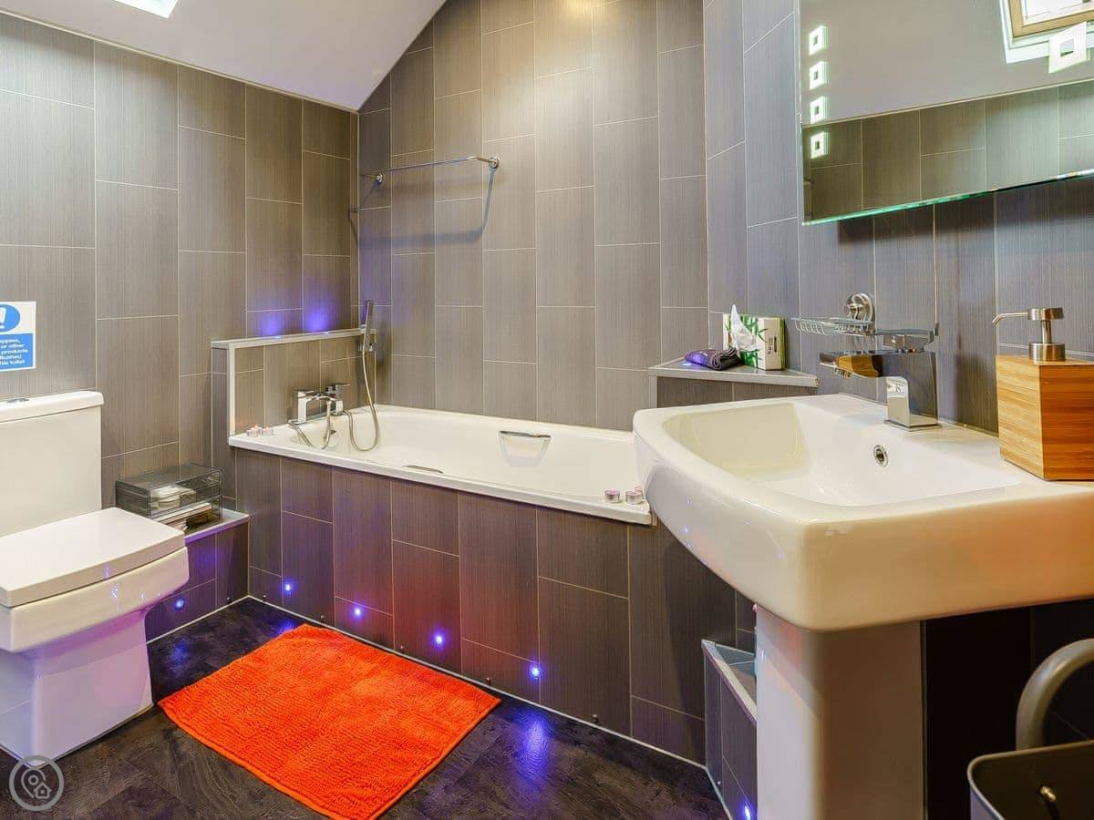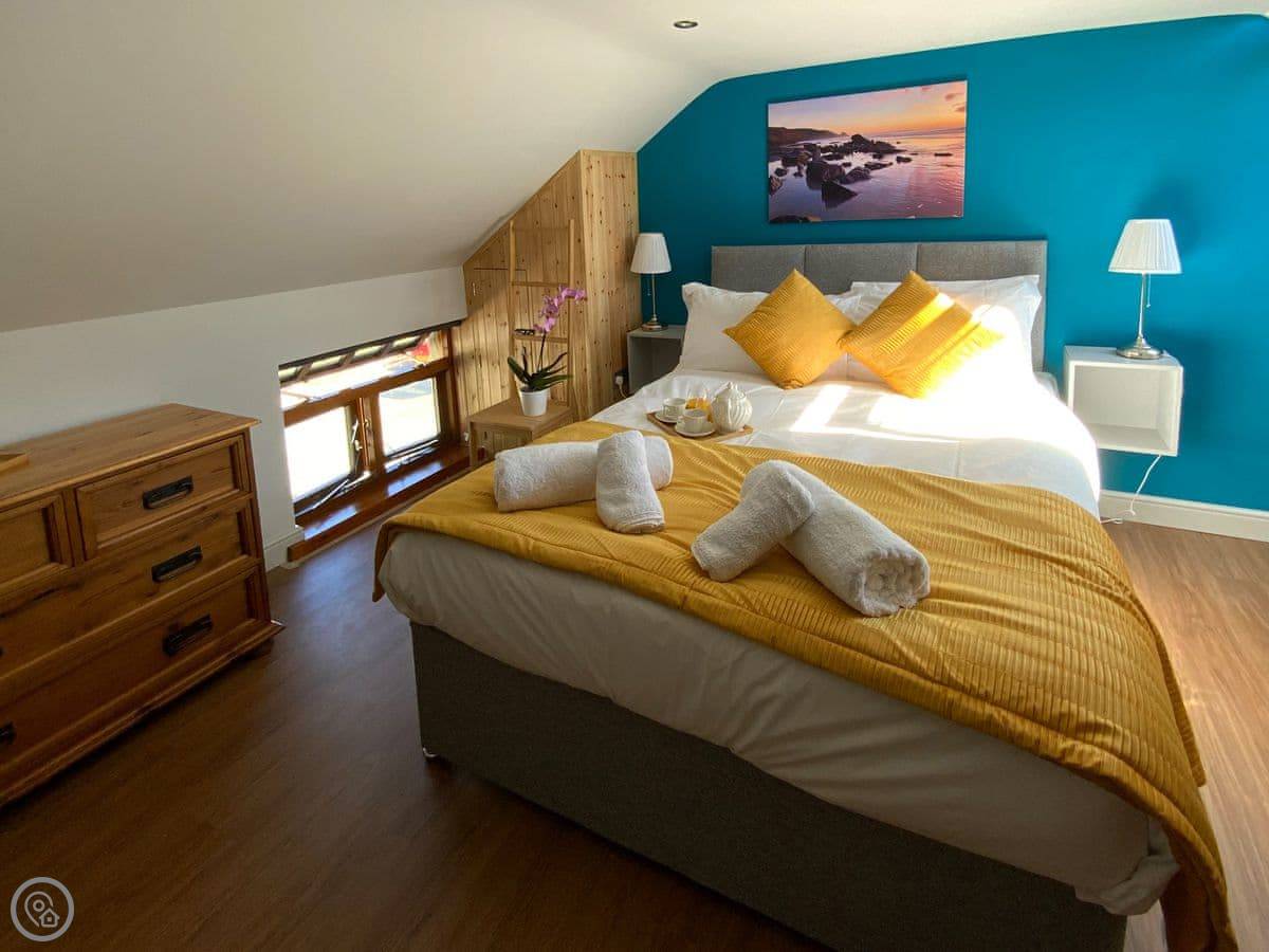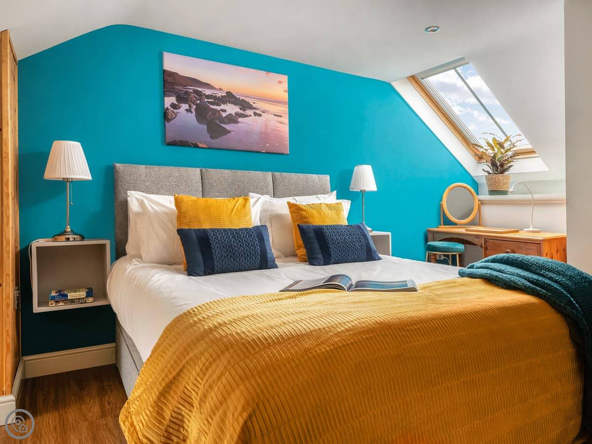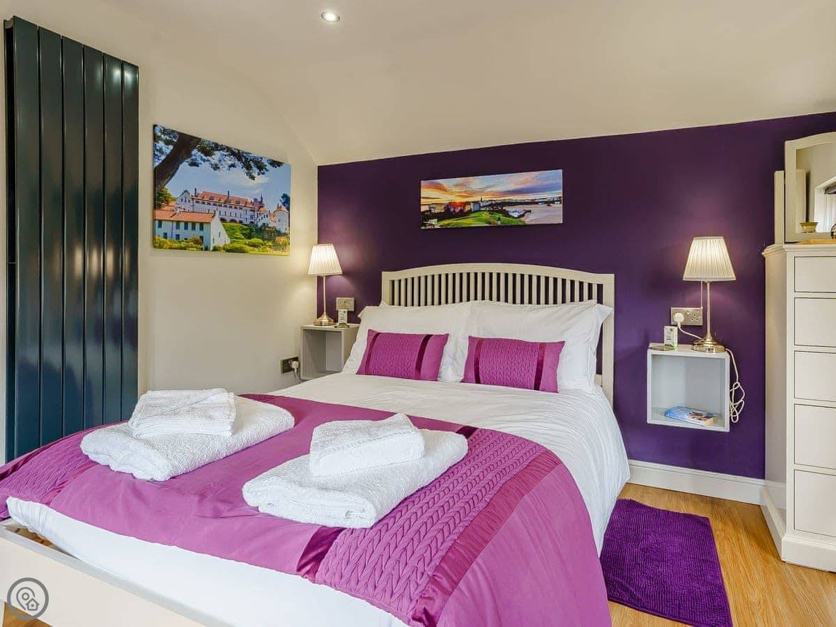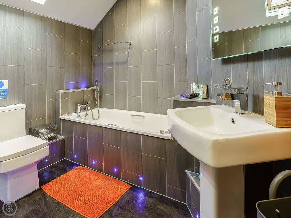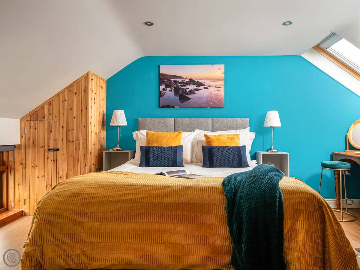It sleeps five, in two bedrooms, with an extra single bed on the large landing. That landing area has a desk and can be used as a bit of a den. There's one bathroom upstairs with a bath and a separate shower. The rating is 4 Star, so it's comfortable and well-finished.