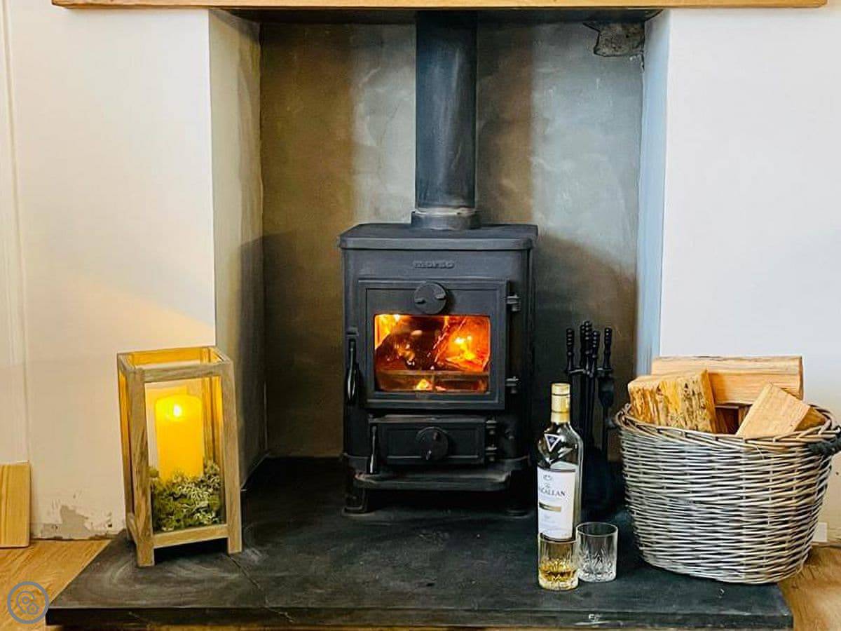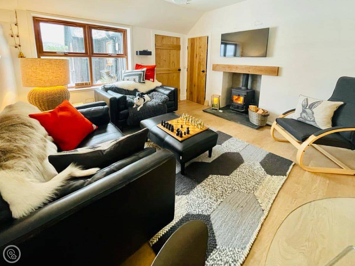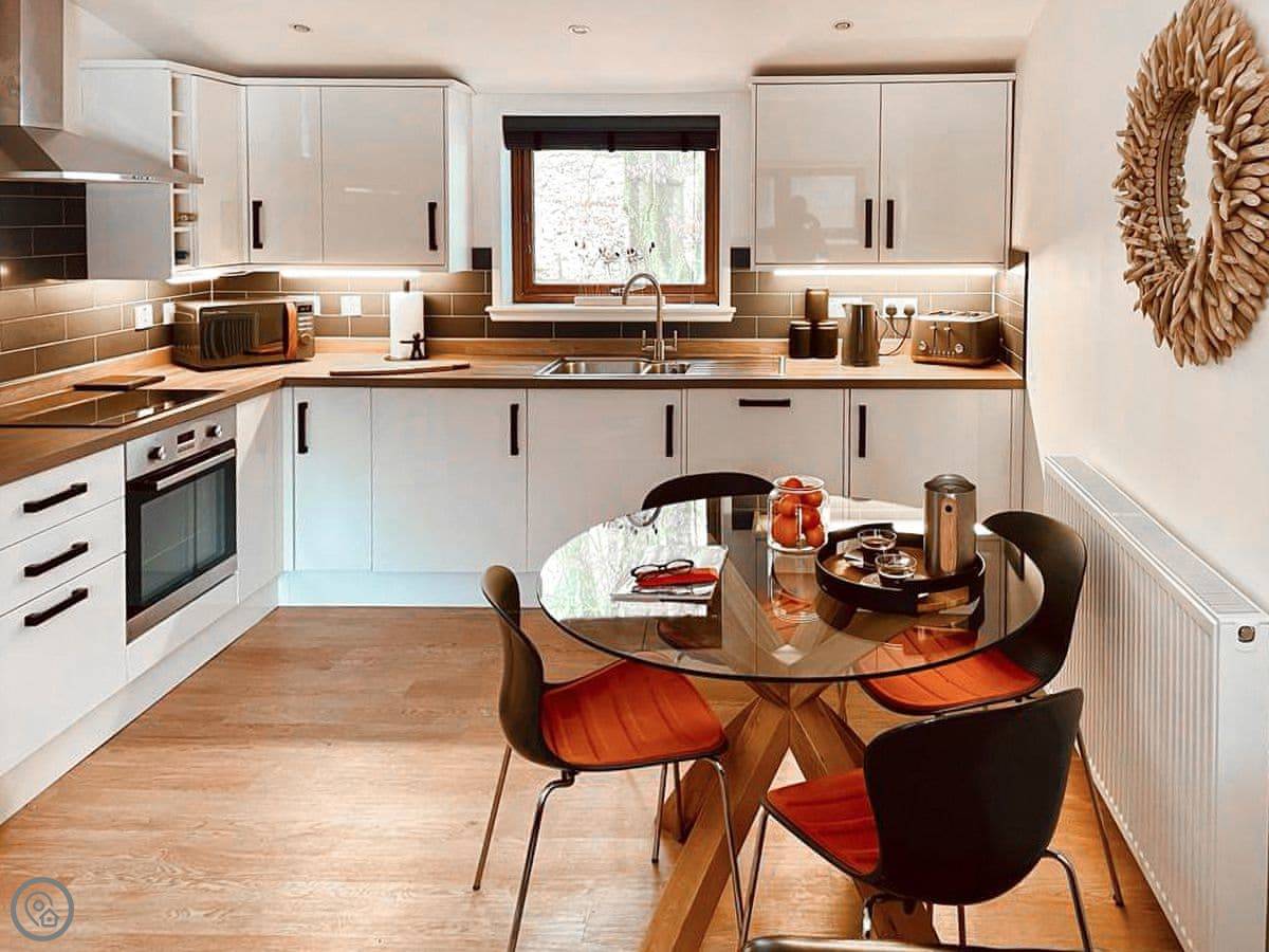 The main room is open plan: kitchen, dining, sitting area. It's compact but it works. There's a wood burner, which is great for warmth and for drying boots. The kitchen is modern and has a dishwasher. There's underfloor heating too, so it's never cold.