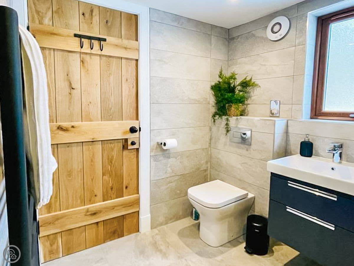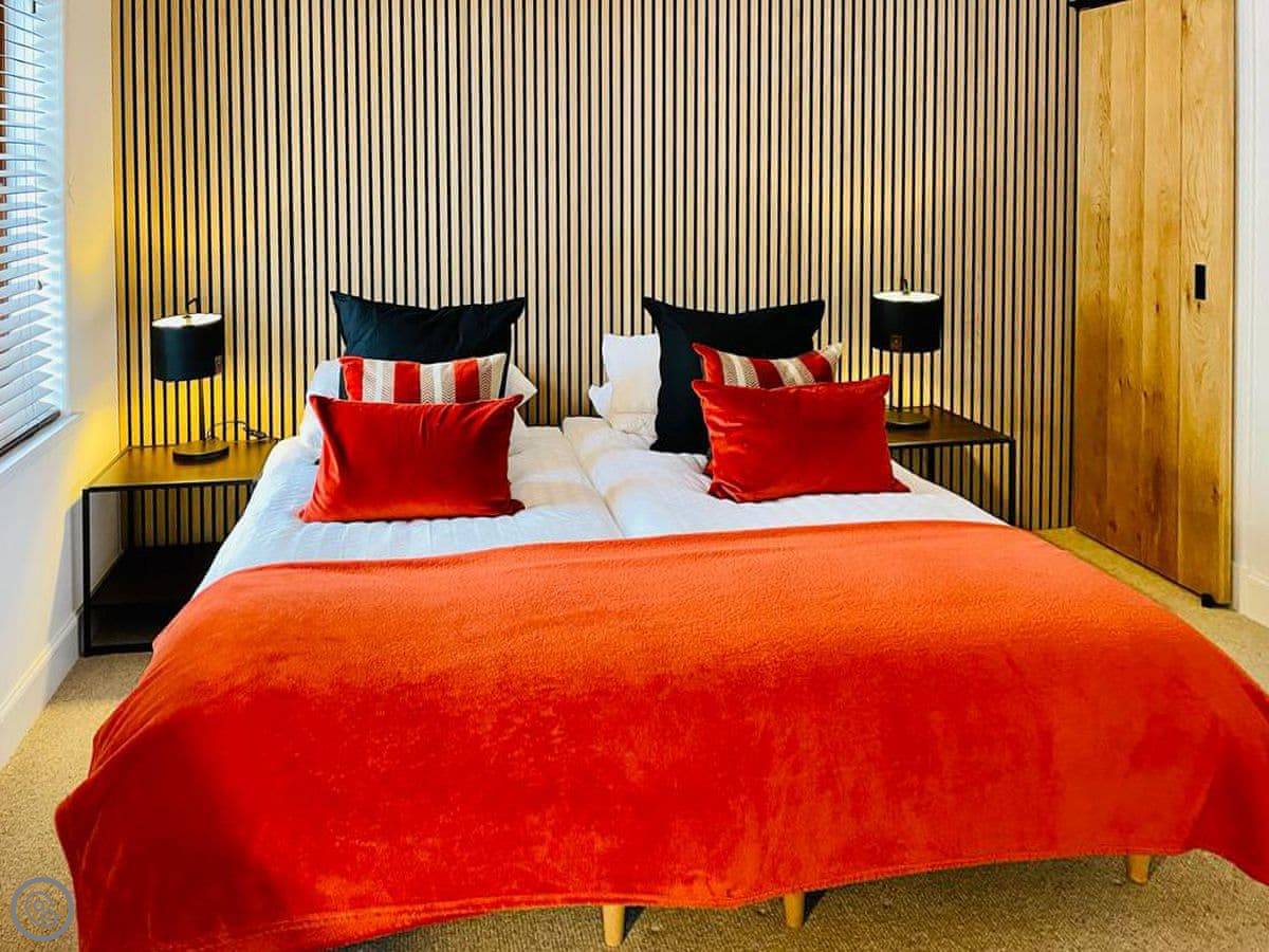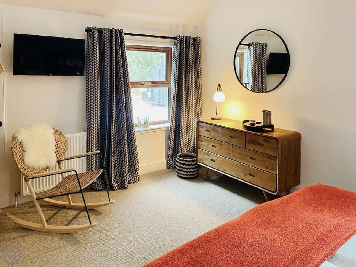 The cottage sleeps four. Two bedrooms, one bathroom. It's a 5 Star place, which means it's well-kept and has good quality things. One bedroom has a super-king bed that can be split into two singles if you need it. The bathroom is a wet room with a walk-in shower.