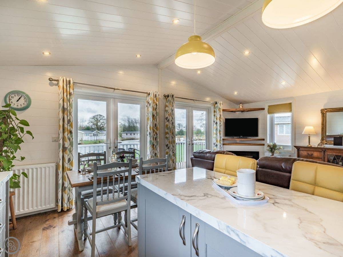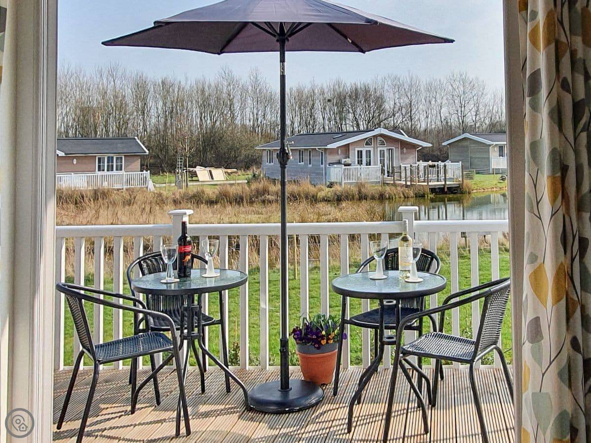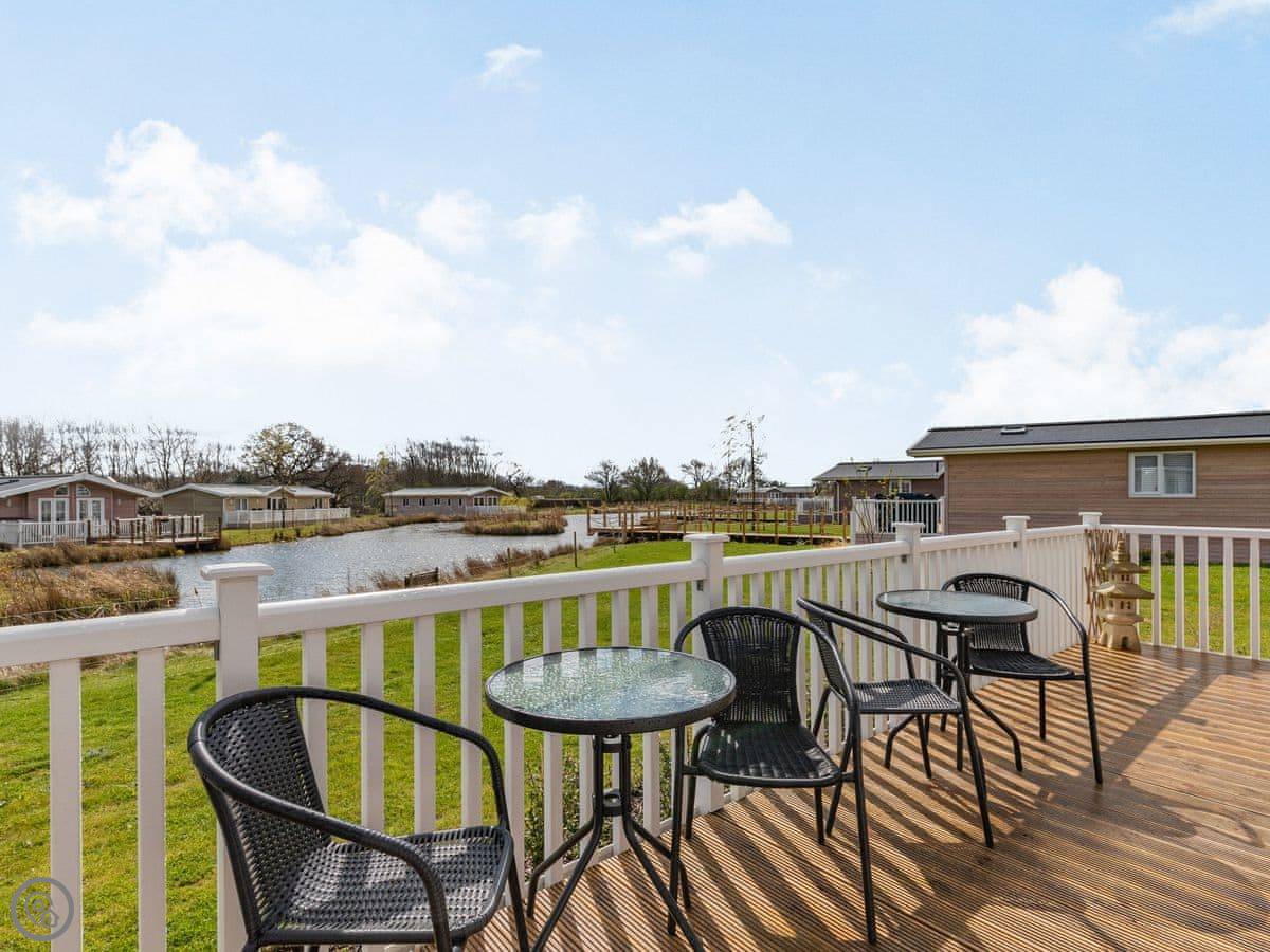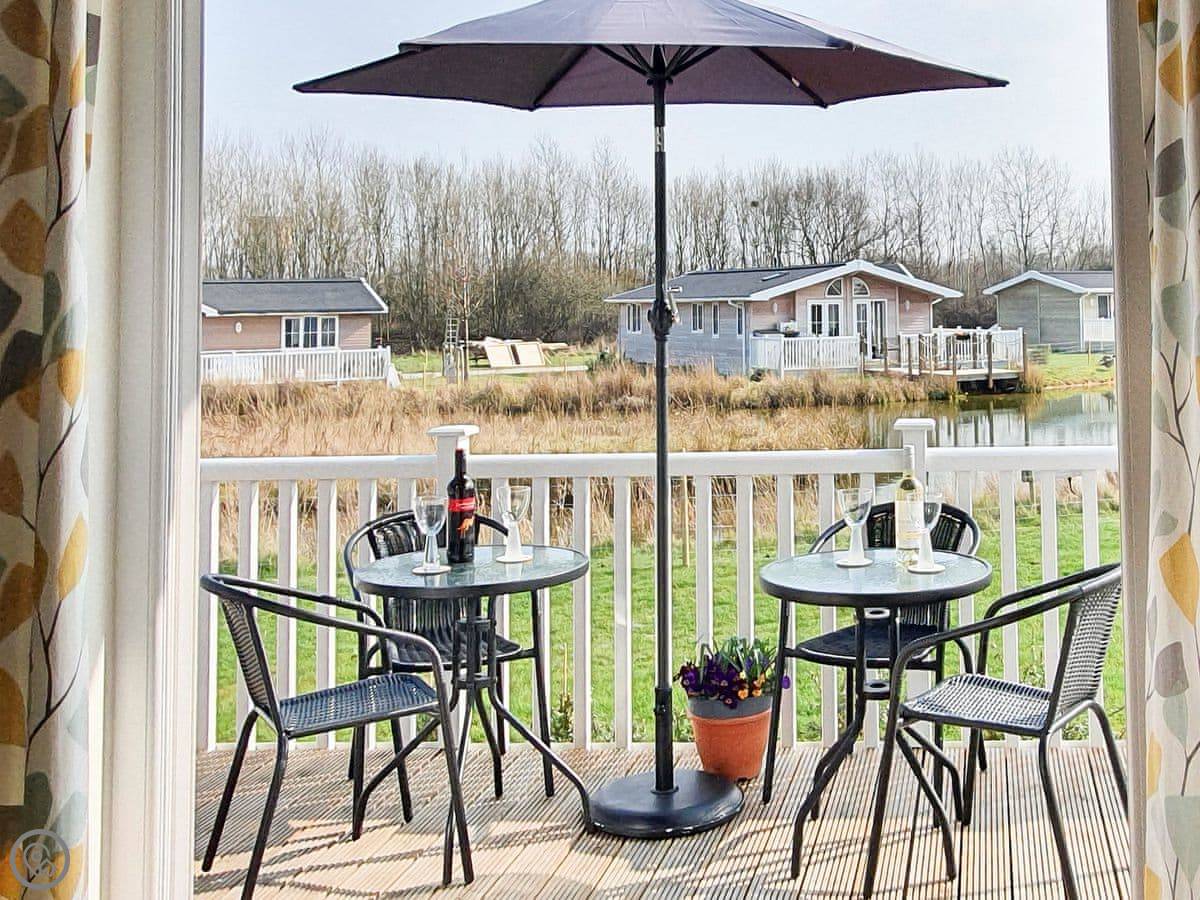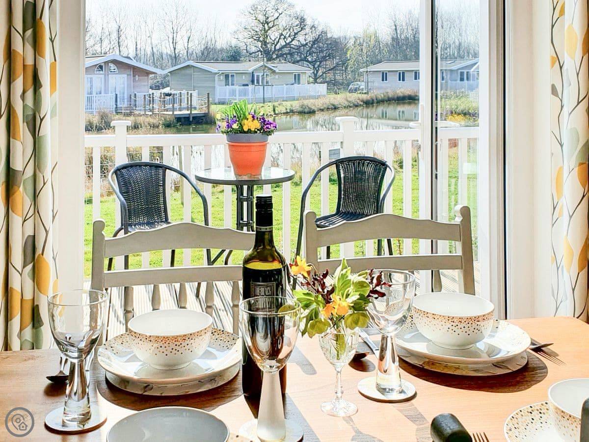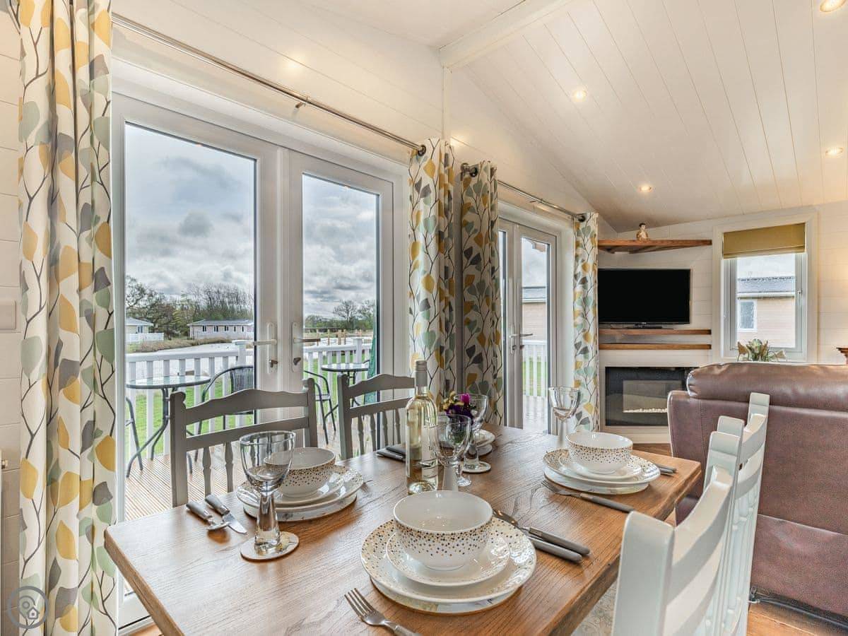 The lodge has been skilfully designed to marry modern contemporary living coupled with hints of old-world charm. The kitchen has all the modern conveniences expected, and there is a vintage, solid oak, Dutch dining table which enjoy views of the lake. In the adjacent lounge area, there is comfortable seating with both sofa and armchairs having recliner functions, perfect for a relaxing evening. Two sets of double patio doors lead onto the spacious decked area which is equipped with bistro tables and chairs for al fresco dining any time of day, with under eaves lighting enhancing any evening experience. Comfortably accommodating up to four people in genuine comfort, there are two bedrooms each with their own bathroom facilities. The owners offer guests a complimentary, 45-minute boat trip for up to four people aboard the Mercia Swan .