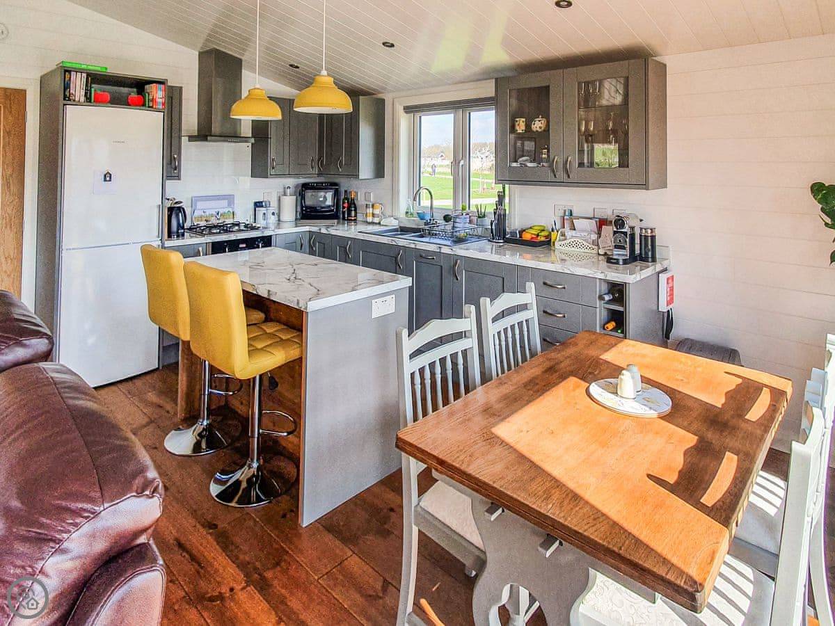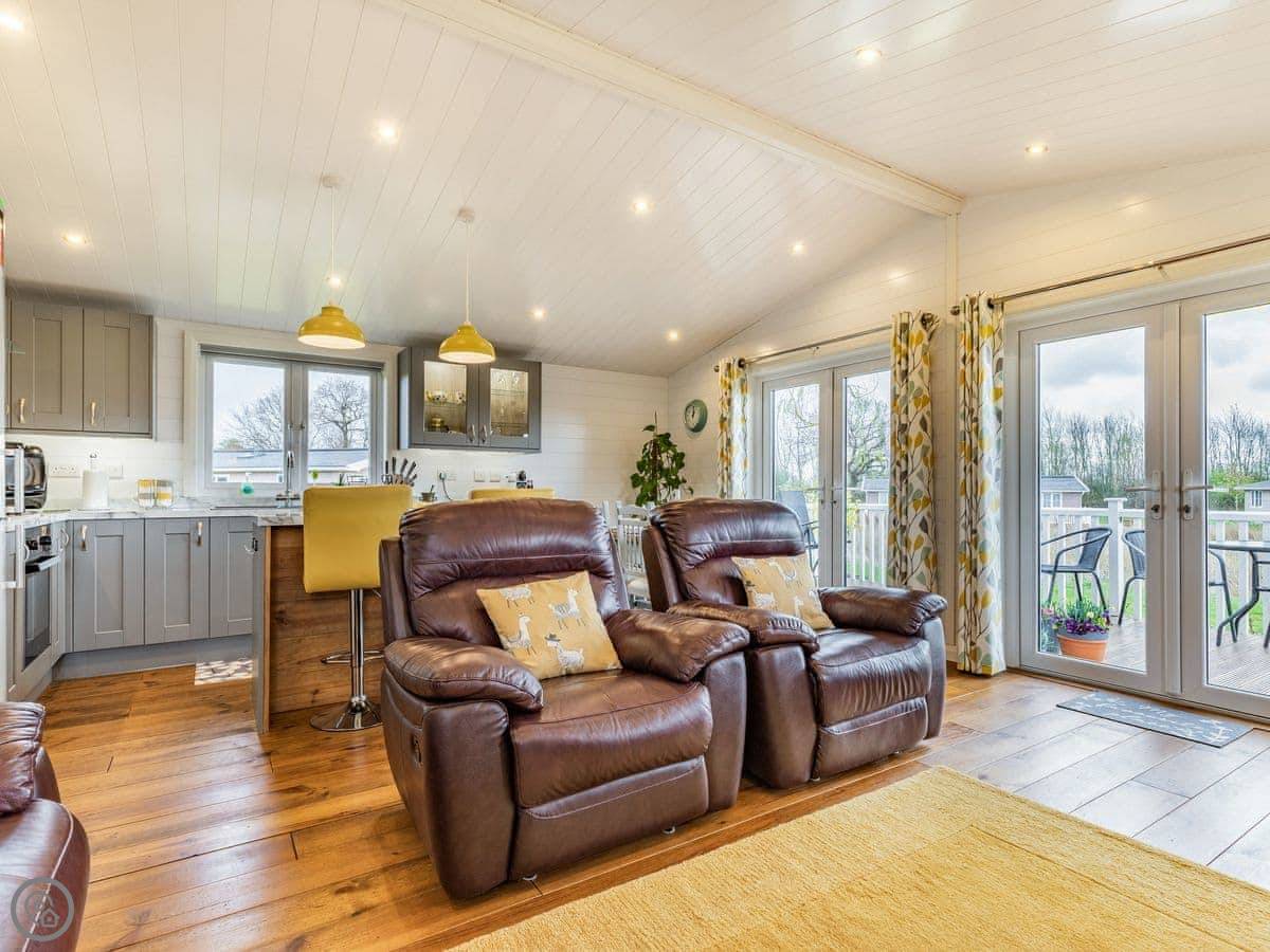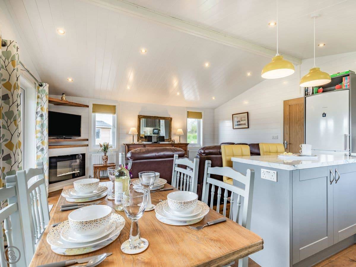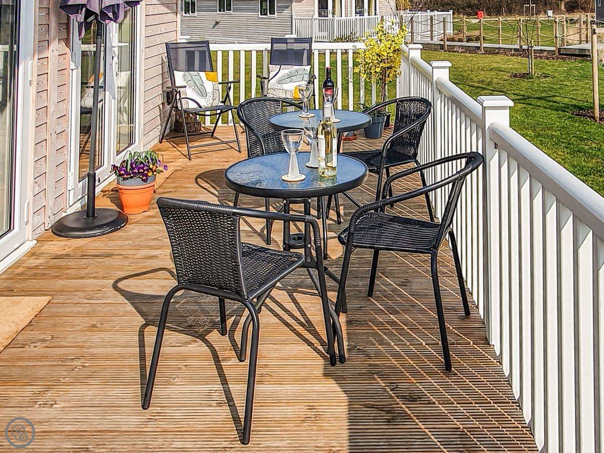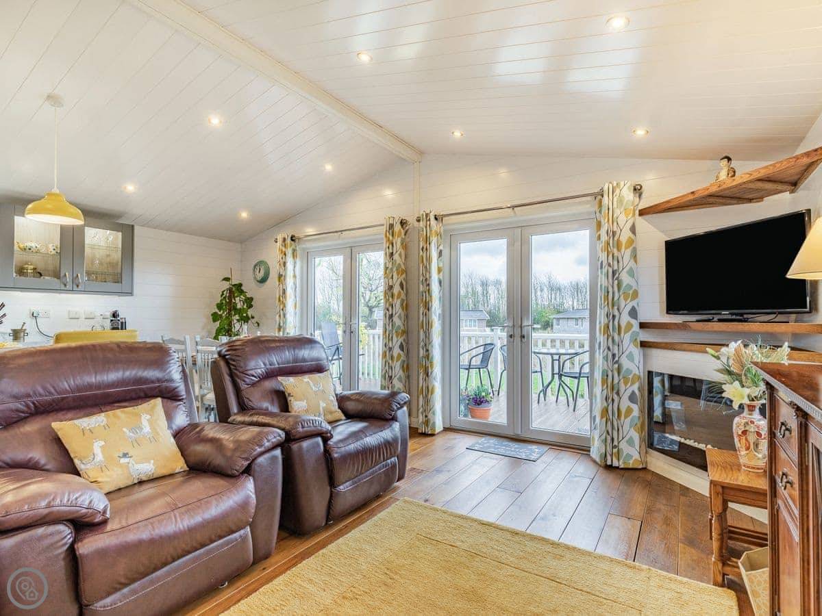 The lodge has been skilfully designed to marry modern contemporary living coupled with hints of old-world charm. The kitchen has all the modern conveniences expected, and there is a vintage, solid oak, Dutch dining table which enjoy views of the lake. In the adjacent lounge area, there is comfortable seating with both sofa and armchairs having recliner functions, perfect for a relaxing evening. Two sets of double patio doors lead onto the spacious decked area which is equipped with bistro tables and chairs for al fresco dining any time of day, with under eaves lighting enhancing any evening experience. Comfortably accommodating up to four people in genuine comfort, there are two bedrooms each with their own bathroom facilities. The owners offer guests a complimentary, 45-minute boat trip for up to four people aboard the Mercia Swan .