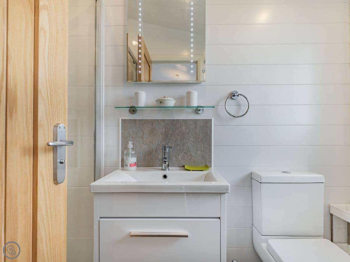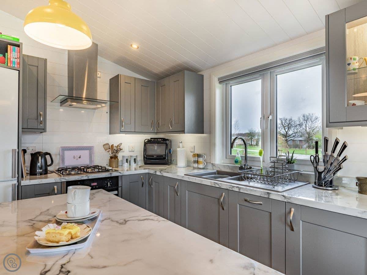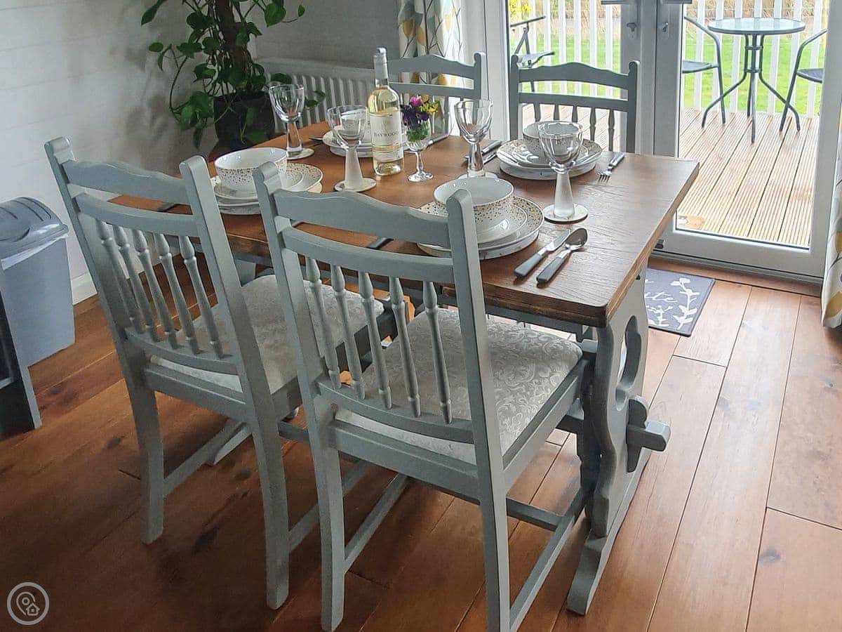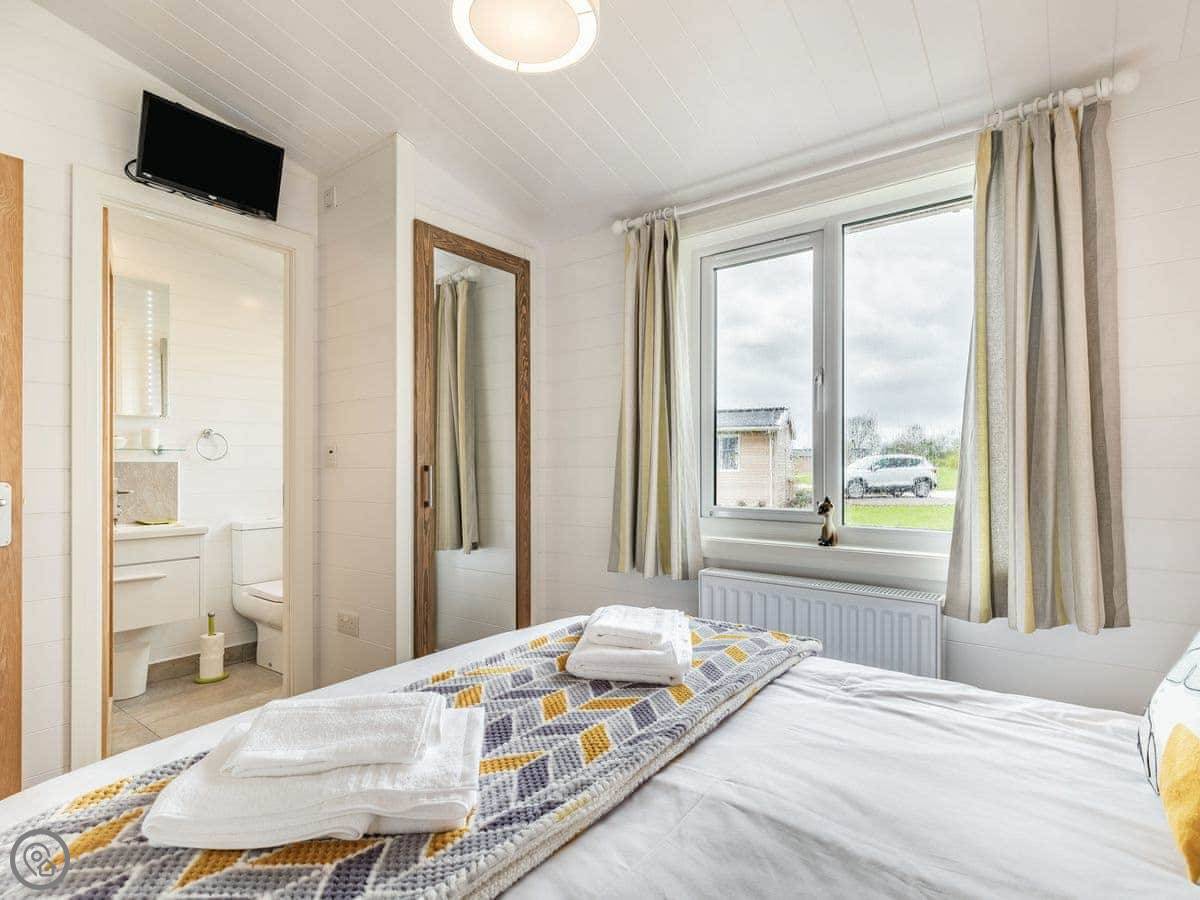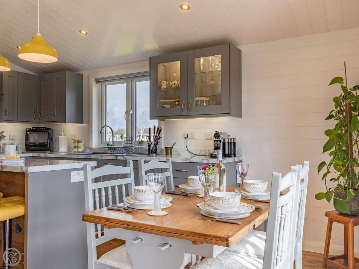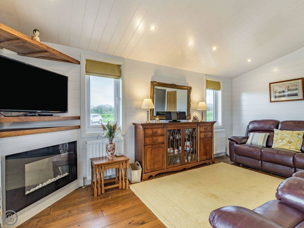 The lodge has been skilfully designed to marry modern contemporary living coupled with hints of old-world charm. The kitchen has all the modern conveniences expected, and there is a vintage, solid oak, Dutch dining table which enjoy views of the lake. In the adjacent lounge area, there is comfortable seating with both sofa and armchairs having recliner functions, perfect for a relaxing evening. Two sets of double patio doors lead onto the spacious decked area which is equipped with bistro tables and chairs for al fresco dining any time of day, with under eaves lighting enhancing any evening experience. Comfortably accommodating up to four people in genuine comfort, there are two bedrooms each with their own bathroom facilities. The owners offer guests a complimentary, 45-minute boat trip for up to four people aboard the Mercia Swan .