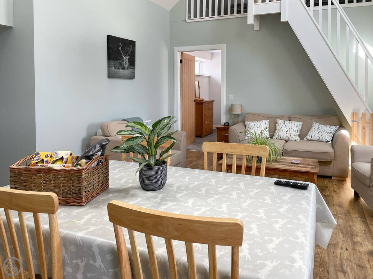 It’s open plan downstairs, so kitchen, living and dining are all in one big room. It works well. You get all the usual stuff: washing machine, dishwasher, WiFi, TV. Bedding and towels are included. You can bring one dog. There's parking right outside.