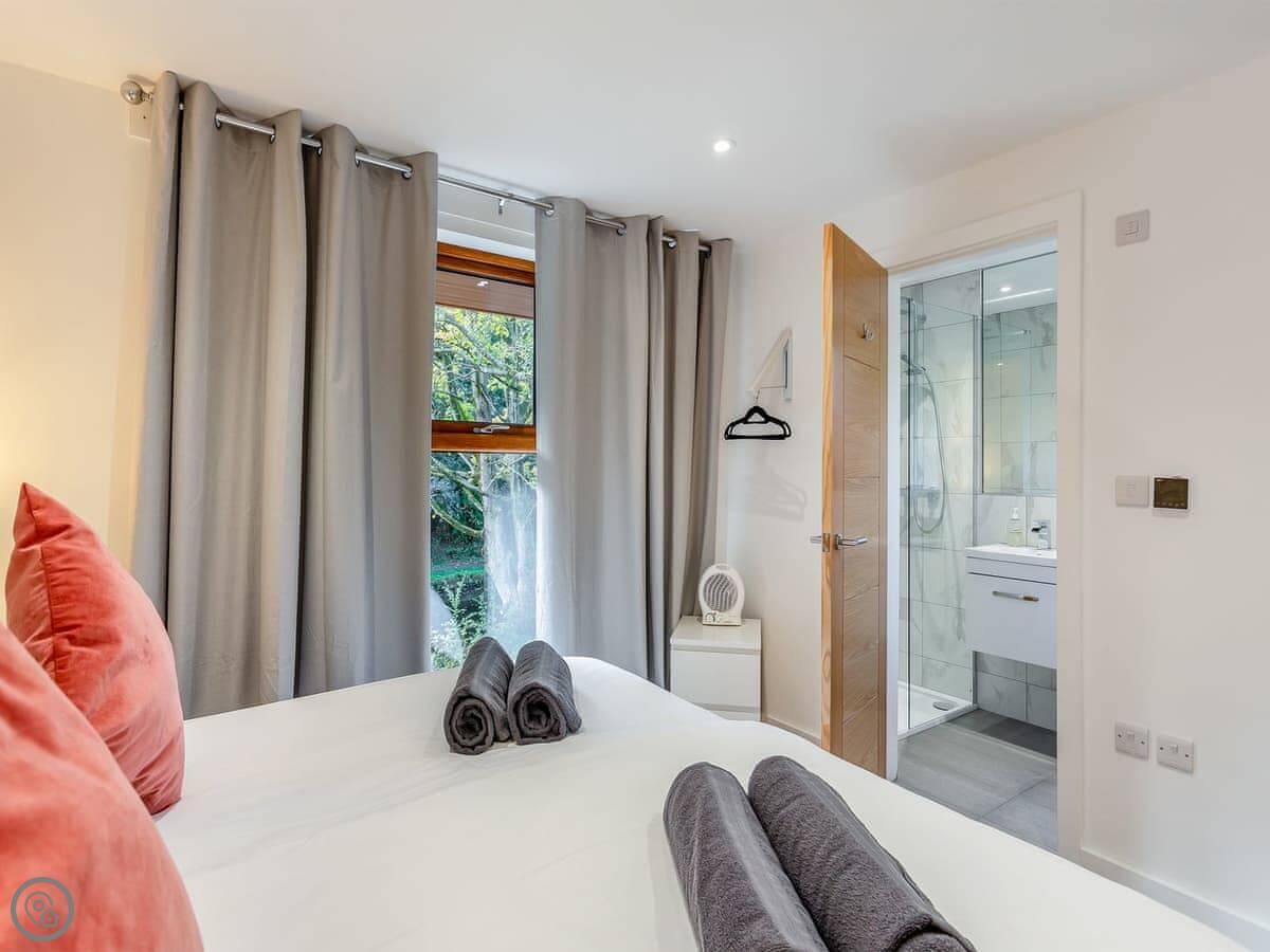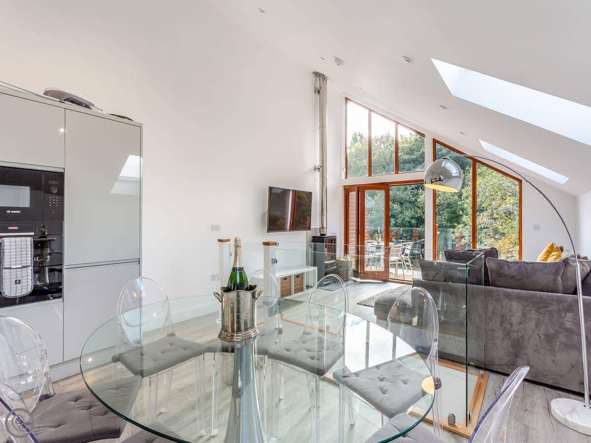The layout is a bit different. The main living area is on the top floor. It has big folding doors that open onto a balcony so you can get the view. Two bedrooms are on the middle floor, and the other two are on the ground floor. One of the ground floor bedrooms has glass doors that open straight out onto a decked area by the water. That's a nice feature.