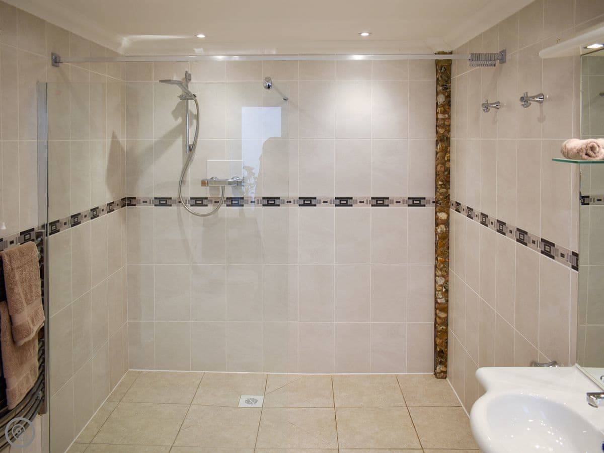 The stairs are fine because there aren't any. Everything's on the ground floor. The shower room is big, with two sinks. The kitchen is small but it's got an oven, hob, microwave, and fridge. We leave some basics like oil and salt.