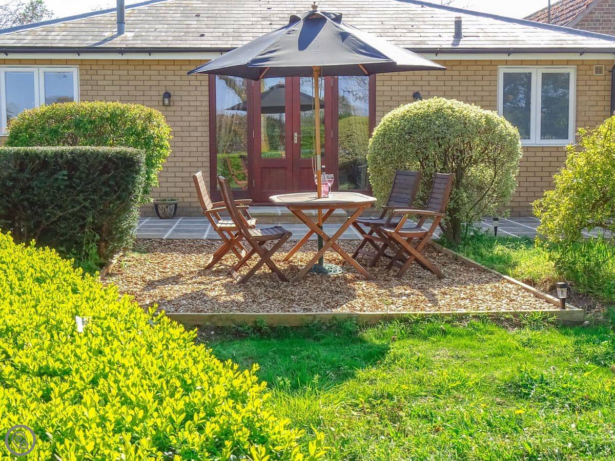 The garden has a seating area, a gas barbecue, and a chiminea. It's enclosed, but it's not completely escape-proof for a determined dog. We do allow two well-behaved dogs. There are other dogs living on the farm. We leave bowls and blankets for yours.