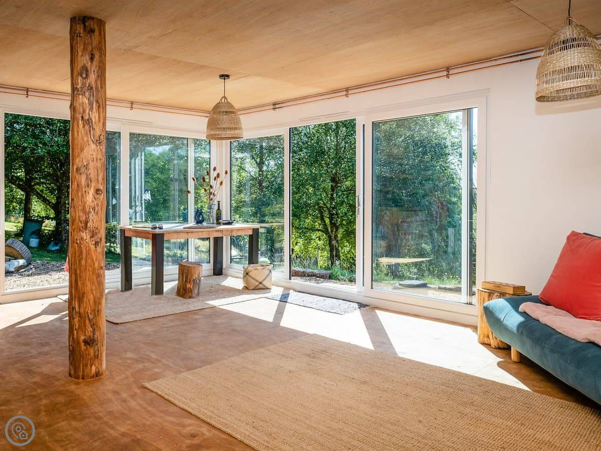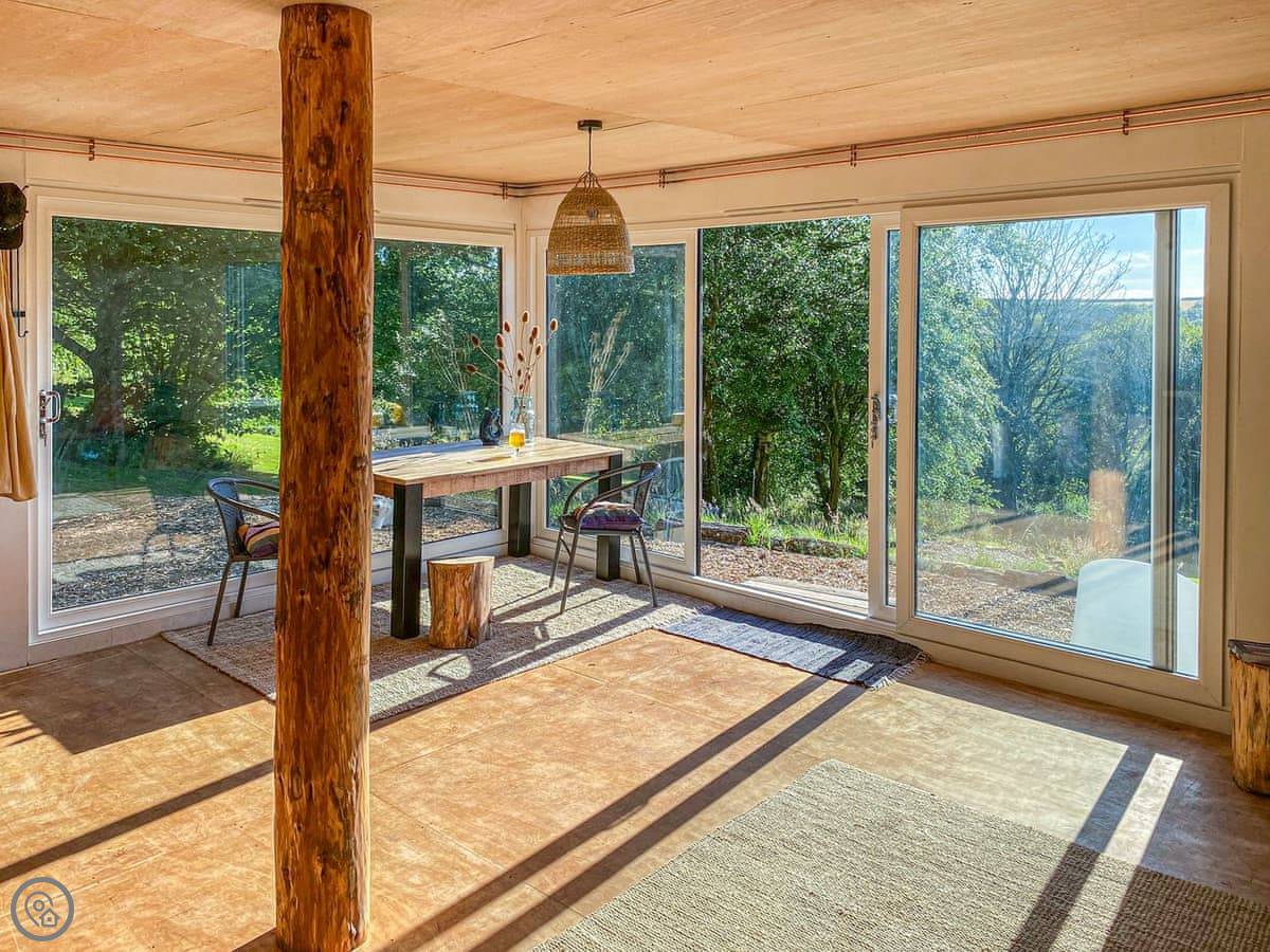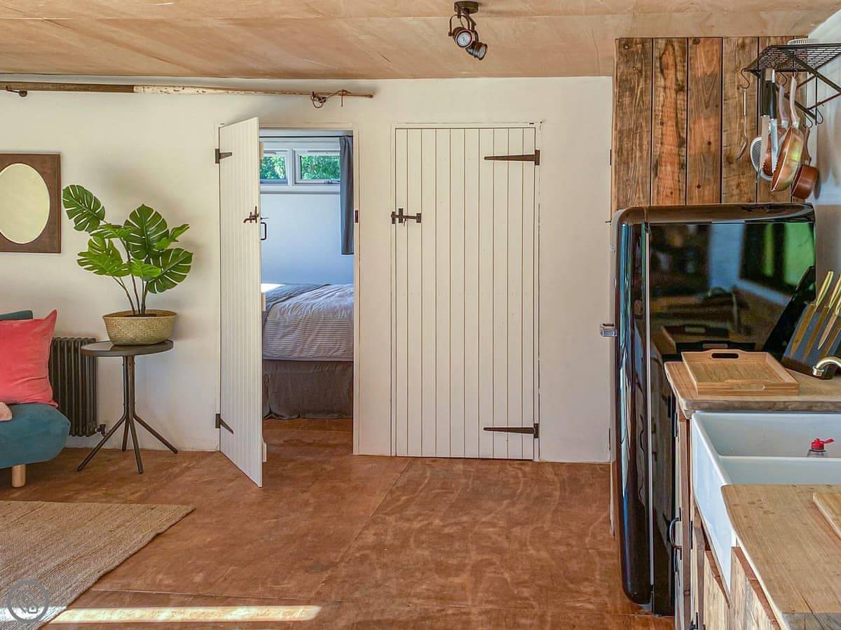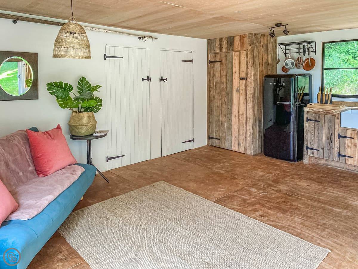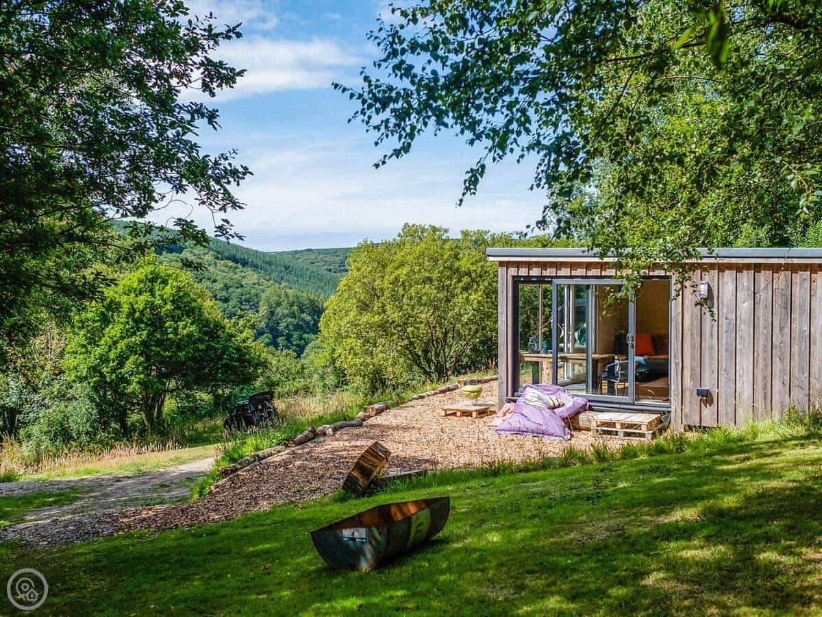 On the ground floor is a large comfortable living room with a corner sofa, a cosy open fireplace, Smart TV and a selection of games to enjoy, not forgetting the piano for those who fancy tickling the ivories. Then there’s a separate dining room with a garden view, a kitchen/diner with everything you’d expect to make this a home from home. Upstairs you’ll find four bedrooms and a separate family bathroom with bath and separate shower cubicle. The bedrooms include a super kingsize with en-suite shower room, a bunk, a twin and a kingsize, all with beautiful countryside views. Step outside and enjoy the privacy on offer with an enclosed private garden and raised sun decks where you will find a fantastic, covered barbecue deck with table and chairs, a firepit and solar powered lighting. There is also a large south facing veranda to enjoy the morning sun. Newly built in 2022, The Bach offers privacy and although ideal for a peaceful getaway for two people it will sleep up to four by way of a double sofa bed in the living area. The latter has a Smart TV and is open plan with the kitchen/dining room which offers contemporary equipment including a dishwasher and a coffee machine. The bedroom has a kingsize bed and there’s a shower room with walk-in shower. Outside the property benefits from a secluded and elevated position on the land and offers grass areas and a patio with outdoor seating.