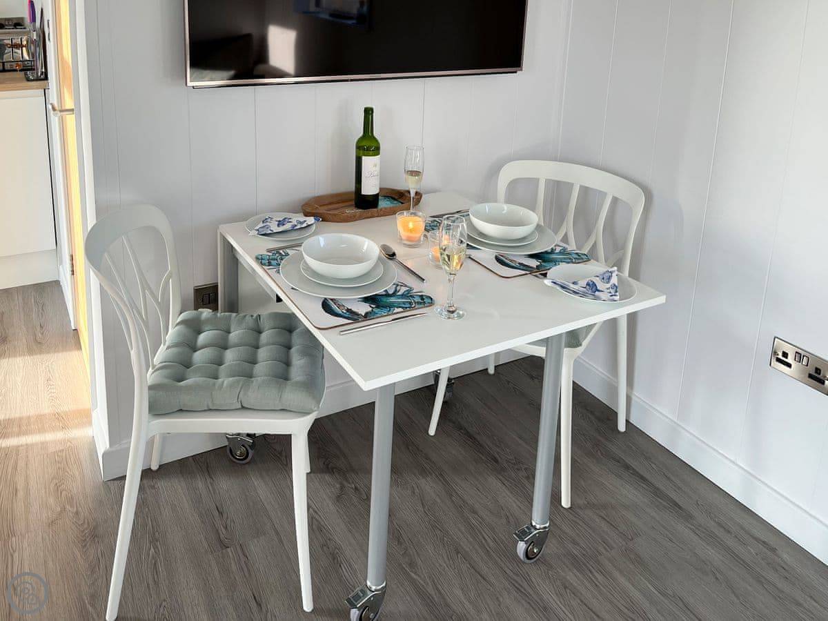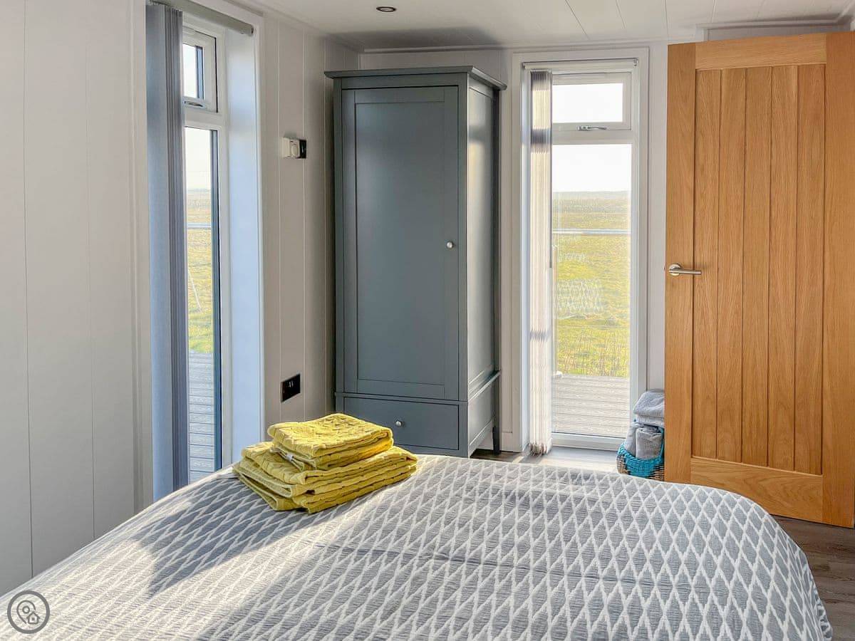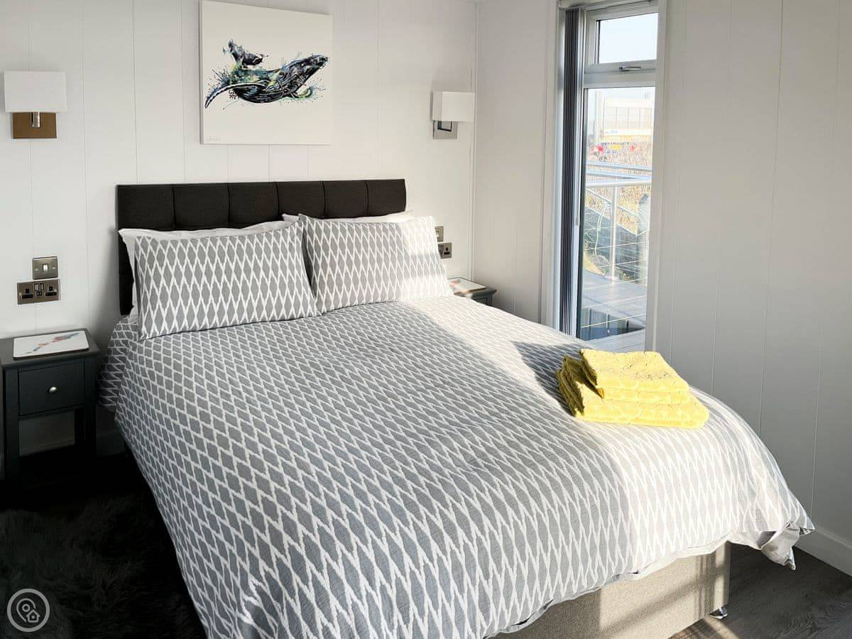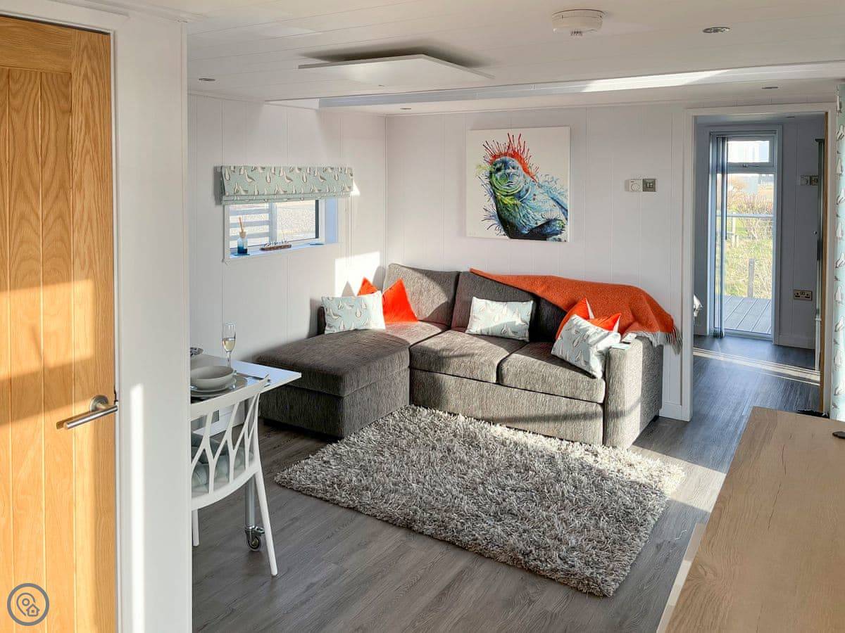 As you enter the front door, you arrive at the open plan living/kitchen area which is a bright and airy space, with colourful and eye-catching local artwork carefully selected to reflect the area and the vibrant array of sea life nearby. Next door is the double bedroom, with a luxury double bed and plenty storage for your belongings during your stay. The bathroom has a walk-in cubicle shower and the owner has even provided some bath robes for your added comfort during your stay.