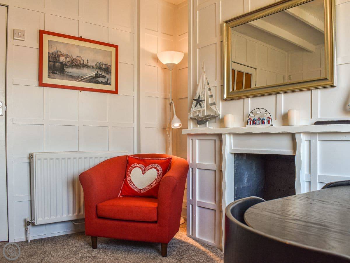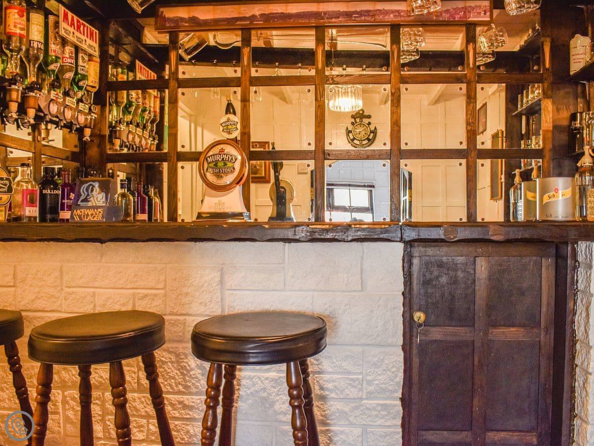 The front door opens into a small room with a bar built into it. It's from the 70s, I think. It's just there. The kitchen is on the first floor up, and the main sitting room is on that floor too. It's got a sofa, an armchair and a table by the window. You get a good view of the harbour from there. The TV and WiFi are there if you need them.