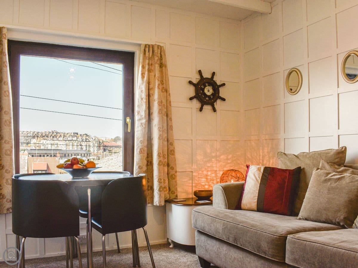 You're right on the harbour. You can see the boatyard opposite. Walk along the path to your left and you're in the old town in five or ten minutes. The beach, the 199 steps up to the abbey, and all the shops are that way. It's four-star rated, which here means it's been modernised where it matters but keeps its character.