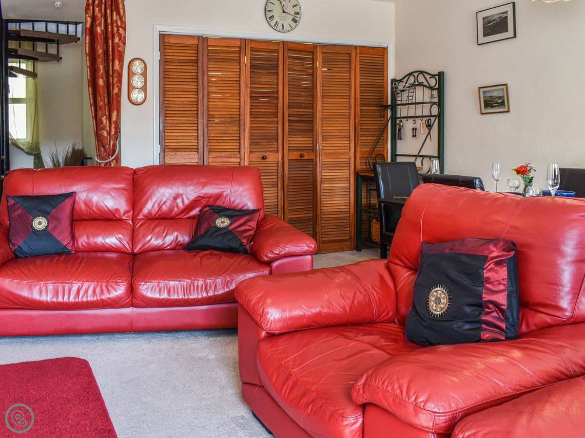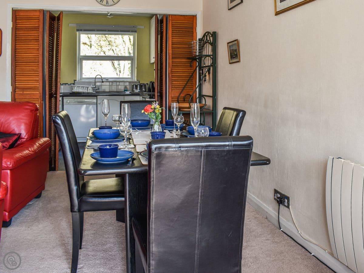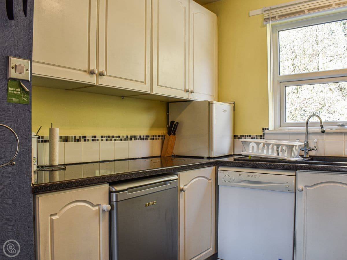 The living area is open plan, with the kitchen off it. You can close the kitchen door. There's a dishwasher. A small sun porch leads to the front door and a patio with a good view down the valley.