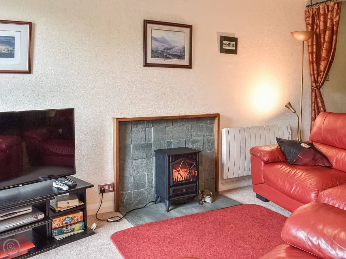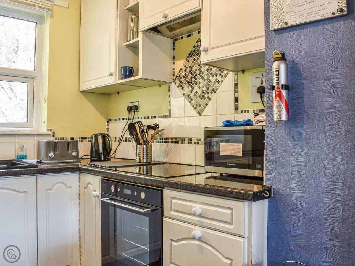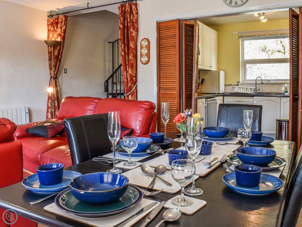 The living area is open plan, with the kitchen off it. You can close the kitchen door. There's a dishwasher. A small sun porch leads to the front door and a patio with a good view down the valley.