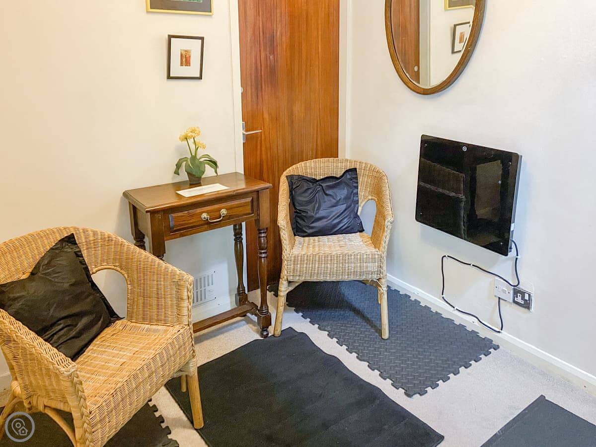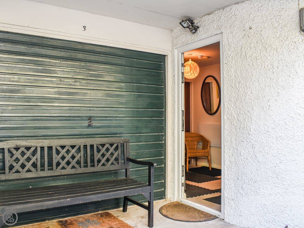 Access is round the back at the lower ground level. That's where the private parking and a covered seating area are. You come in there into a hallway, which is useful for boots and coats. Then you go up a spiral staircase to the main living area. The stairs are spiral and quite steep. Just so you know.