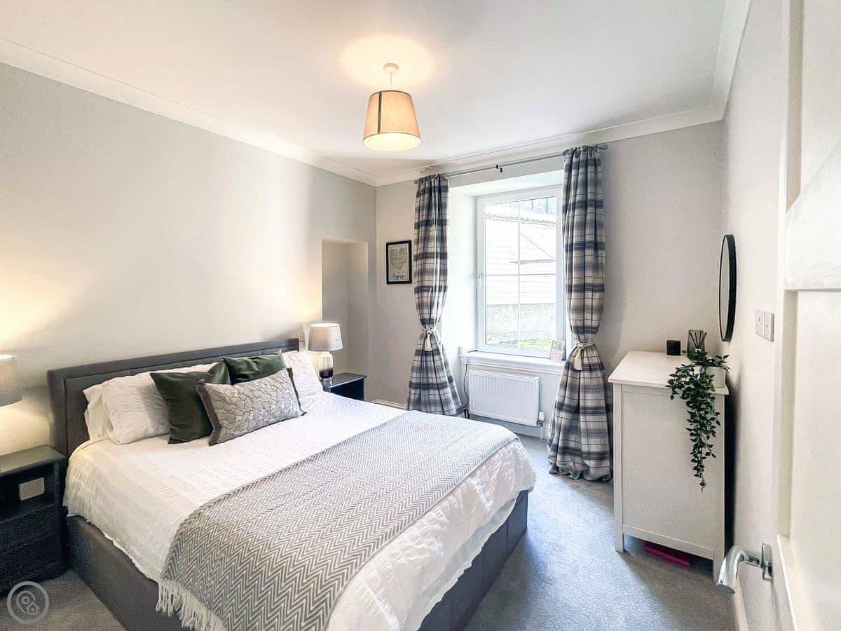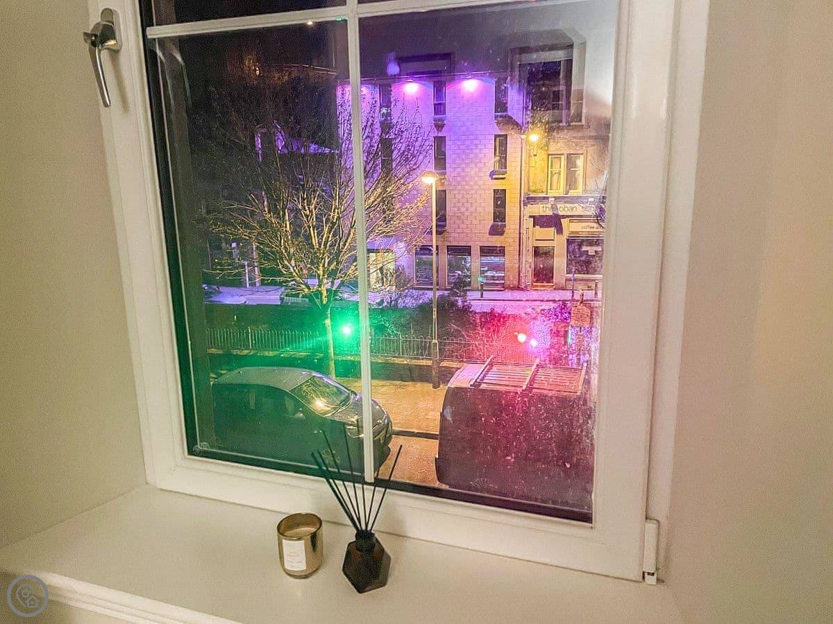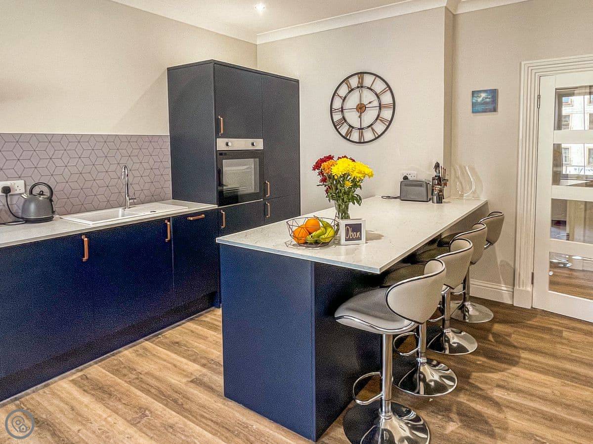 The ideal size for a couple or small family made cosy by convenient gas central heating, it’s a perfect West Coast holiday base, close to Oban town centre and all shops, restaurants and bars. Carpeted stairs lead up from the elegant hallway into the apartment, with daylight streaming in through the large living room windows. There is a spacious open-plan lounge/kitchen/dining area, with warm wooden flooring throughout, beautifully decorated with a couch for lounging on after a busy day exploring the area. Newly installed well-equipped kitchen, with a large dining/breakfast bar for your meals. Peaceful outlook across the street to a small river, complete with ducks, which runs through the town, and is lit up at night. There are two generous size bedrooms, both are served by a shower room with walk-in shower featuring a large rainfall shower head with hand-held wand.