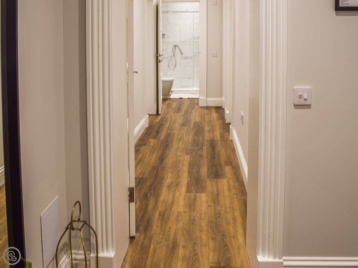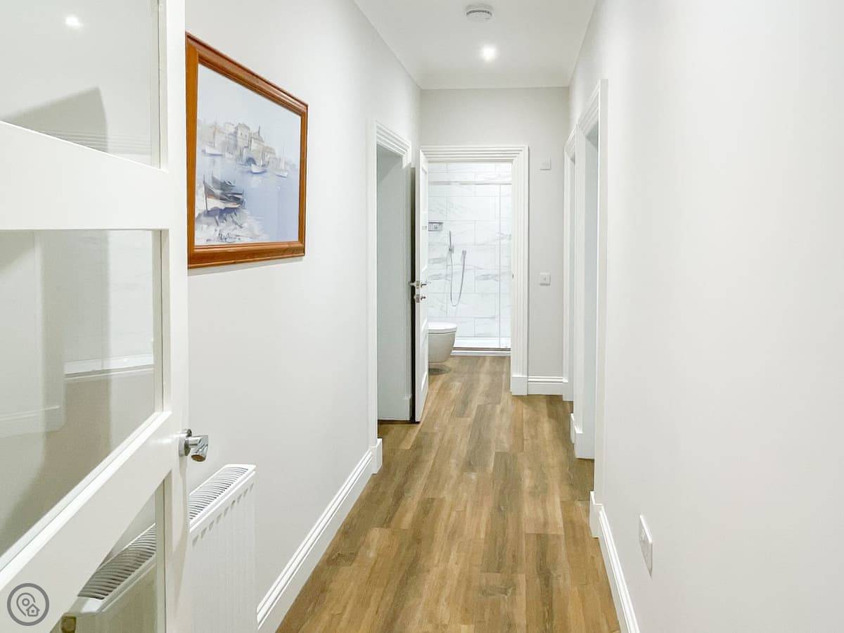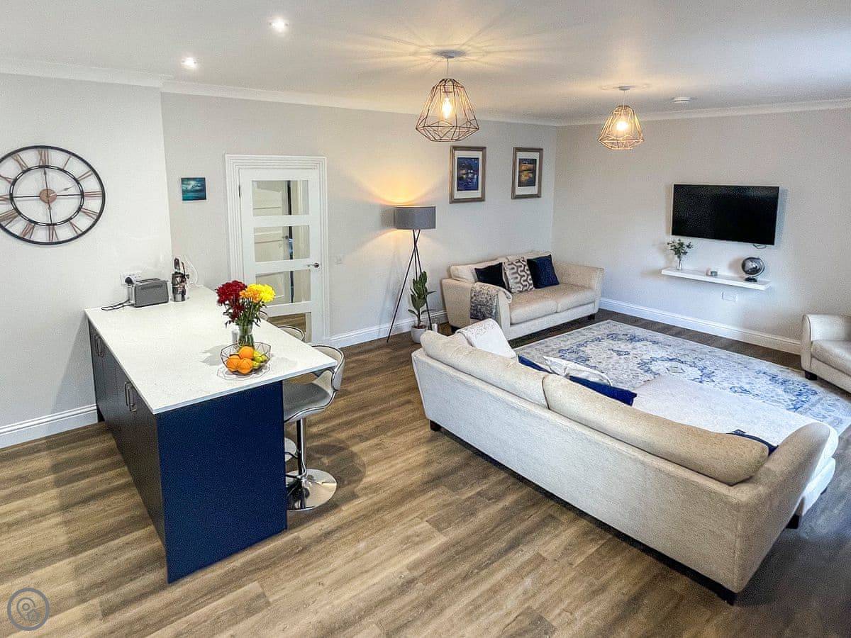 The ideal size for a couple or small family made cosy by convenient gas central heating, it’s a perfect West Coast holiday base, close to Oban town centre and all shops, restaurants and bars. Carpeted stairs lead up from the elegant hallway into the apartment, with daylight streaming in through the large living room windows. There is a spacious open-plan lounge/kitchen/dining area, with warm wooden flooring throughout, beautifully decorated with a couch for lounging on after a busy day exploring the area. Newly installed well-equipped kitchen, with a large dining/breakfast bar for your meals. Peaceful outlook across the street to a small river, complete with ducks, which runs through the town, and is lit up at night. There are two generous size bedrooms, both are served by a shower room with walk-in shower featuring a large rainfall shower head with hand-held wand.