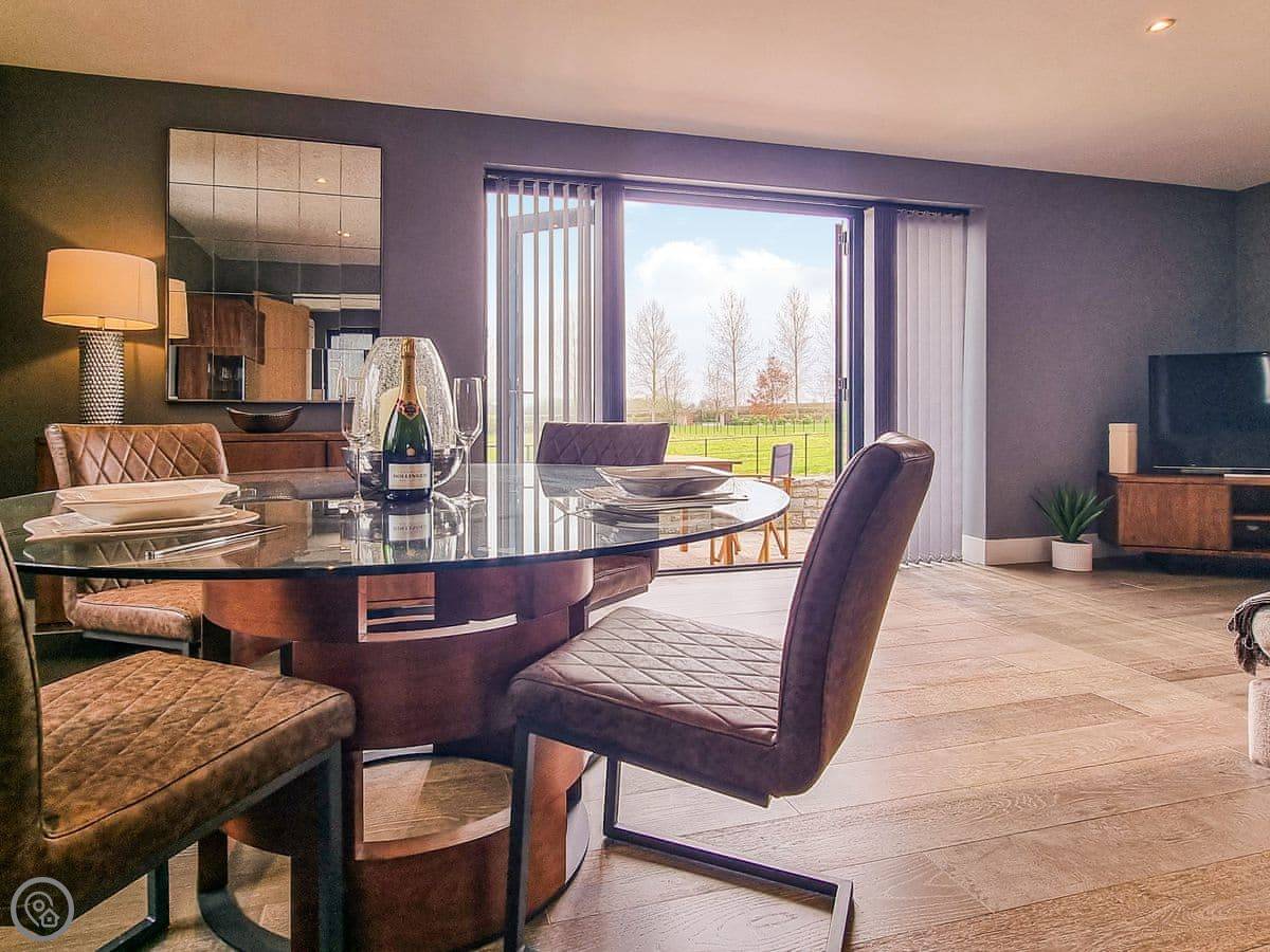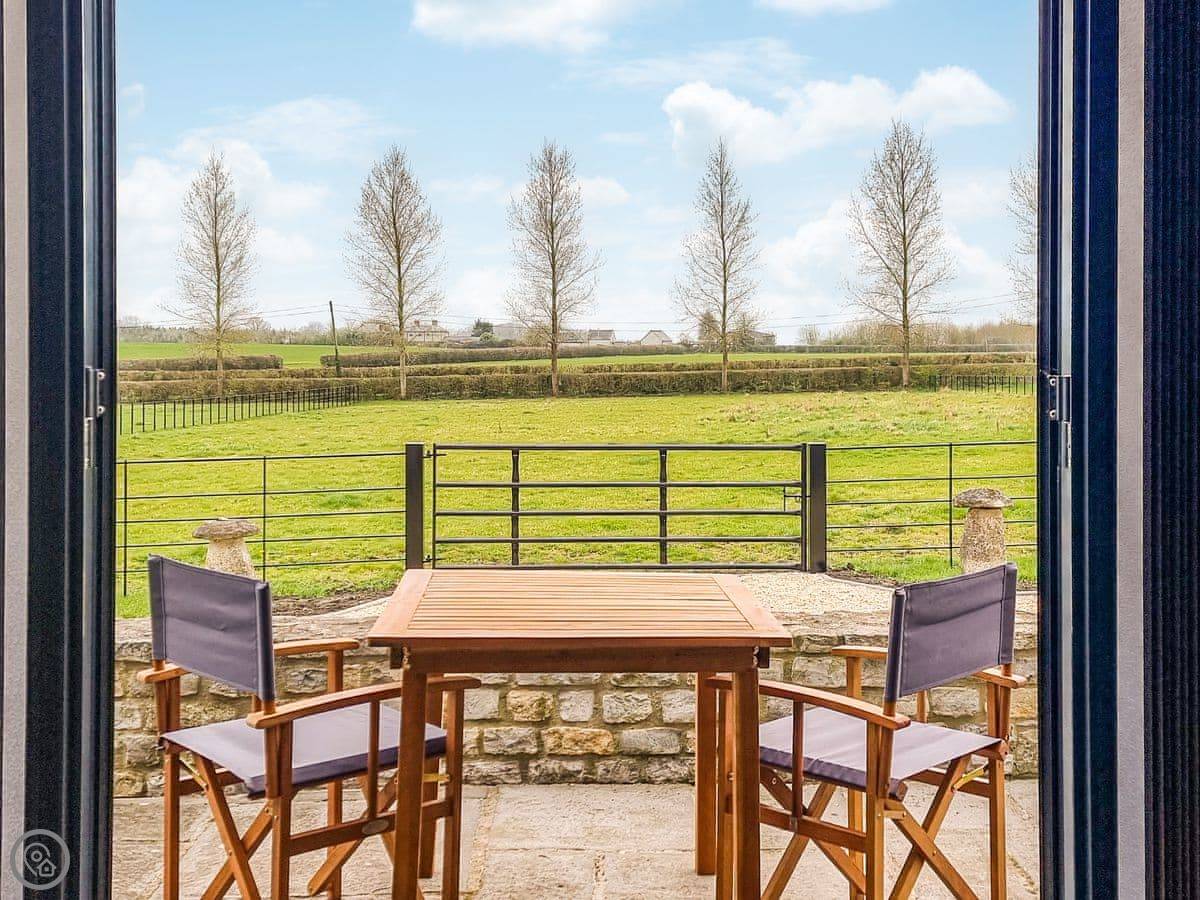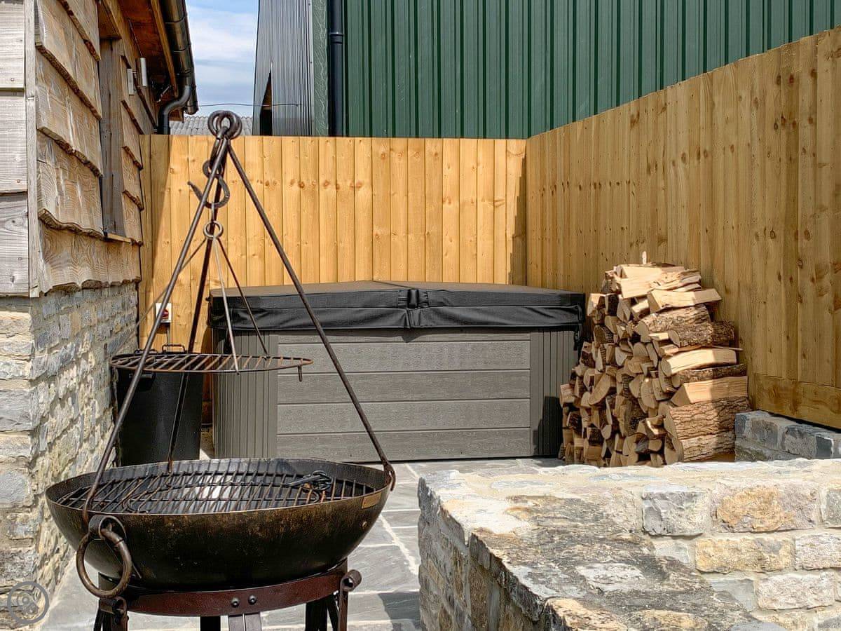 Downstairs is open plan. Kitchen's got what you need. French doors open onto a patio with a table and a hot tub. You look out over fields. You'll see our sheep, and sometimes the horses from the yard.
