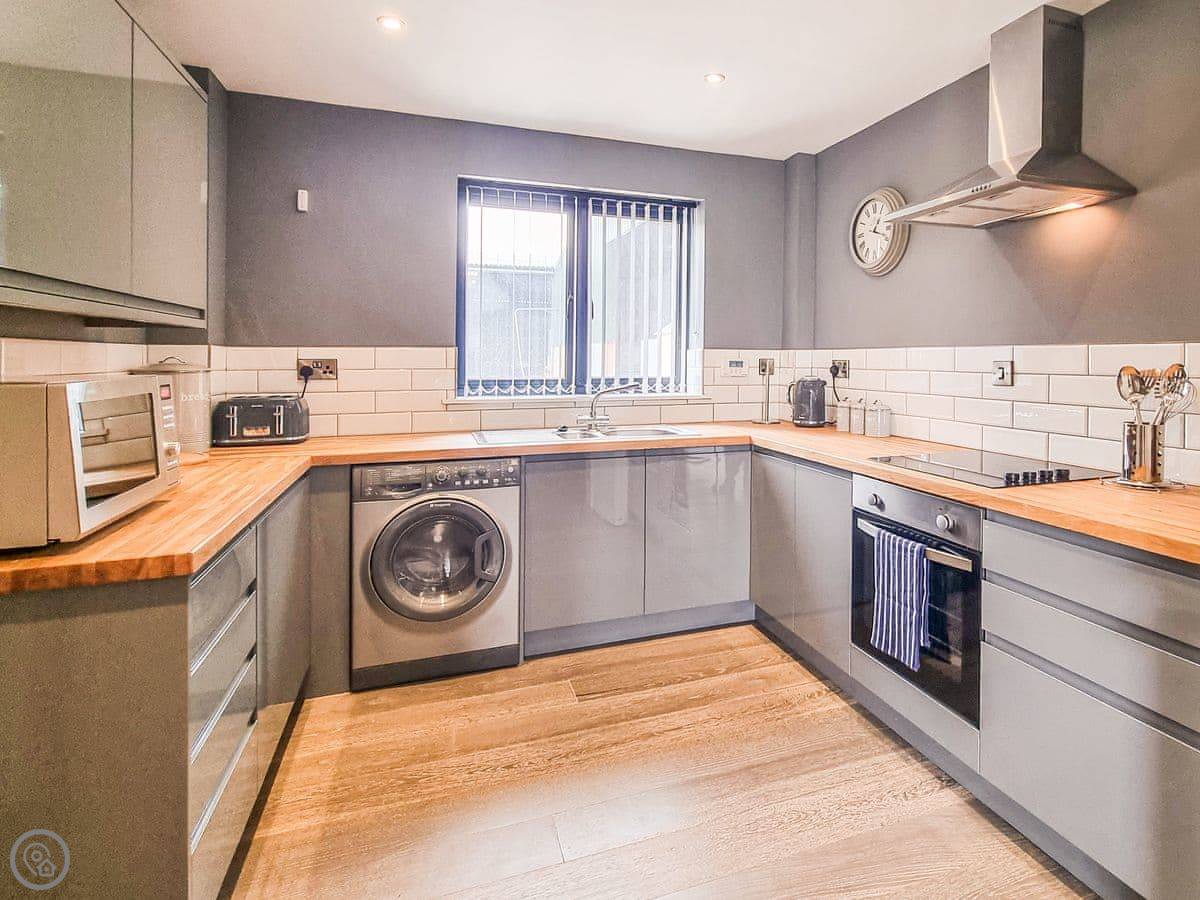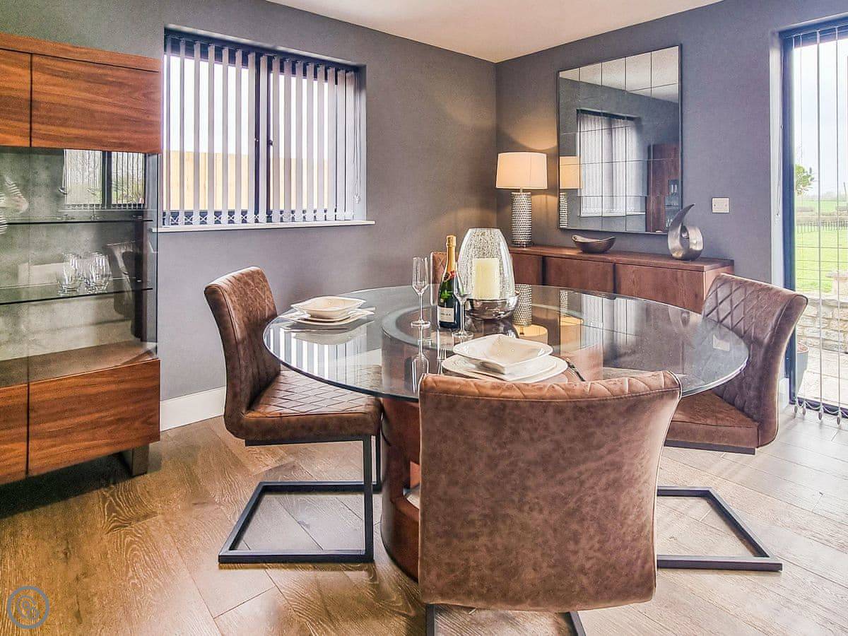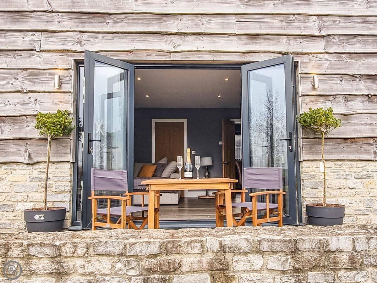 Downstairs is open plan. Kitchen's got what you need. French doors open onto a patio with a table and a hot tub. You look out over fields. You'll see our sheep, and sometimes the horses from the yard.
