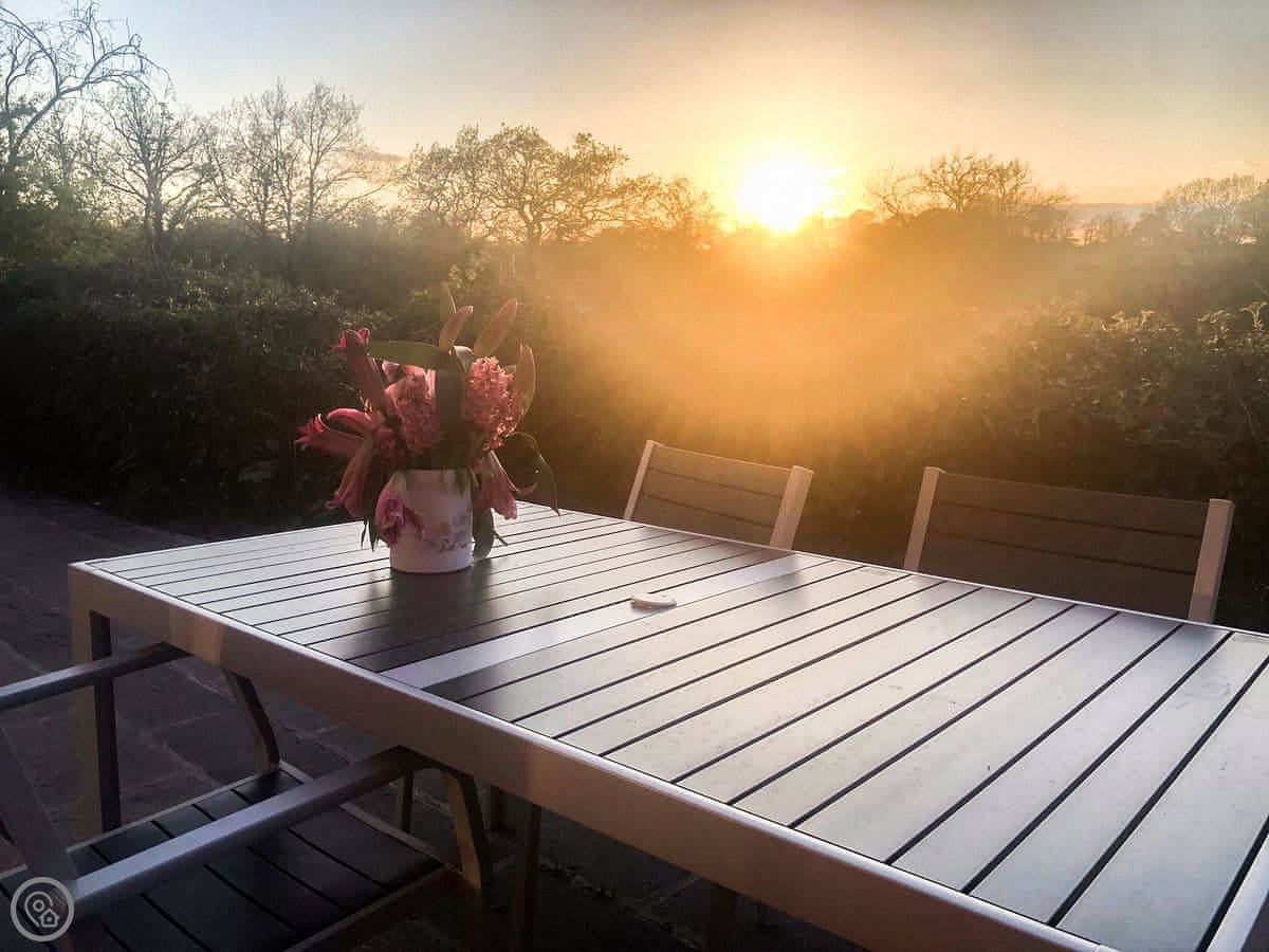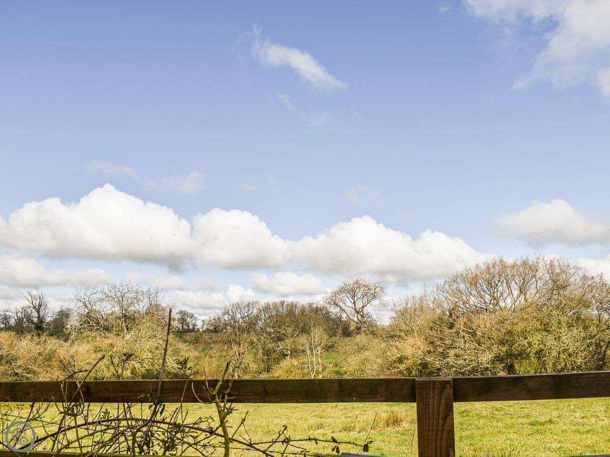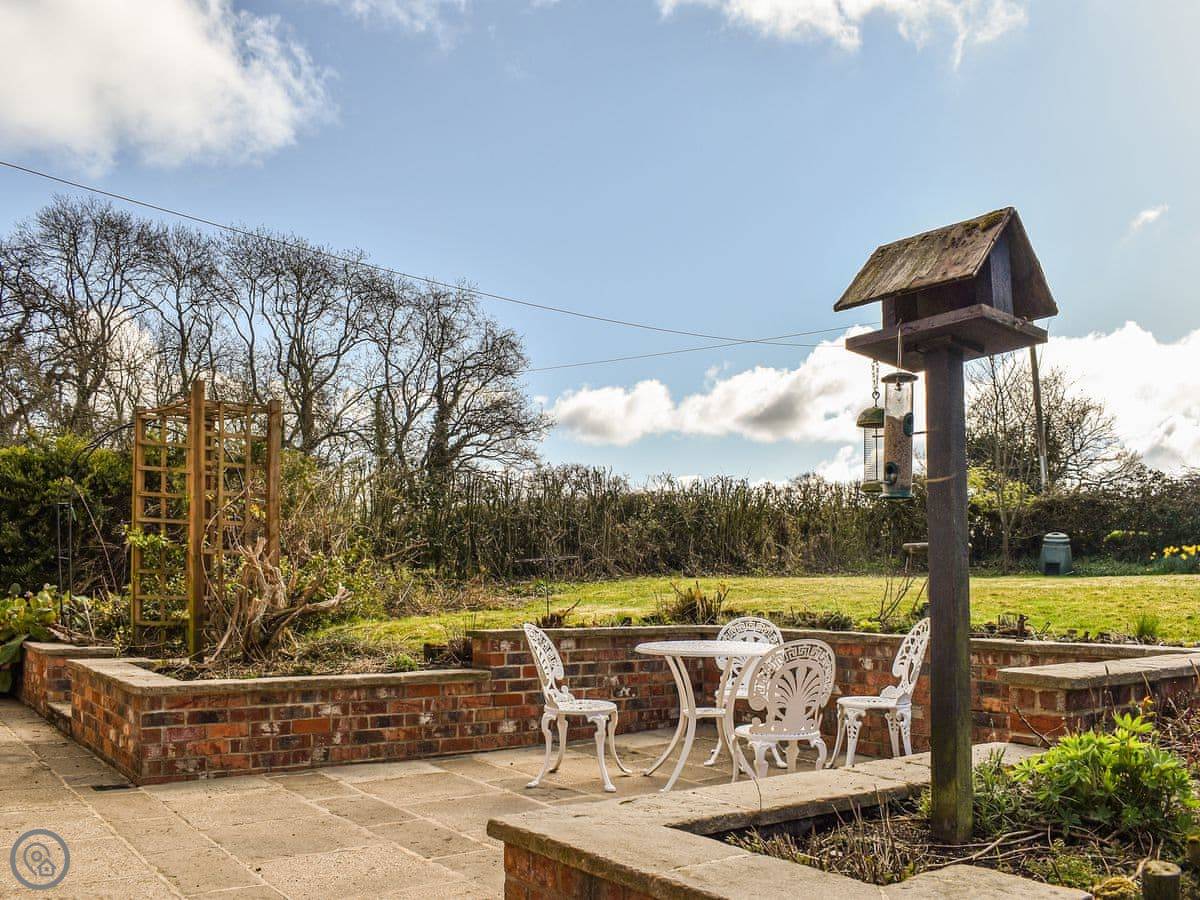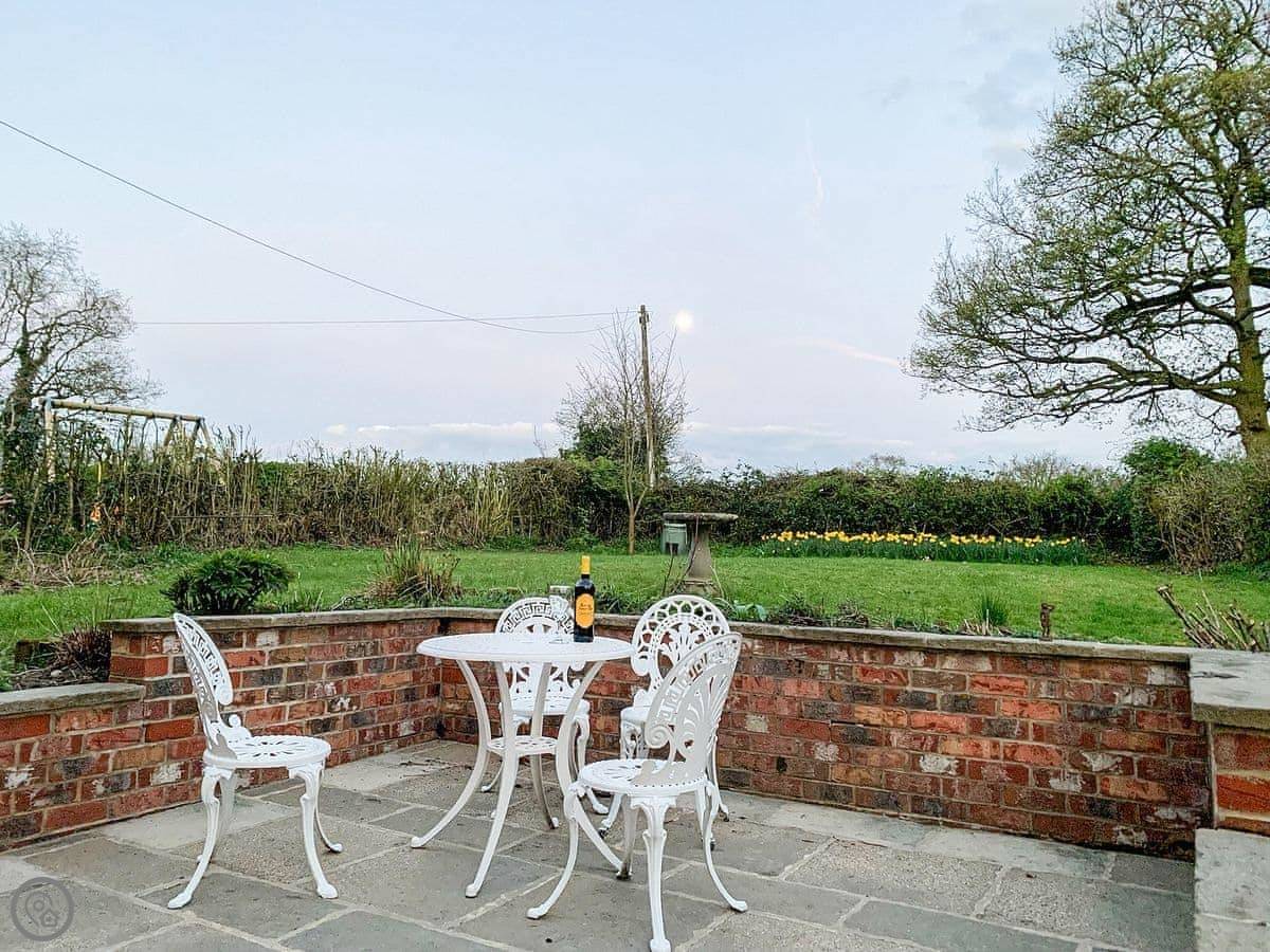 Outside, there's a garden with a lawn at the front and a courtyard at the back. The view from the back is over the fields, which is nice.