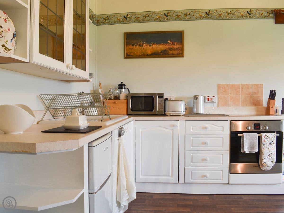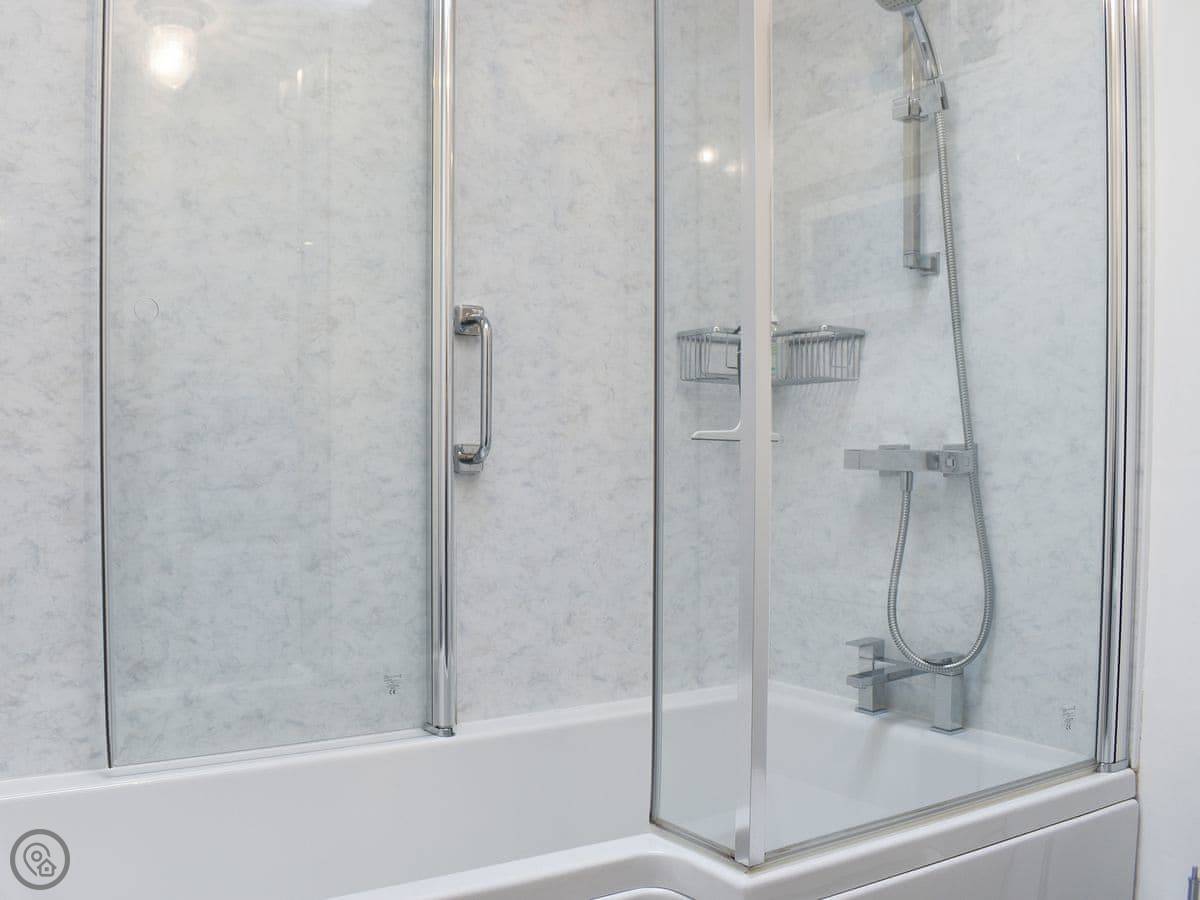 The kitchen has what you need to cook a meal. The bathroom has a bath with a shower over it. There's parking on the drive and an electric vehicle charger.