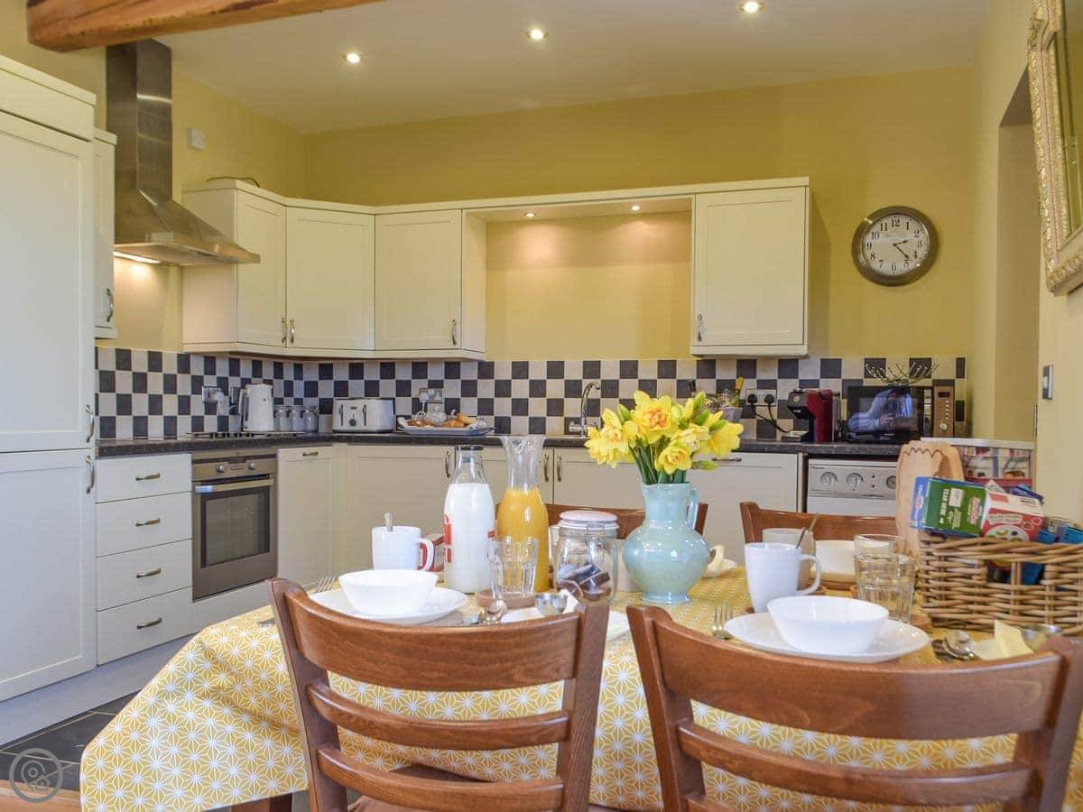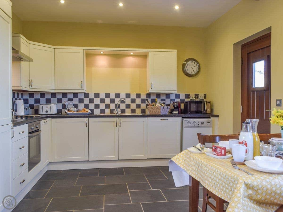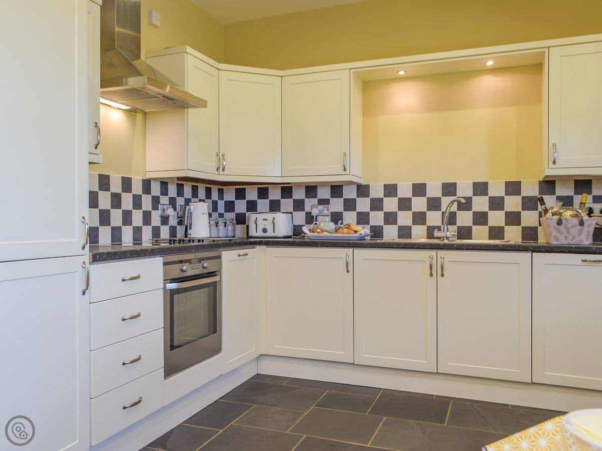 Inside, it’s open plan. Kitchen, living area, and dining space all in one room. There’s a TV, WiFi, a dishwasher and washing machine. The garden is enclosed.