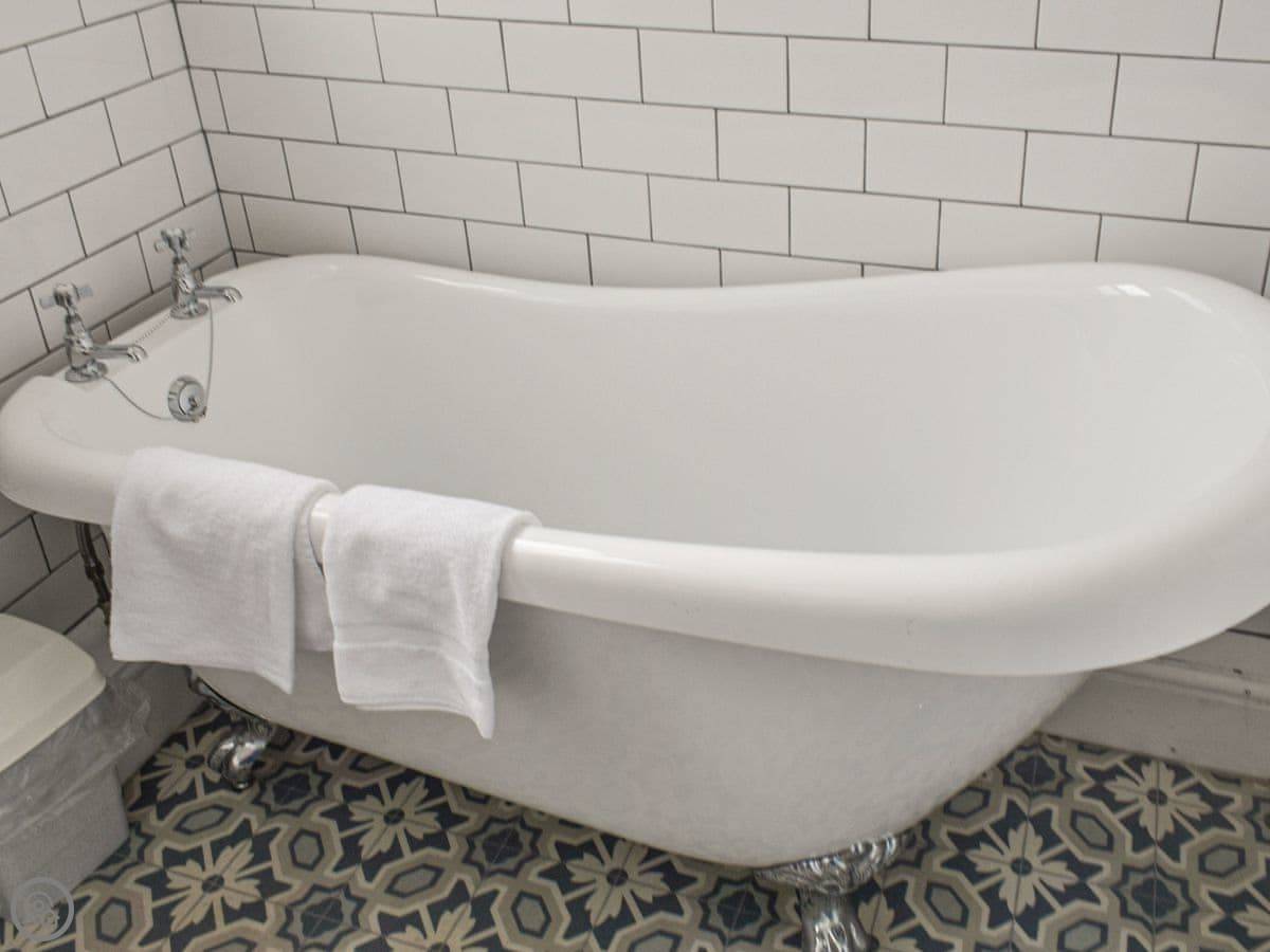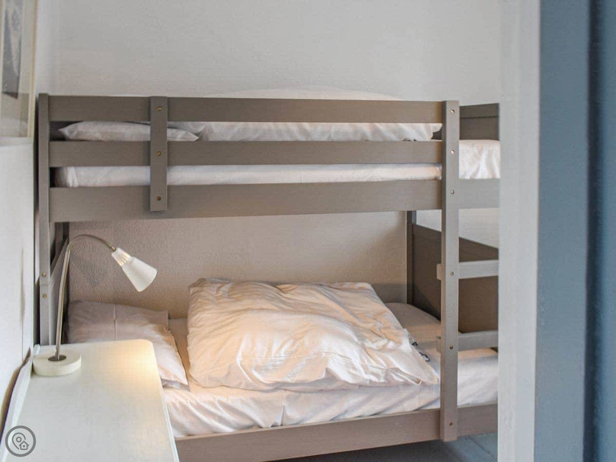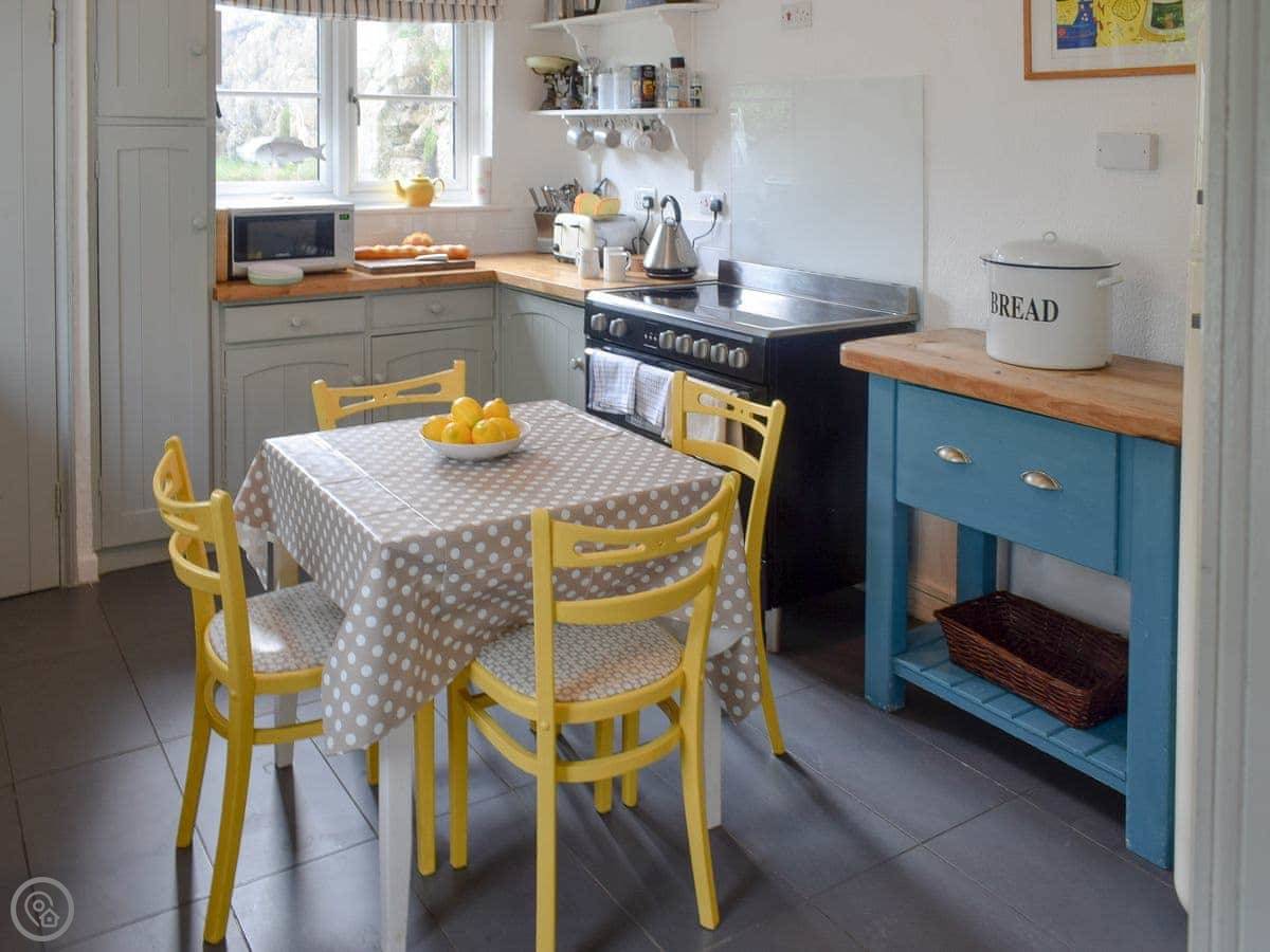 It sleeps eight. Four bedrooms, two bathrooms. It's got a 4 Star rating. It's been renovated, so it's not draughty or anything. The floors are painted wood downstairs and there's a stone floor in the kitchen. The living room has an old granite fireplace.