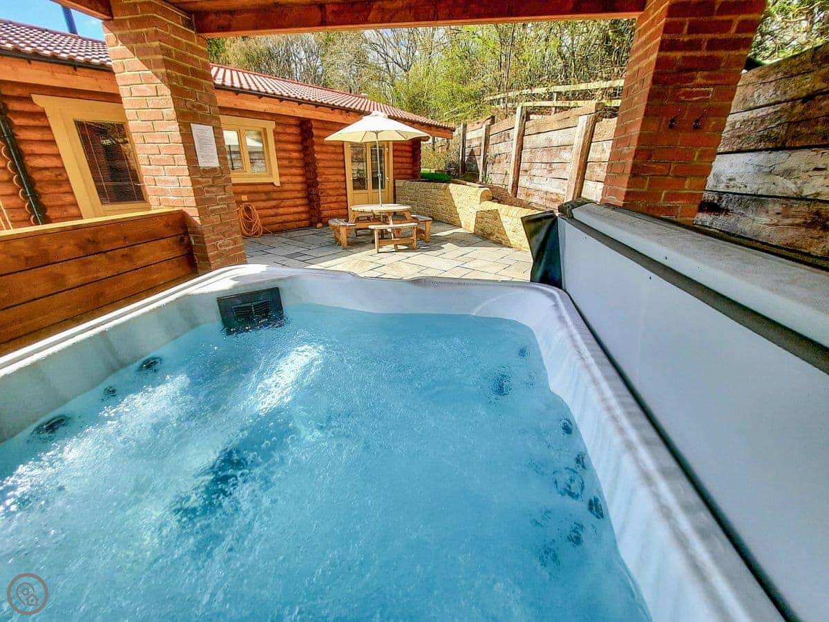 The hot tub is on a private deck off the bedroom. The stairs to get up to the lodge deck are external and quite steep. There's also a shared small bar and TV area on site for guests.