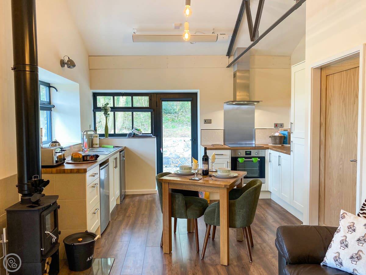 You've got one bedroom and one bathroom with a walk-in shower. It's all on the ground floor. There's an open plan living area with a wood burner. The rating is 5 Star, which means it's well-finished and everything is new.