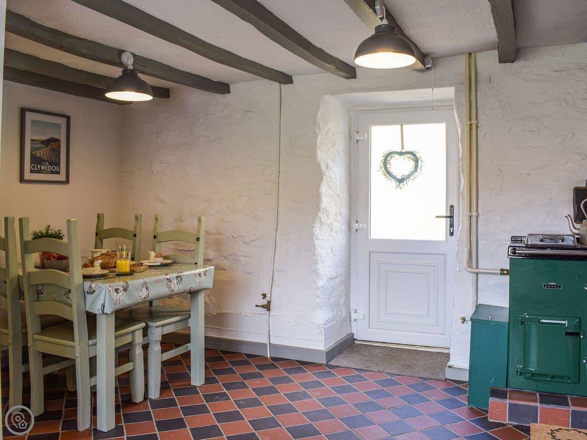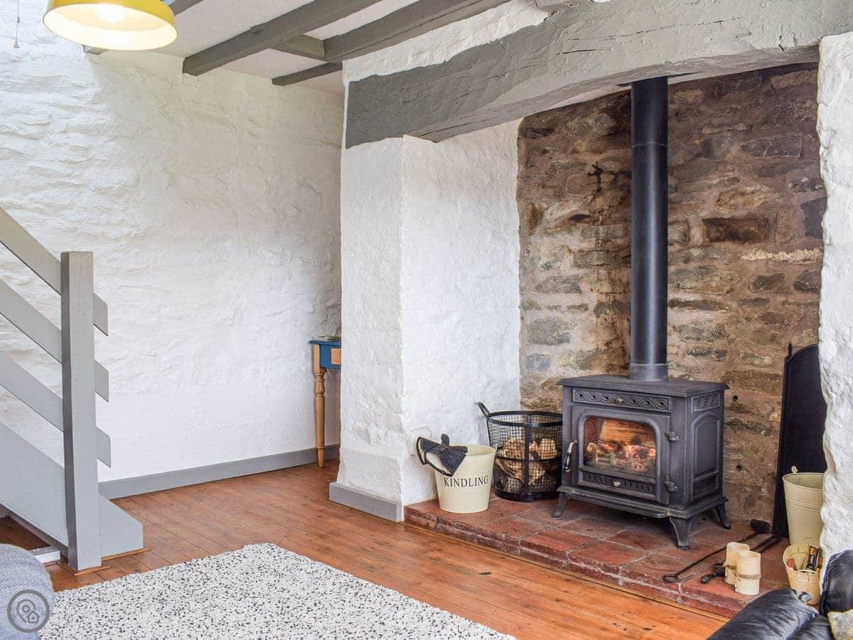 The thick stone walls keep it cool in summer. In winter, the Rayburn heats the kitchen and the hot water. There's a wood burner in the living room too. It's warm enough.