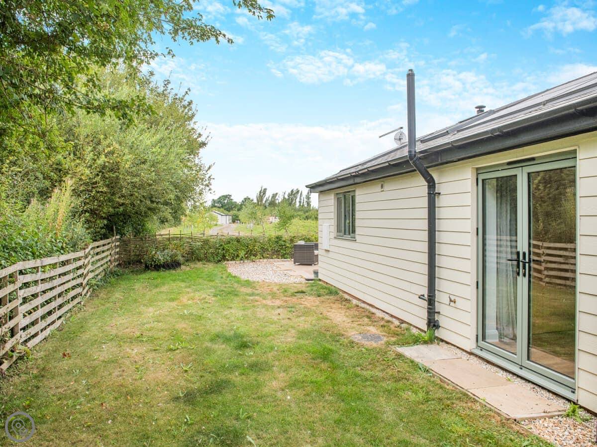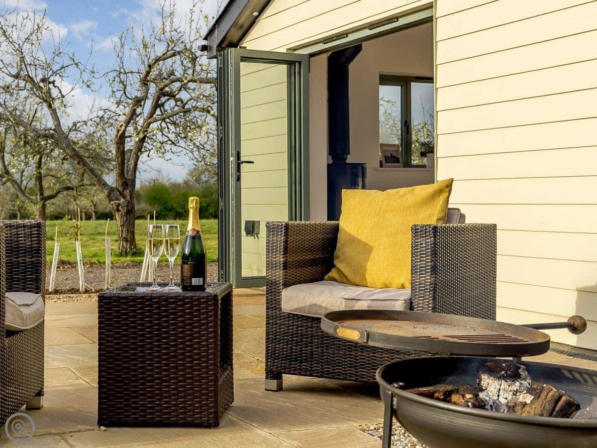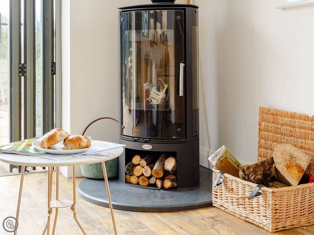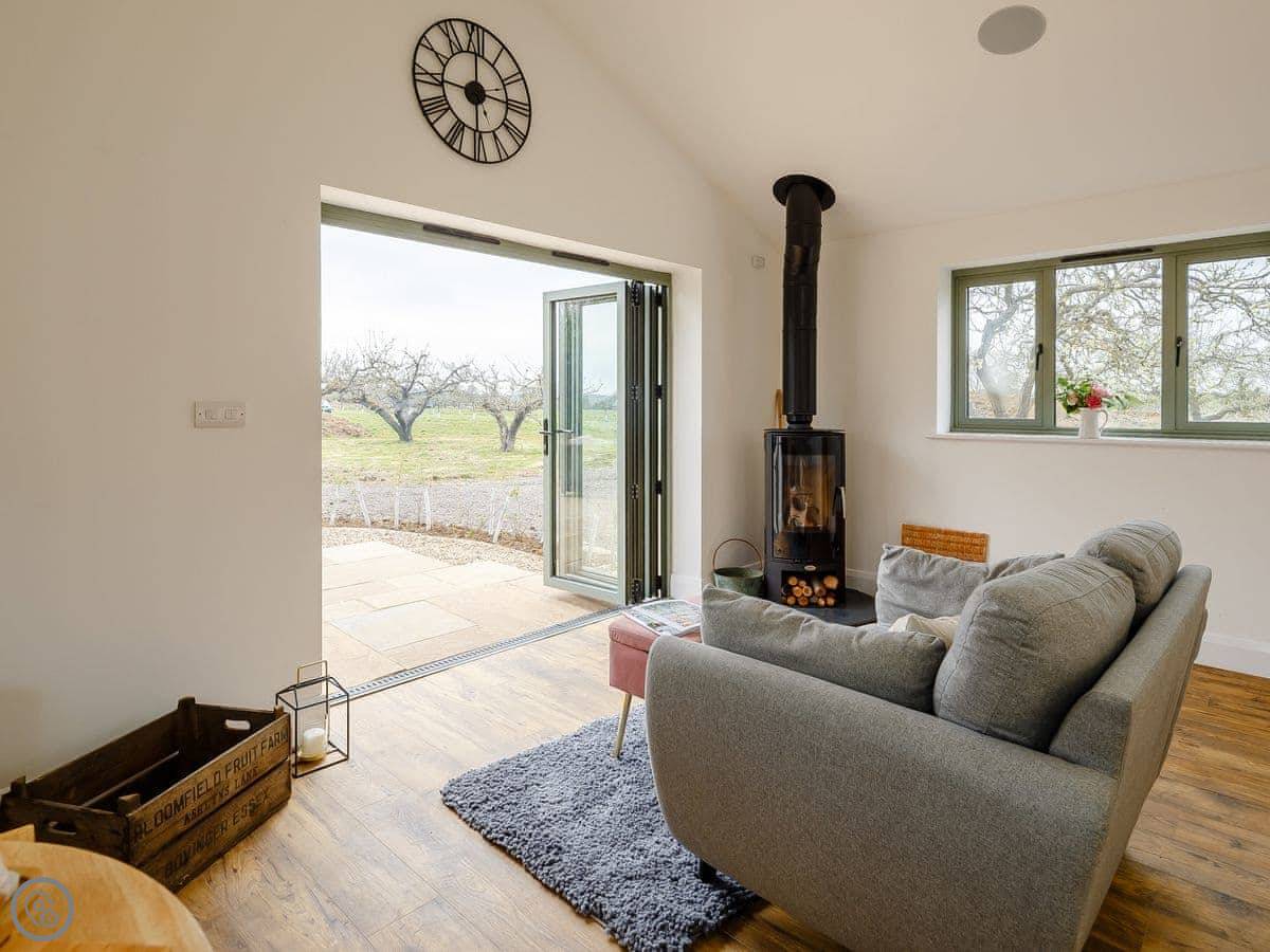 The living area is all open-plan. Big bi-fold doors open onto a private patio. There's a fire pit out there for the evenings. Inside, there's a wood burner for cooler days. Everything's on one level and the doorways are wide, so it's fine for wheelchair access.