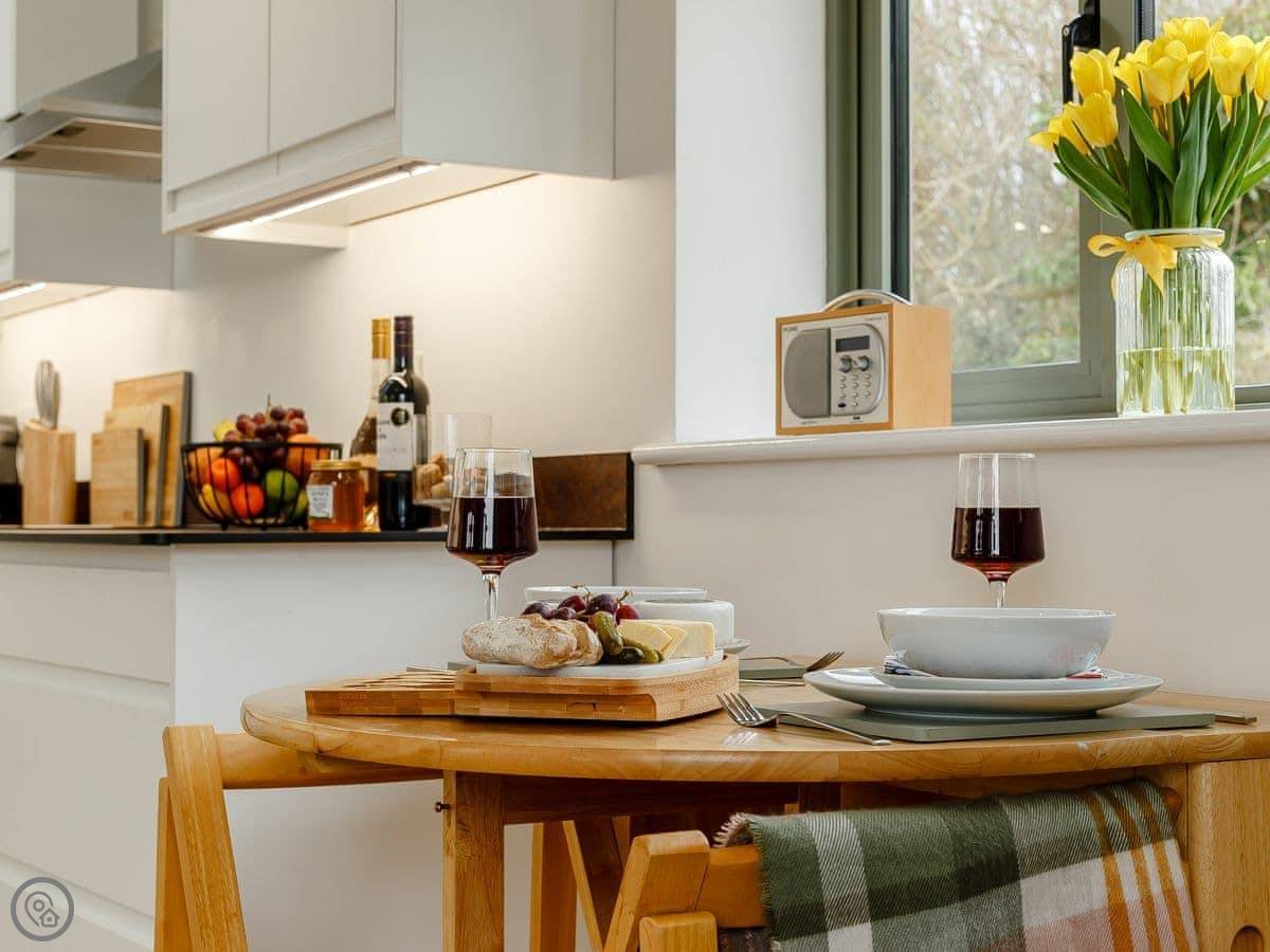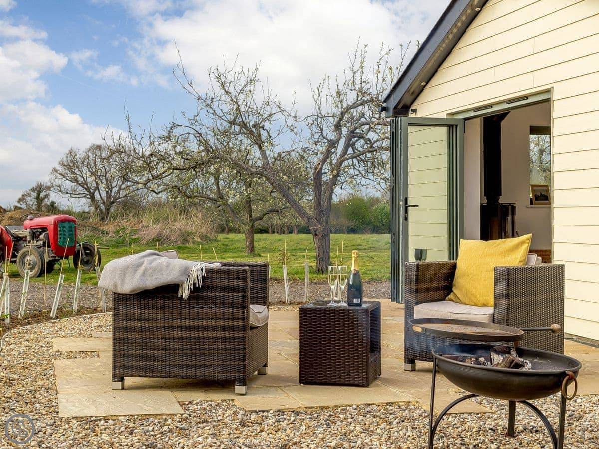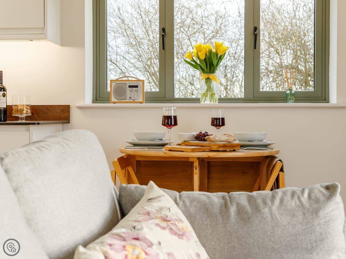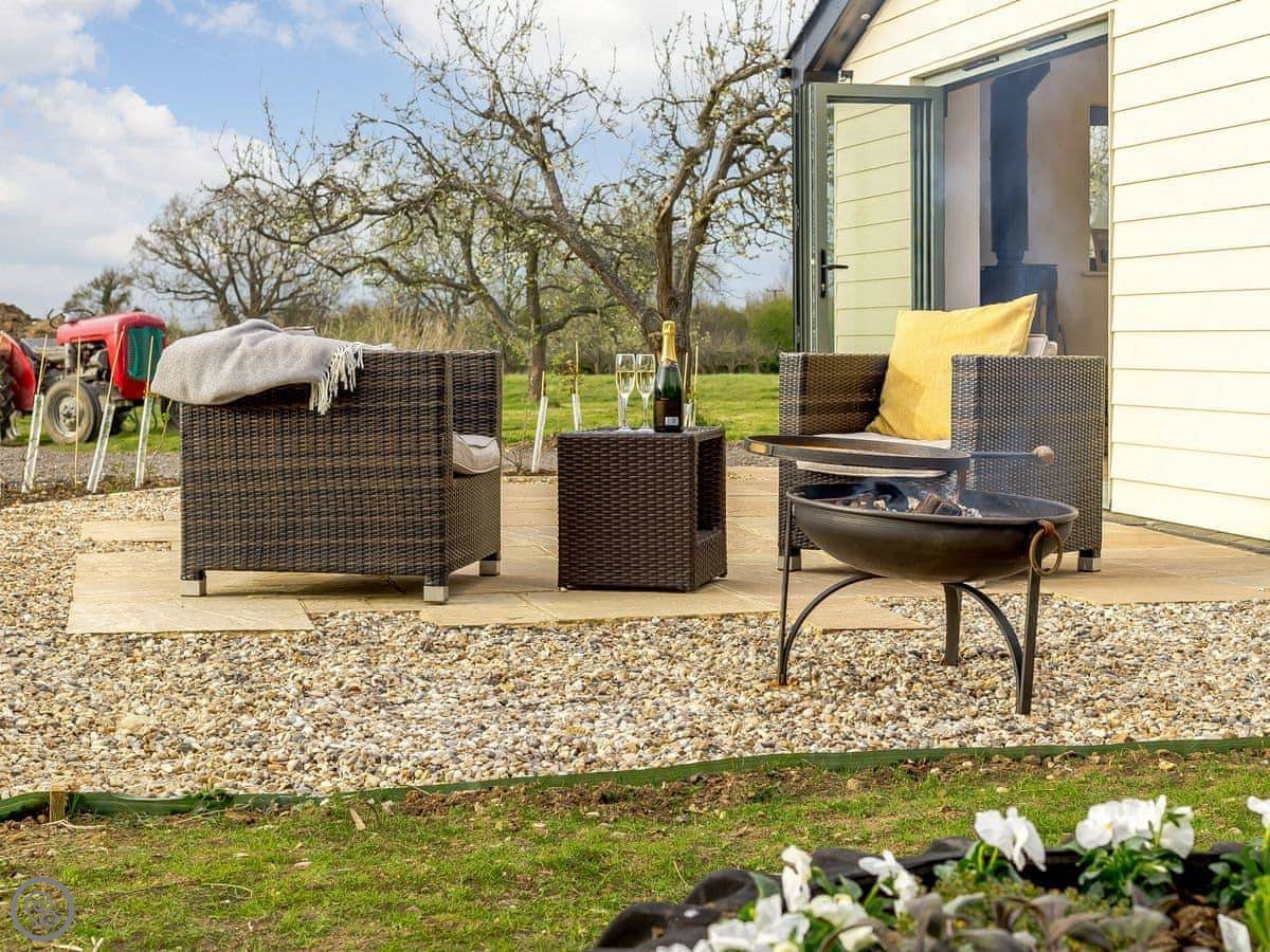 The living area is all open-plan. Big bi-fold doors open onto a private patio. There's a fire pit out there for the evenings. Inside, there's a wood burner for cooler days. Everything's on one level and the doorways are wide, so it's fine for wheelchair access.