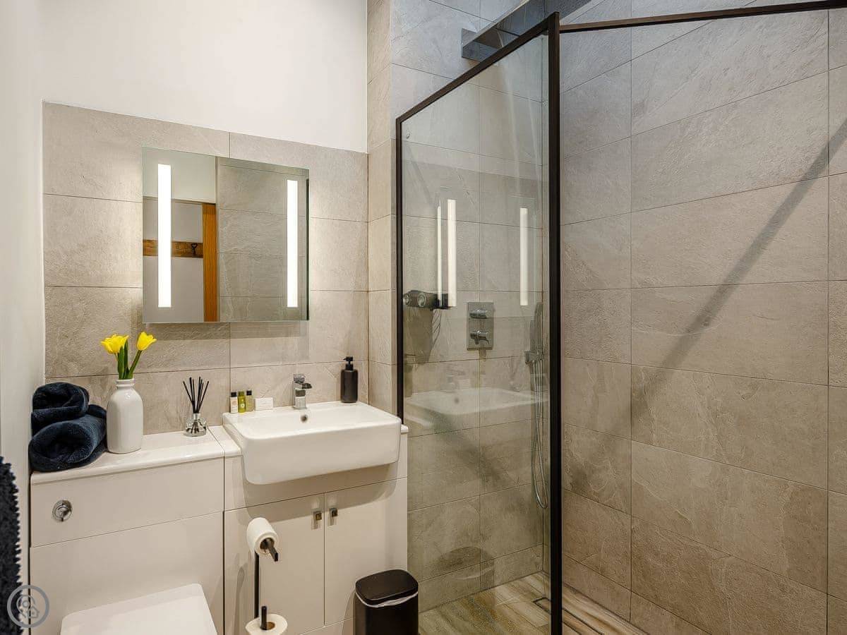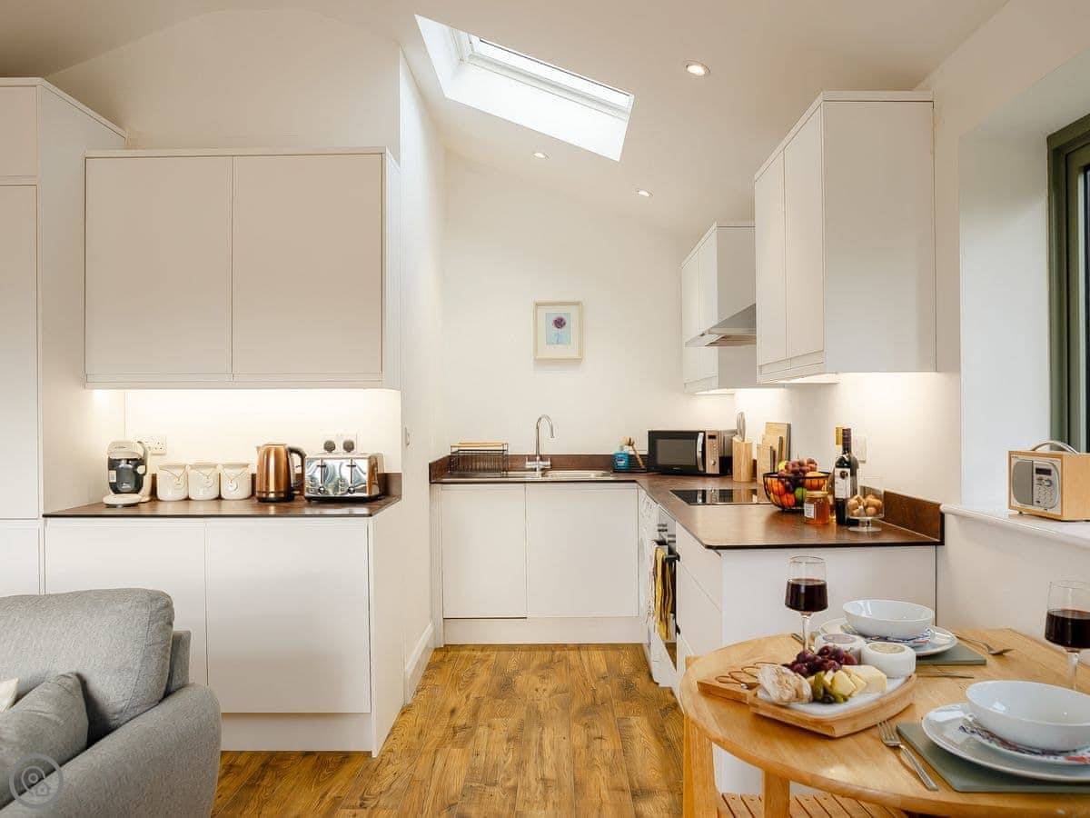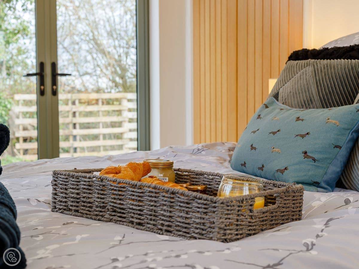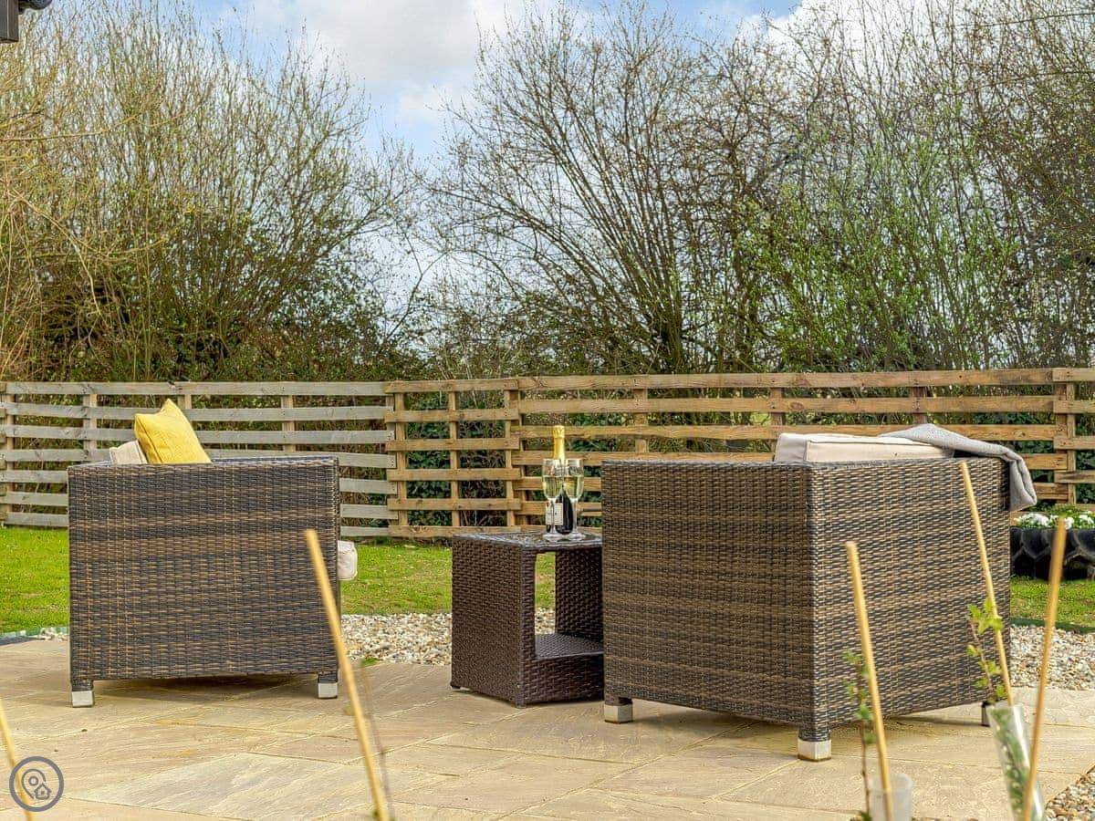 The living area is all open-plan. Big bi-fold doors open onto a private patio. There's a fire pit out there for the evenings. Inside, there's a wood burner for cooler days. Everything's on one level and the doorways are wide, so it's fine for wheelchair access.