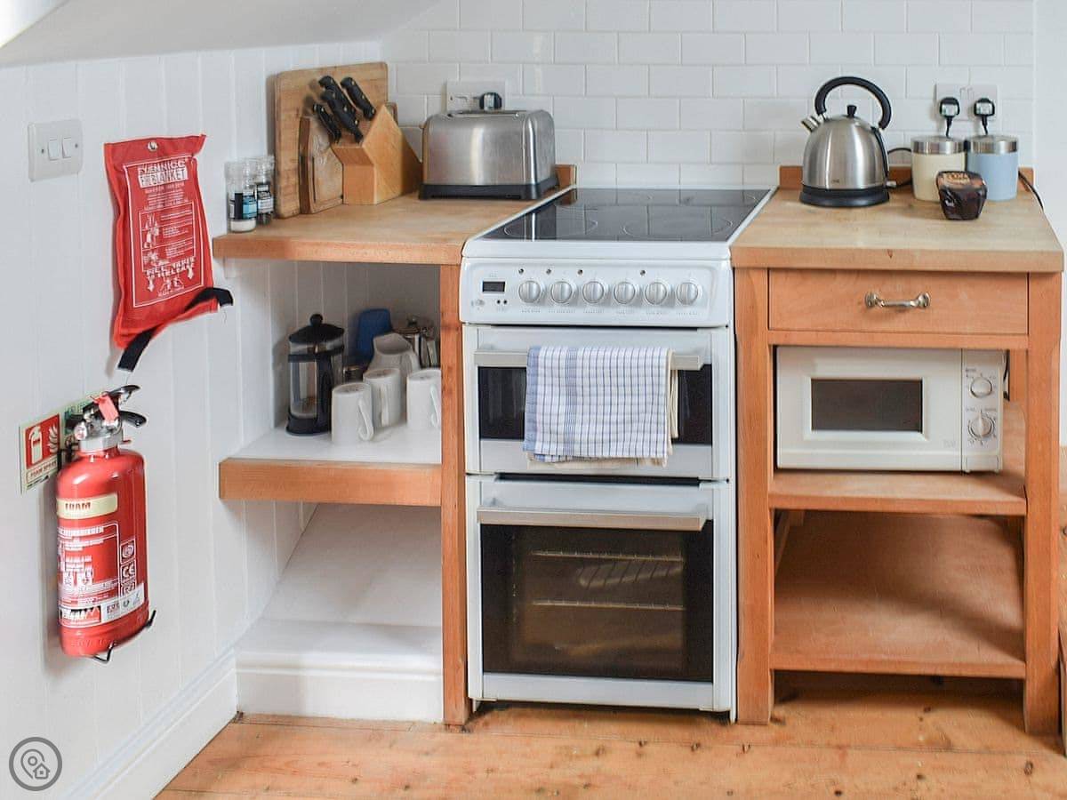 It's a 4 Star place. That means it's modern and well done inside. The space is open-plan, so the bed is at one end. The kitchen is small but has what you need. There's a wood burner for cooler evenings.