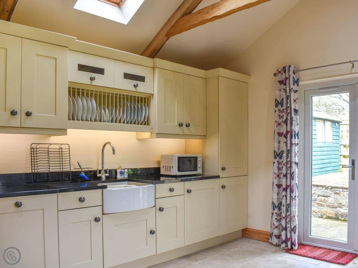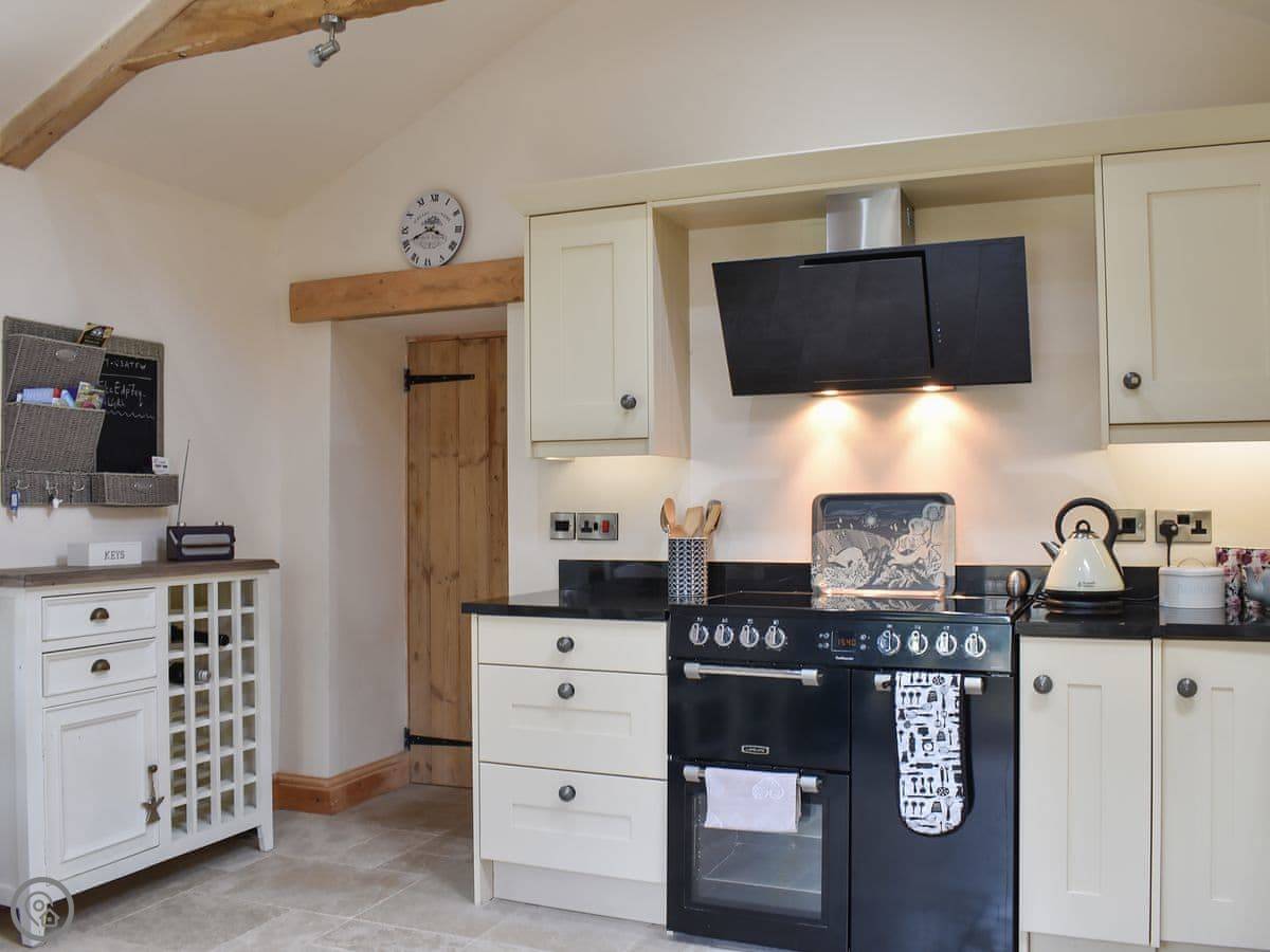 Inside, it's been done to a high standard. It's comfortable. The living room has a wood burning stove. The kitchen is bright with patio doors. It's a 5 Star place, which means it's well equipped and finished nicely.