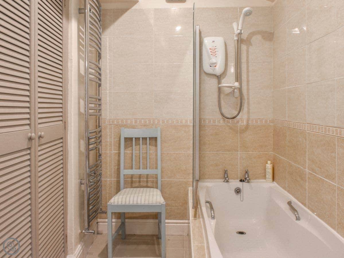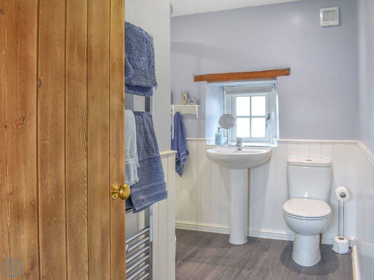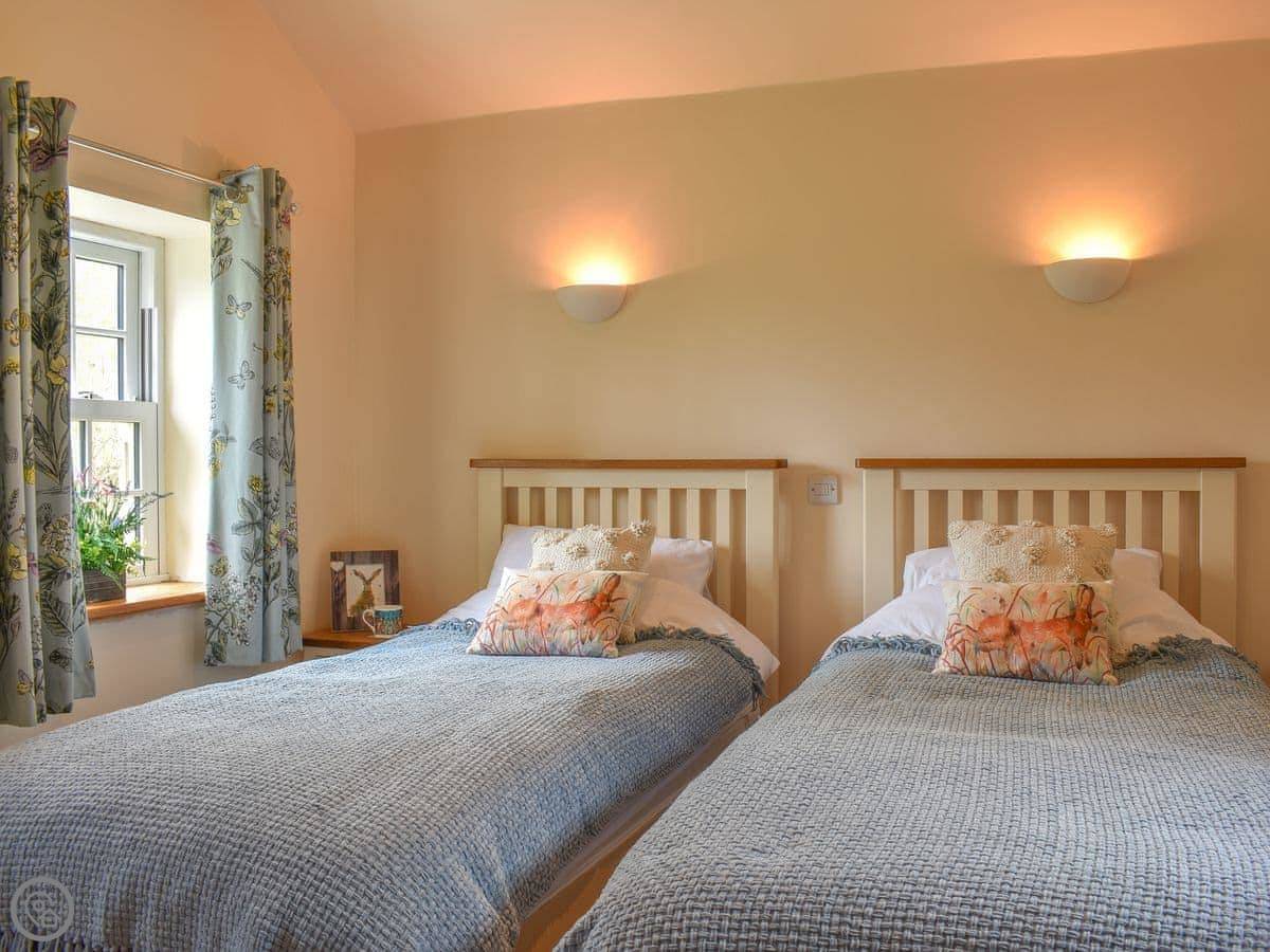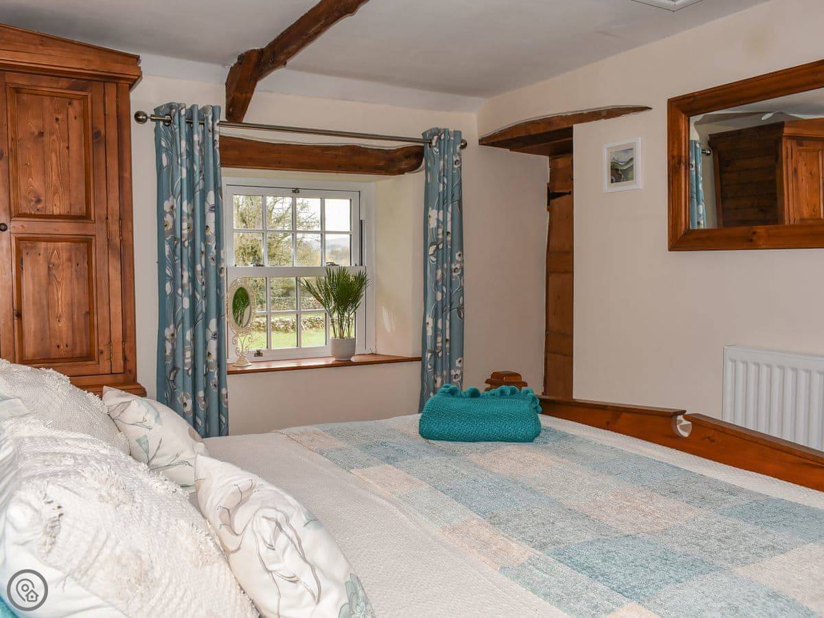 It sleeps four. Two bedrooms, two bathrooms, which is handy. One bedroom is downstairs with a door straight out to the garden, so it's level access. The other is upstairs with a kingsize bed. Both have beams.