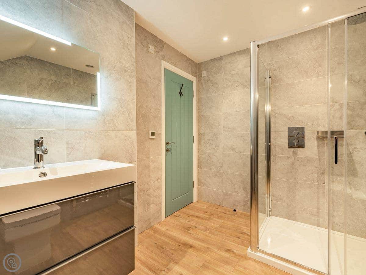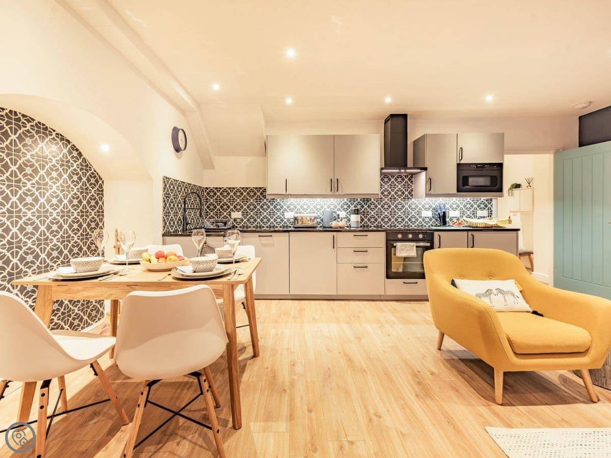 The apartment is open plan, so the kitchen, dining and living area are all together. The bathroom has a walk-in shower. Being lower ground floor, the ceilings are a bit lower than the floors above, but there's plenty of light from the doors to the courtyard.
