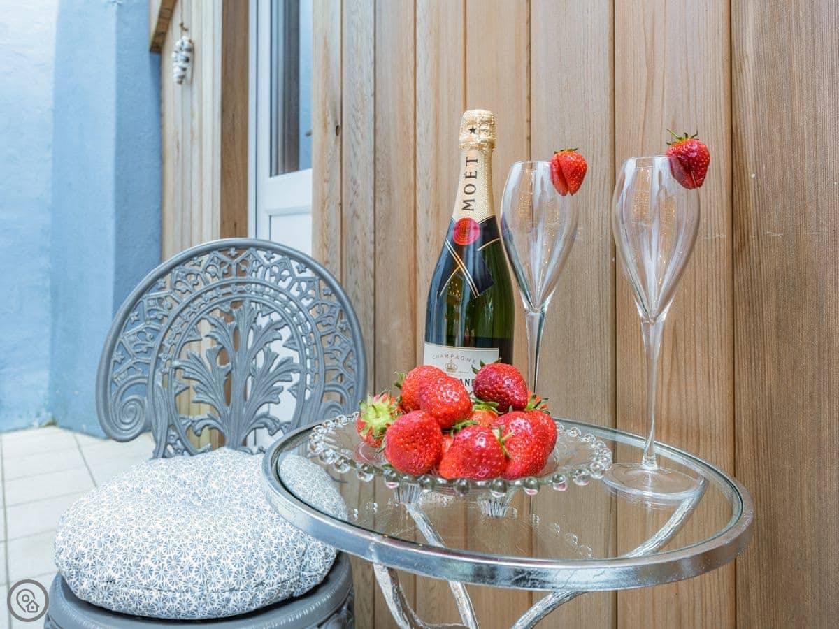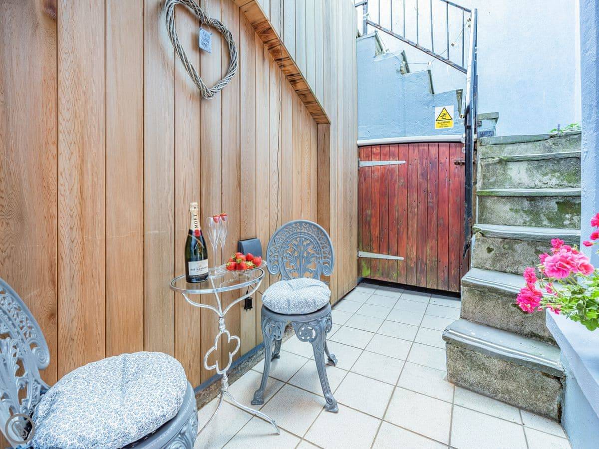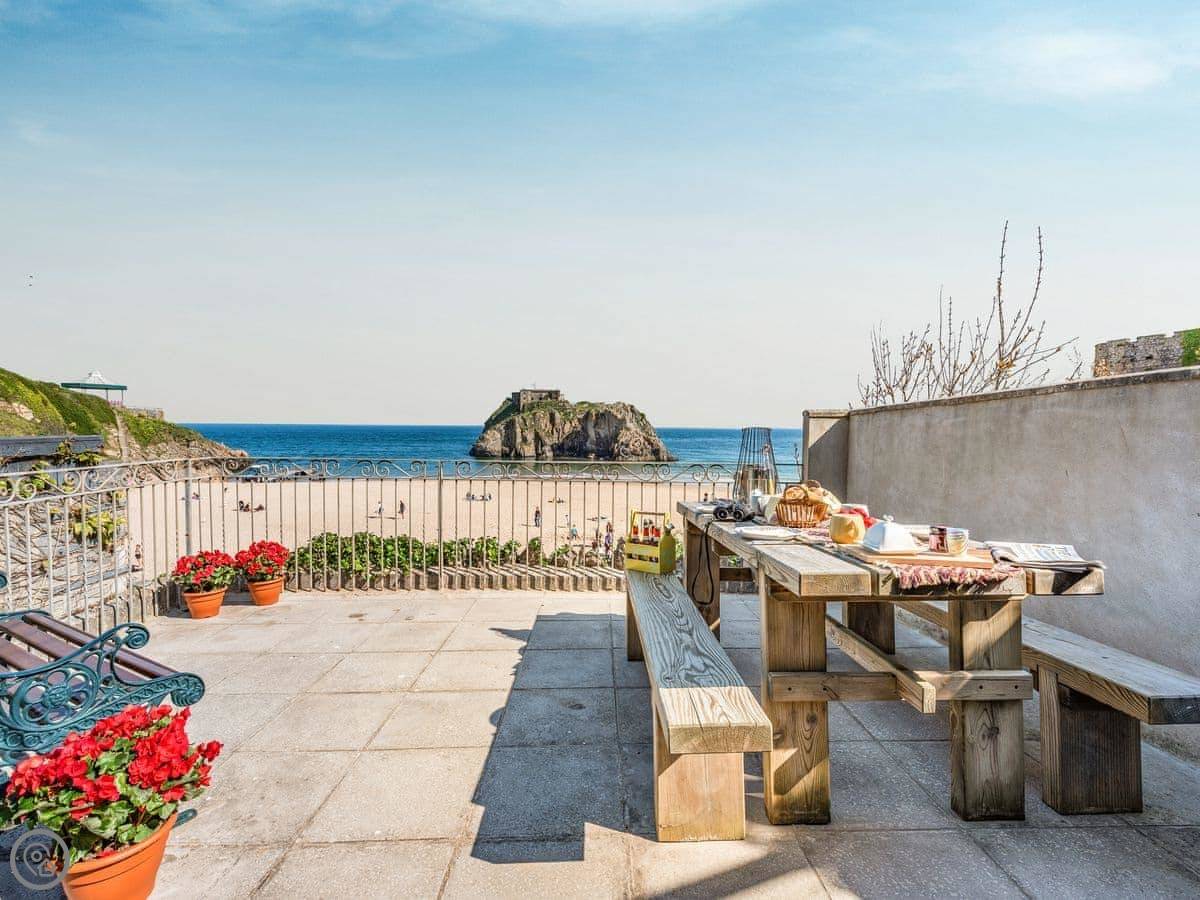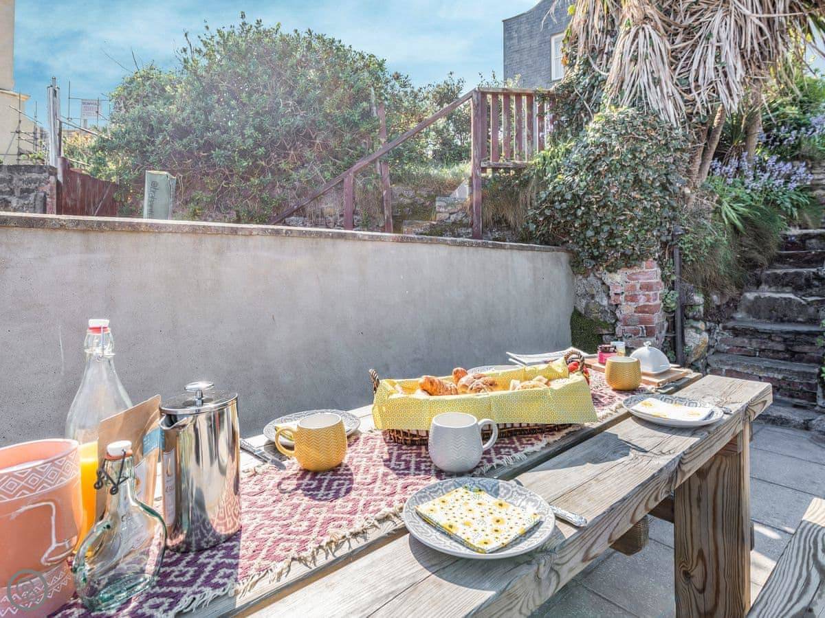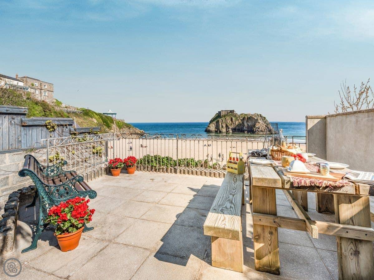 You can hear the sea from the garden. There's a small private courtyard off the living area, then steps up to the garden, which leads straight onto Castle Beach. The views are out over the water towards St Catherine's Island.