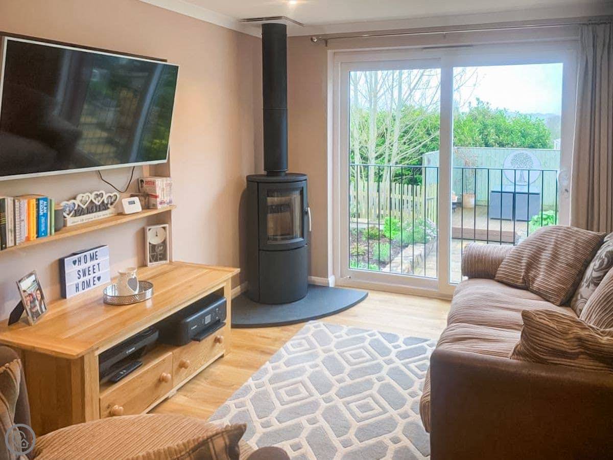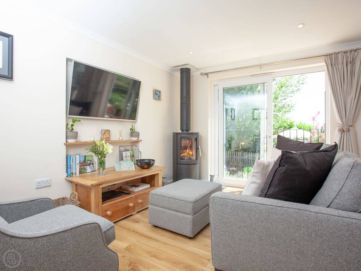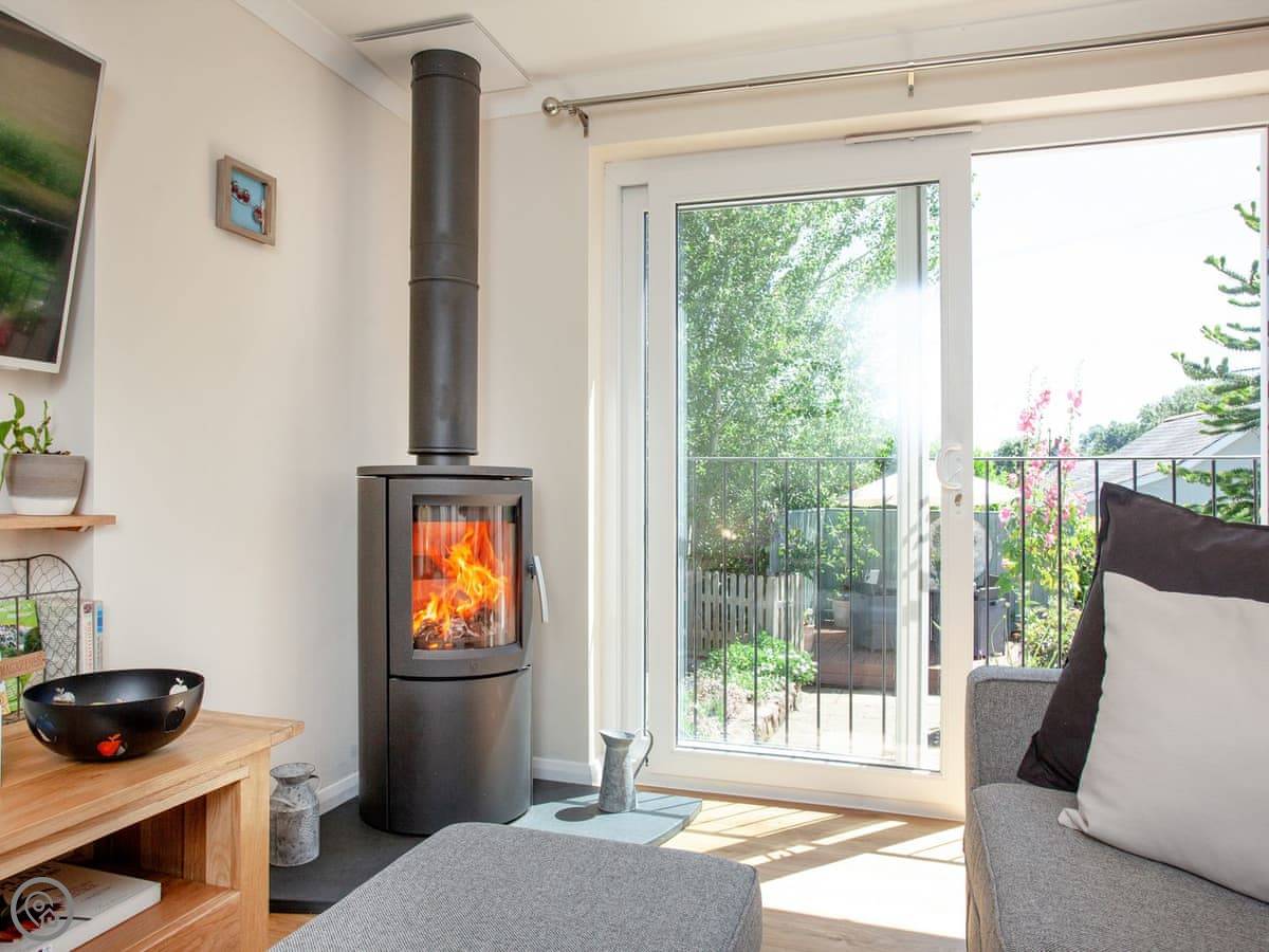 The living area is open plan. There's a wood burner, a smart TV, and big windows looking out over the garden and fields. One window has a small Juliet balcony you can open. The bedroom has a kingsize bed and another smart TV. The bathroom has a bath with a shower over it.