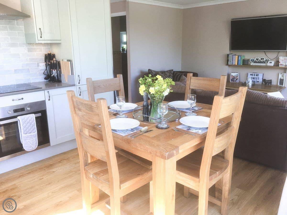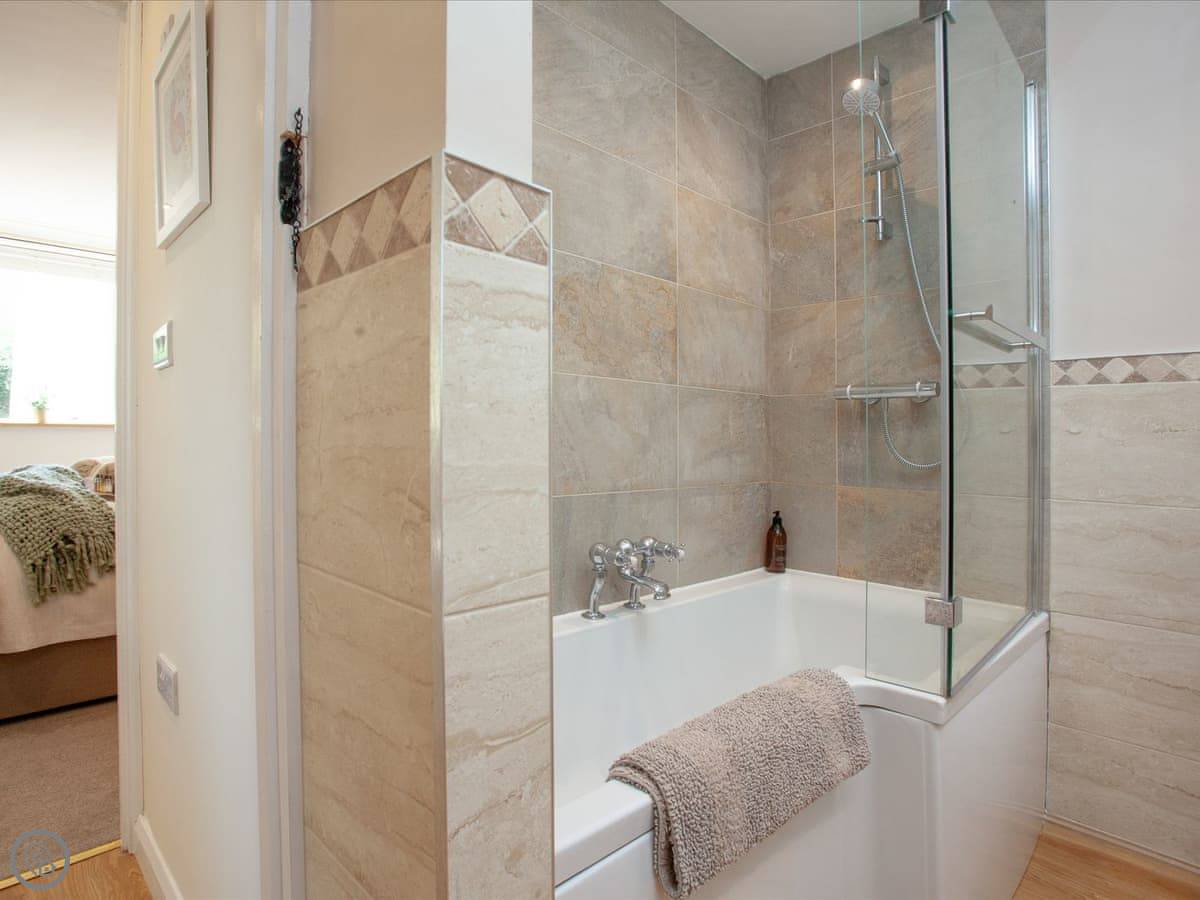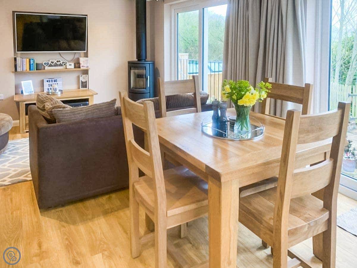 The living area is open plan. There's a wood burner, a smart TV, and big windows looking out over the garden and fields. One window has a small Juliet balcony you can open. The bedroom has a kingsize bed and another smart TV. The bathroom has a bath with a shower over it.