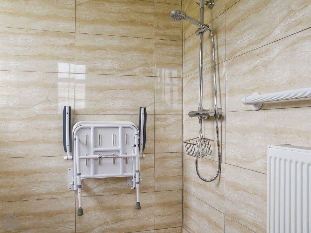 The front door is level, which is good if you have mobility issues, and there's a walk-in shower. Inside, it's open plan at the back: the living room and dining area are all one space. The kitchen is separate, through a doorway. It leads out to the garden.