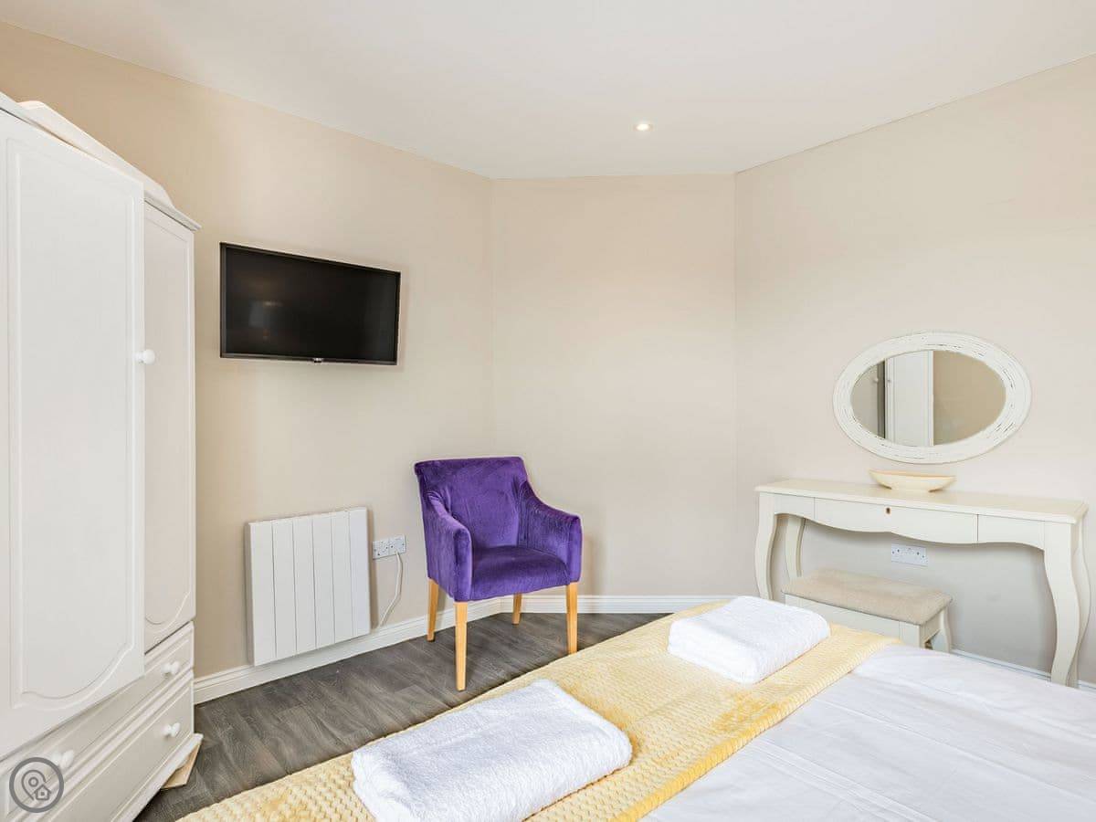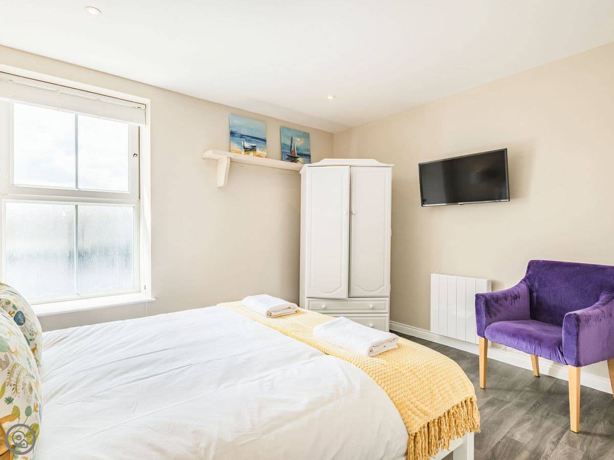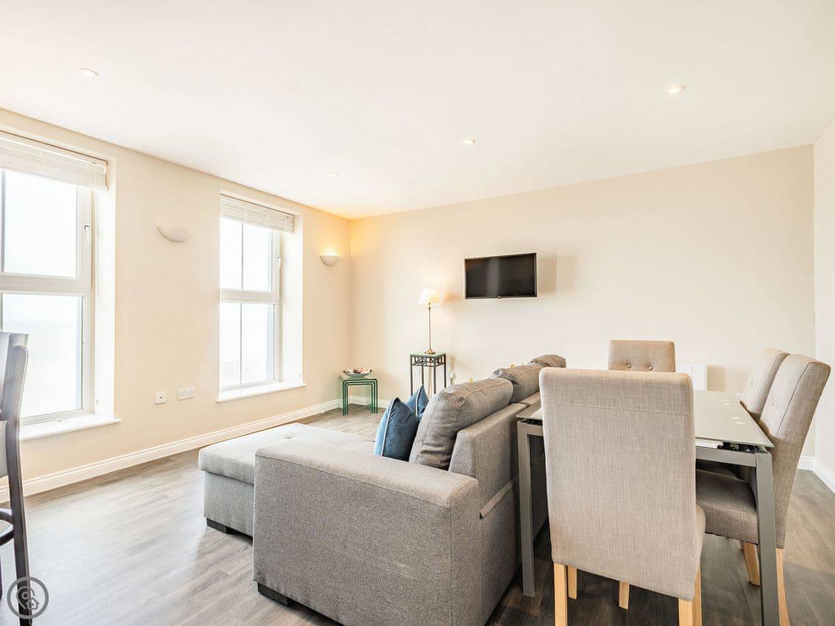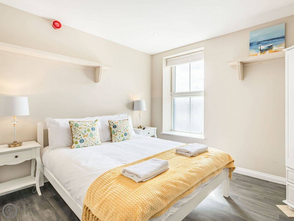 It sleeps four. Two bedrooms, one bathroom. It's got a 4 Star rating, so it's well looked after and comfortable. The building is on a hill, so the walk up from the town is a bit steep. Something to know.