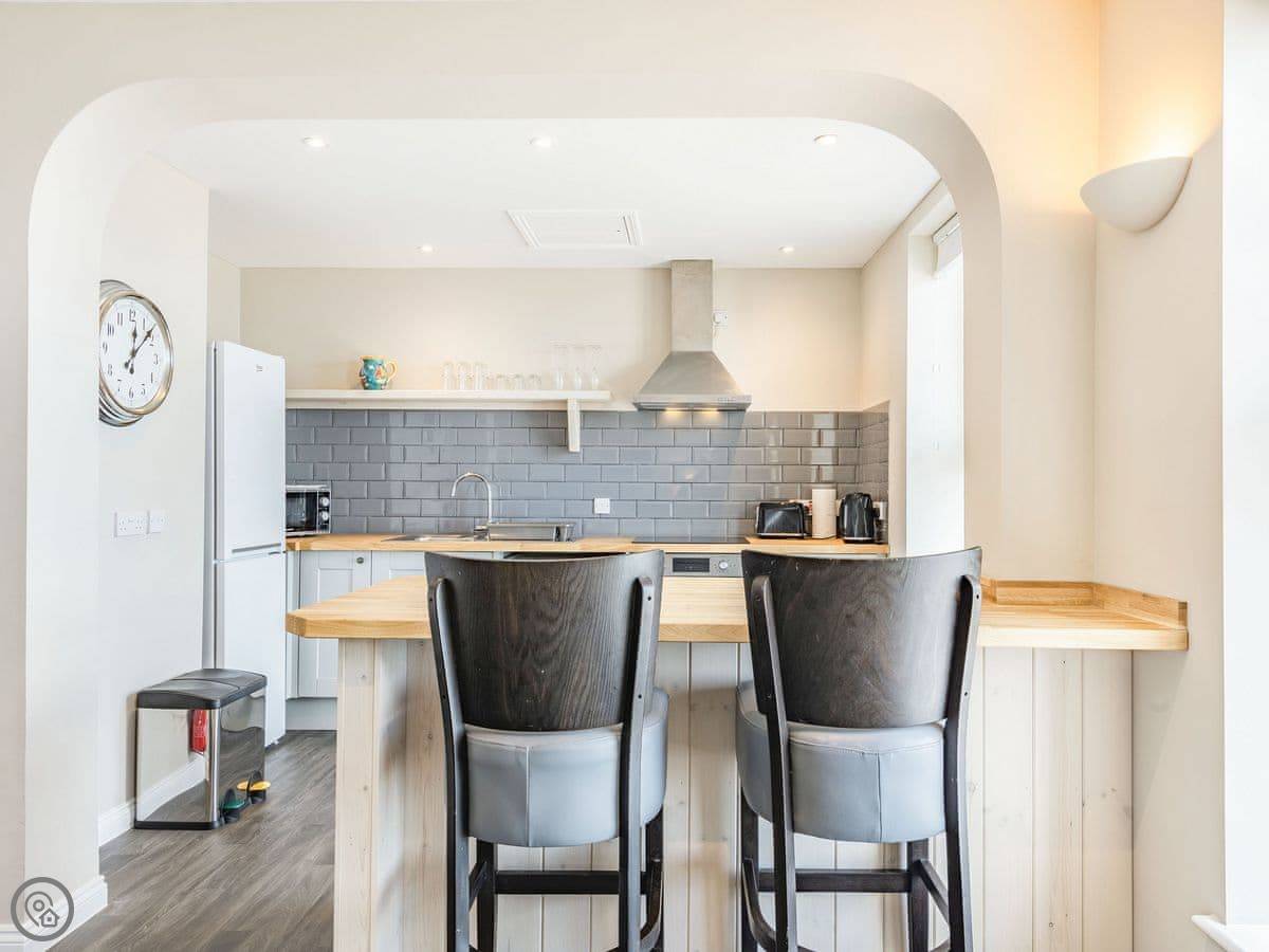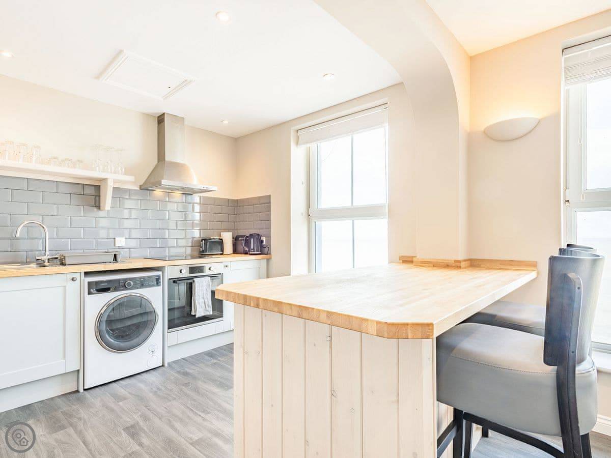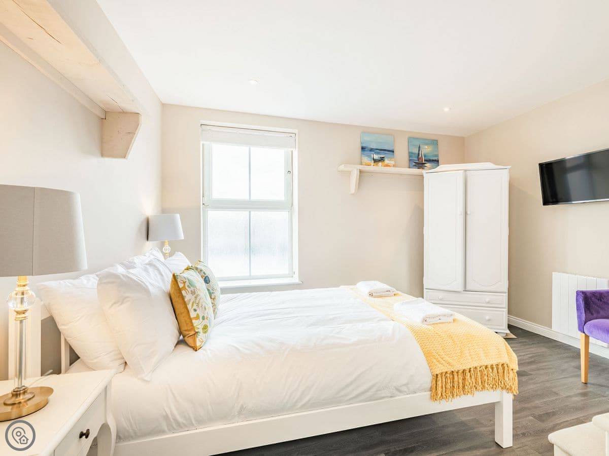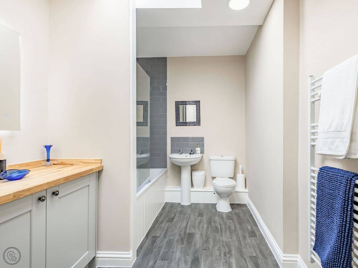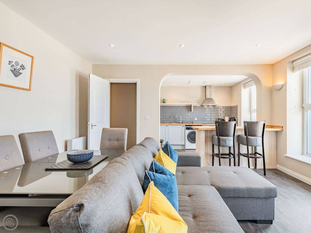 It sleeps four. Two bedrooms, one bathroom. It's got a 4 Star rating, so it's well looked after and comfortable. The building is on a hill, so the walk up from the town is a bit steep. Something to know.