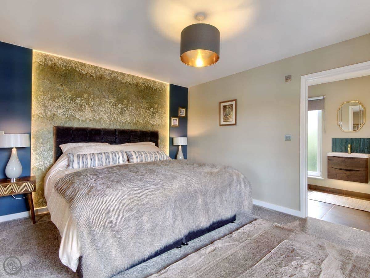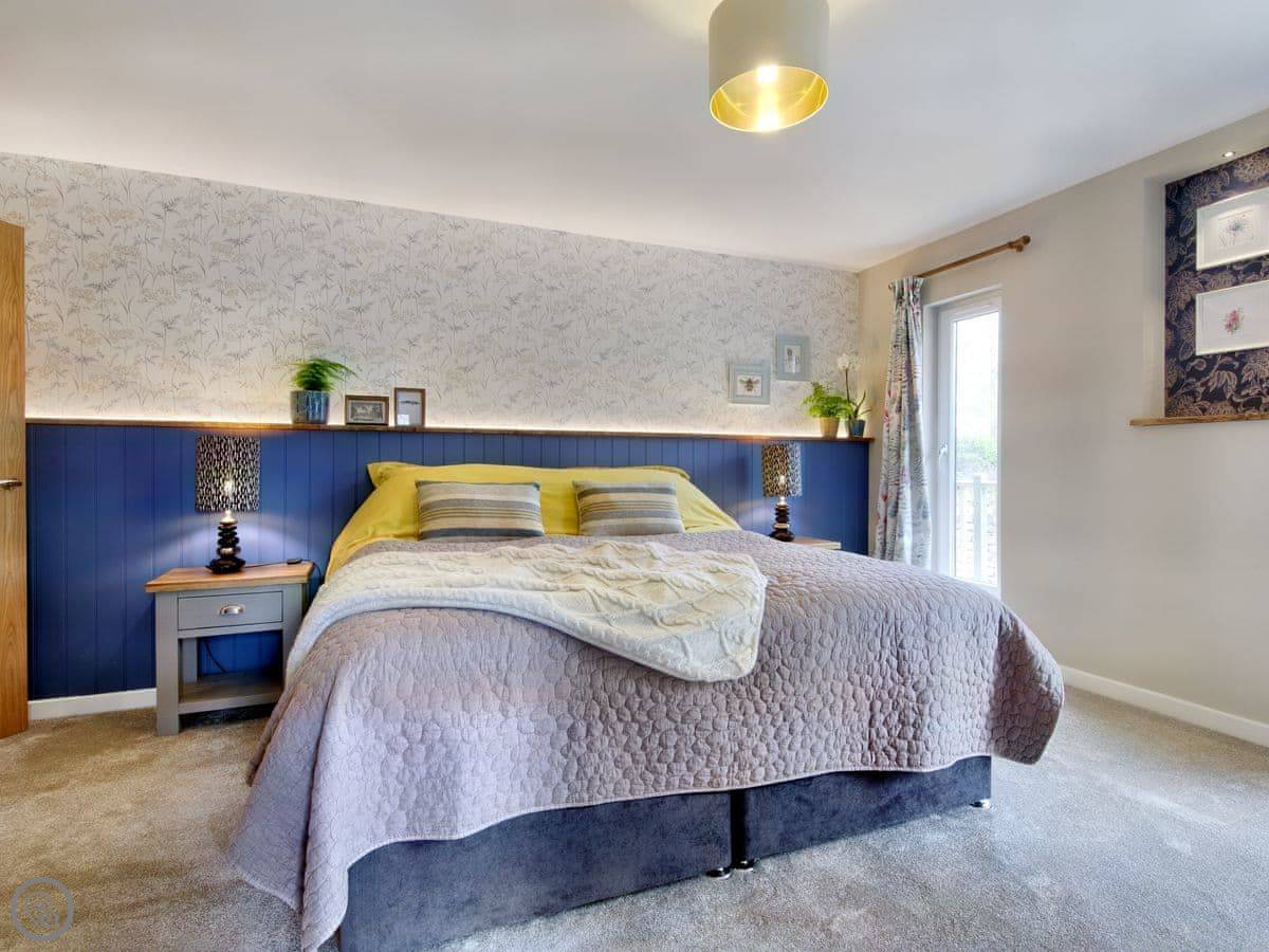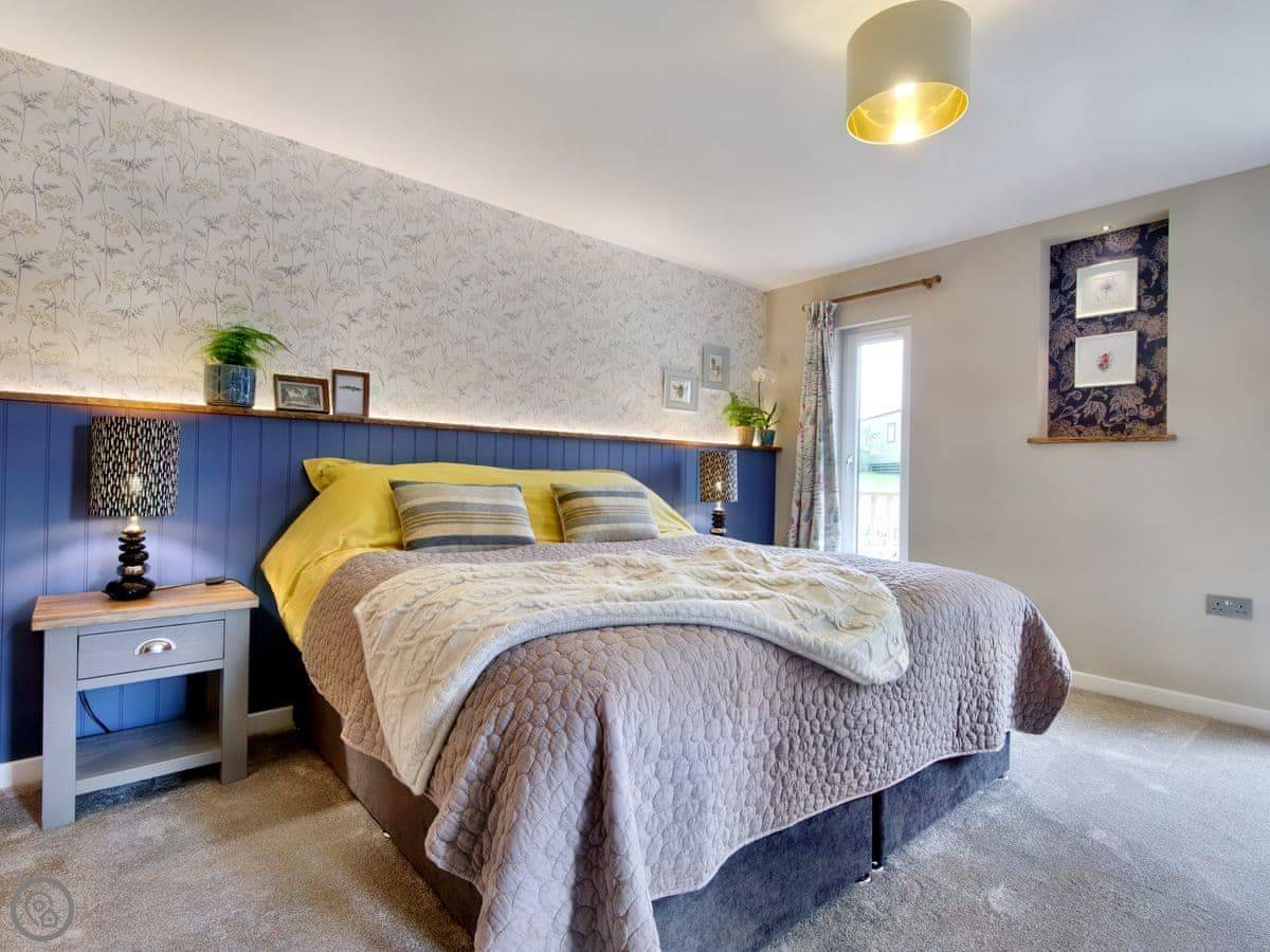 It sleeps four. Two bedrooms and each has its own bathroom, which is handy. It’s got a 4 star rating. There’s underfloor heating, and a wood burner for the evenings. The garden is enclosed, so it's fine for kids. You can park right by the door.