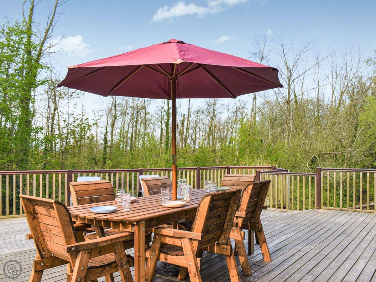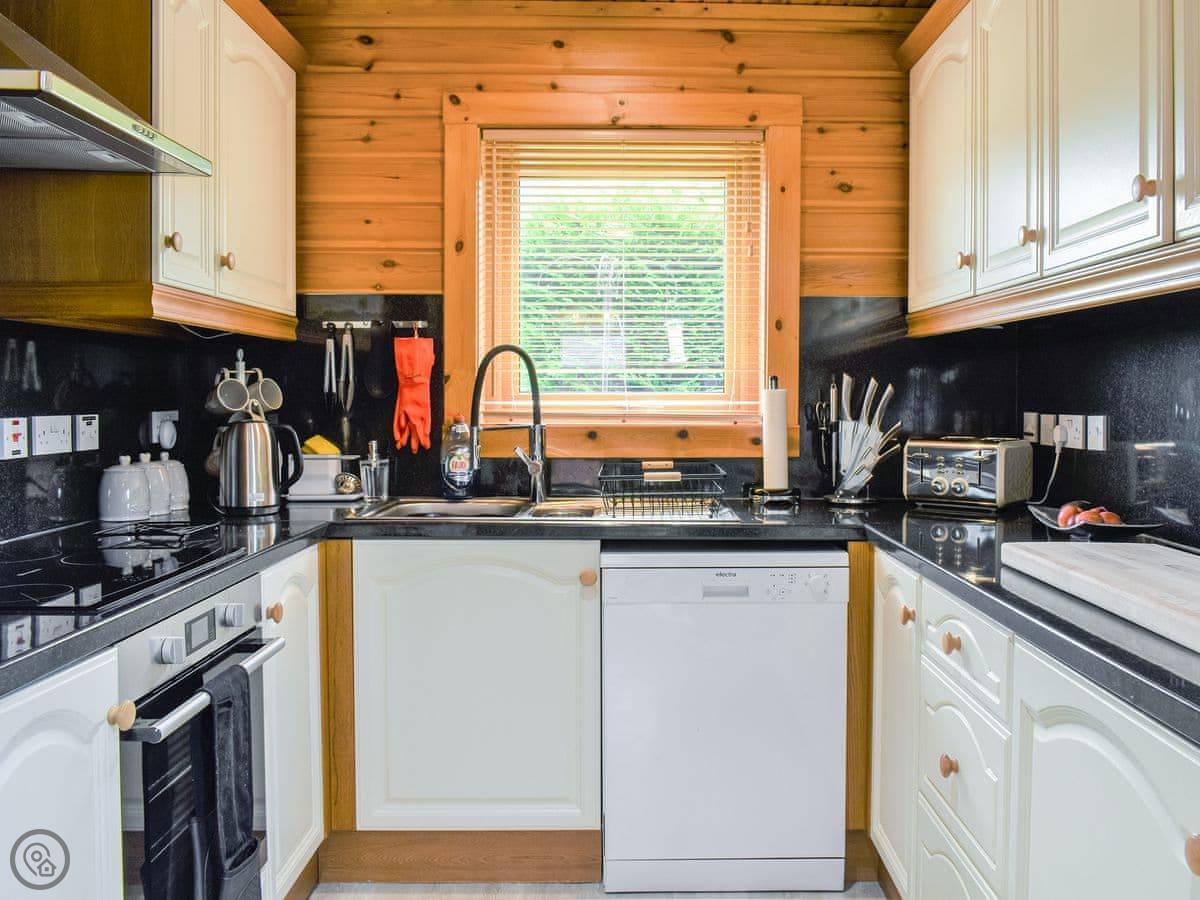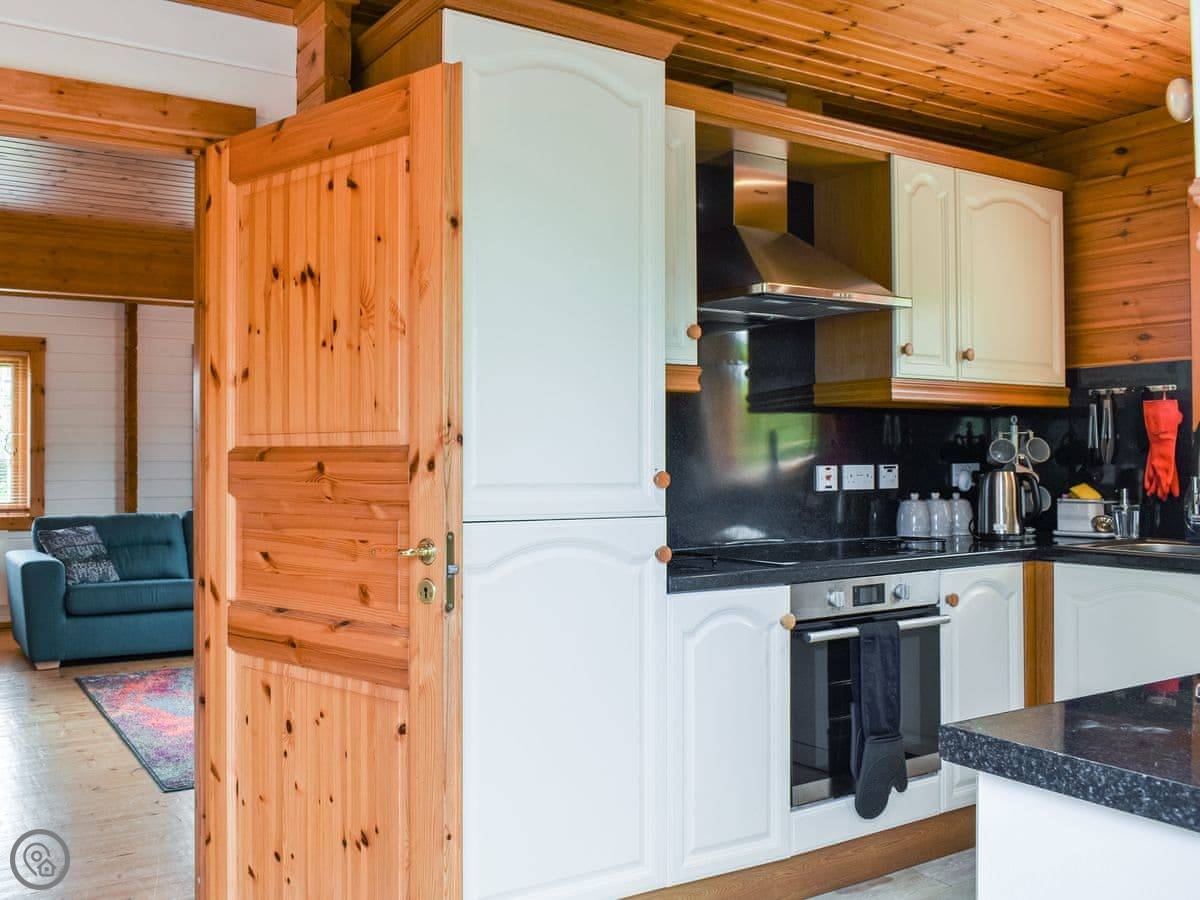 There's a wood burning stove in the living room. It heats the place up well. Kitchen has what you'd expect: oven, microwave, dishwasher, washing machine. There's a deck out the back with a table and chairs.